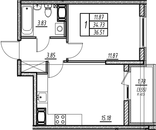 Общая площадь 36.51 м2