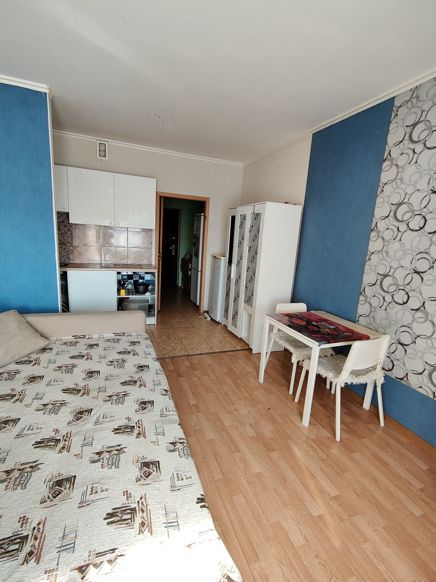 В продаже квартира-студия, общей площадью 24,9 кв.м.  Собственность (2014) Квартира светлая, тёплая, с большой остеклённой лоджией 4,6 кв.м. Окна-стеклопакеты, на полу-ламинат, в зоне кухни - плитка, плитка в санузле, на стенах светлые обои. Развитая инфраструктура. Детские сады, школа, поликлиника детская и взрослая. Фитнес-клуб, бассейн, Сбербанк, аптеки и ряд других магазинов. Рядом выезды на КАД. Комфортный спальный район.  Прямая продажа! На все интересующие вопросы отвечу по телефону!