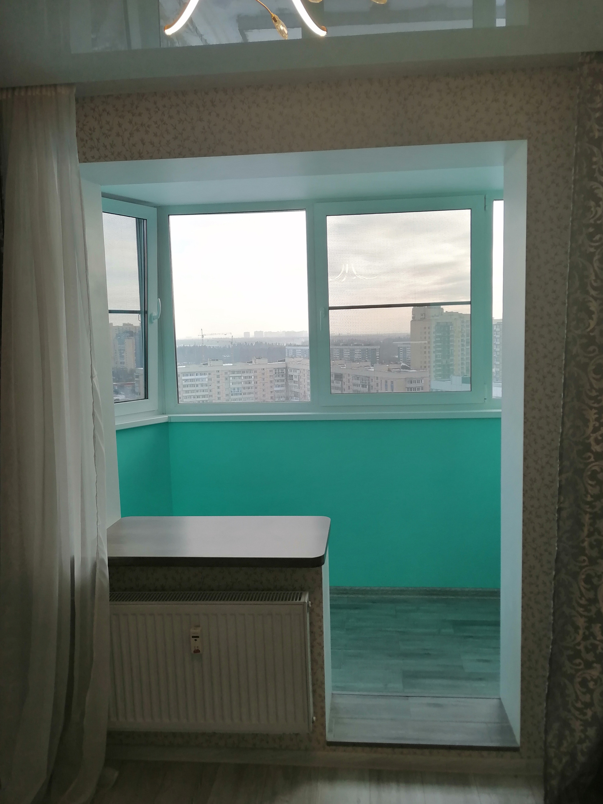 Лоджия утеплена, установлен `тёплый пол`.