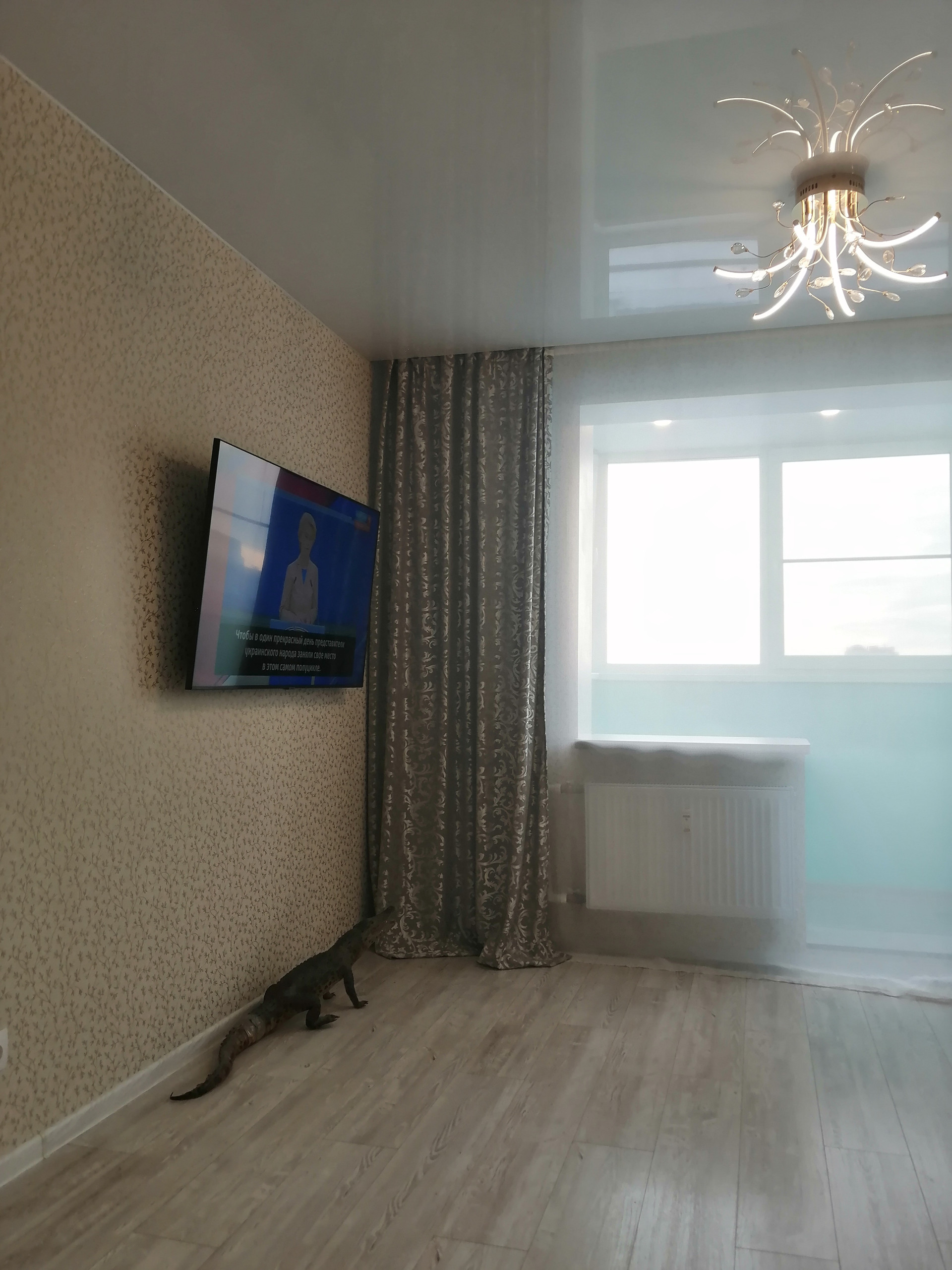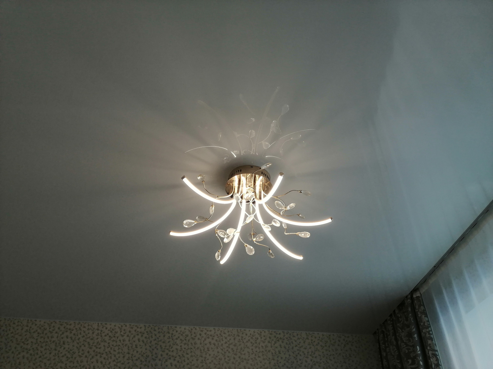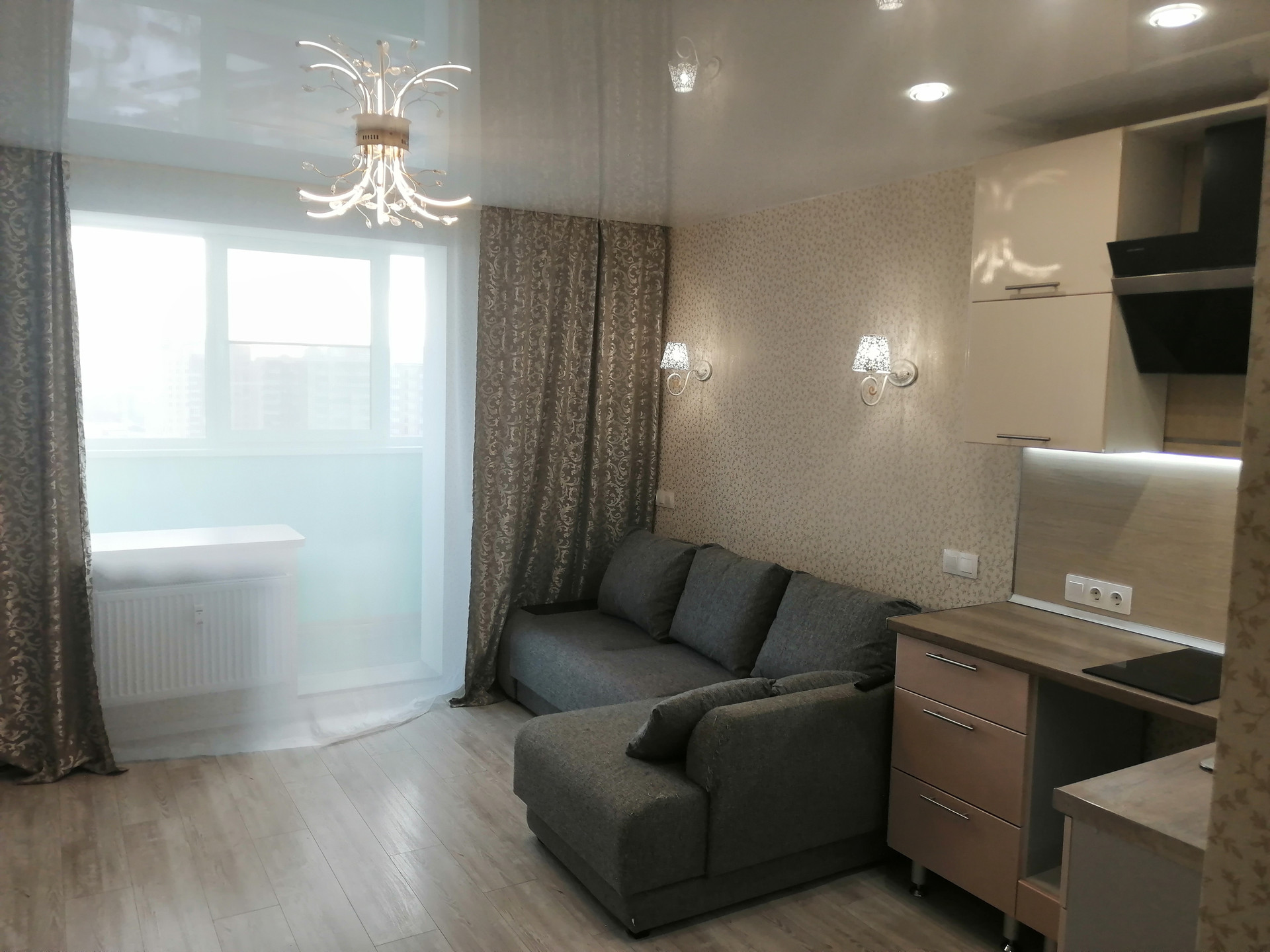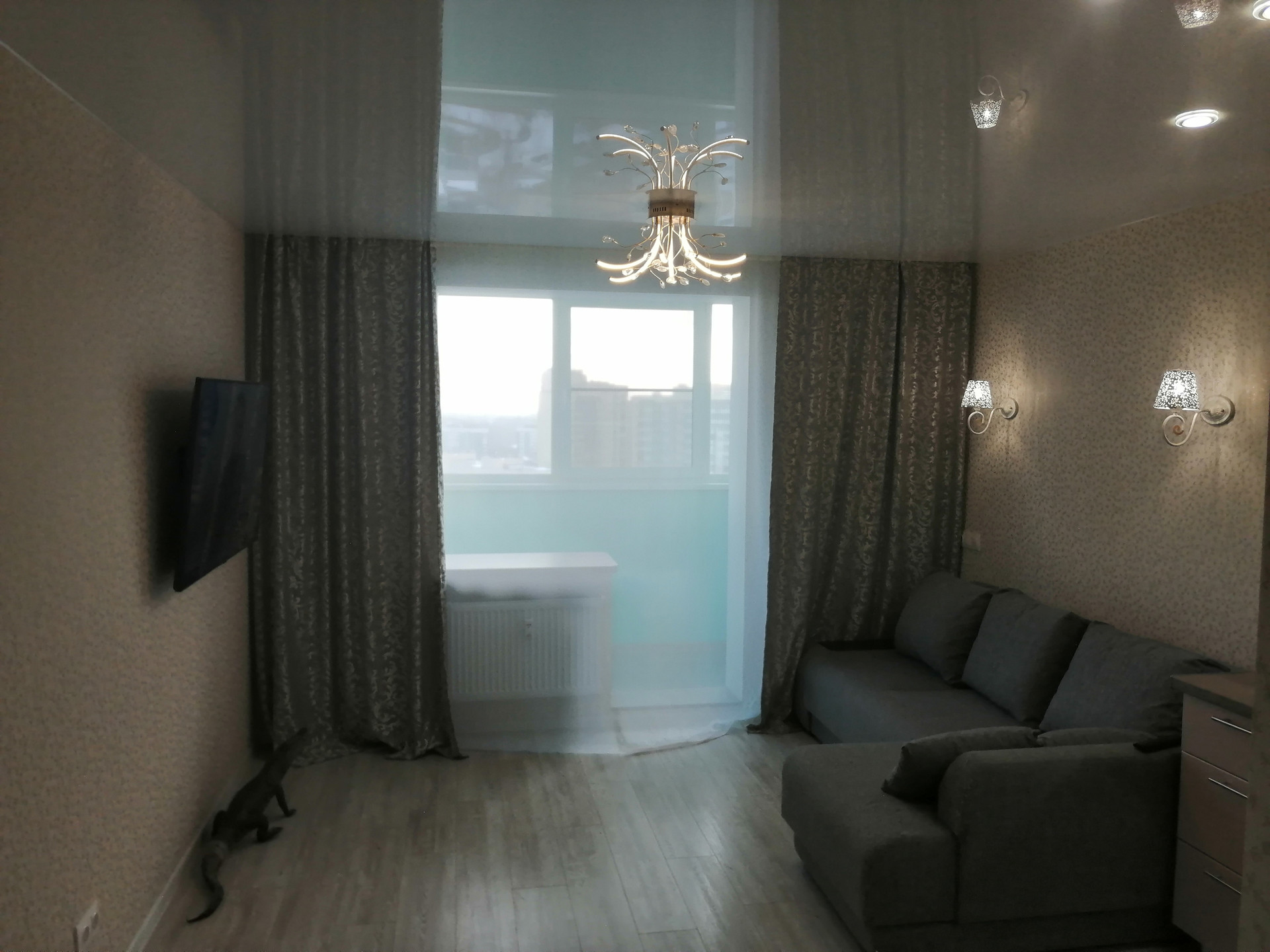Установлены натяжные потолки. По всей квартире, в том числе на лоджии - светодиодное освещение. На полу в комнате - ламинат, в прихожей - керамогранит. По индивидуальном дизайнерскому проекту выполнена ванная комната.