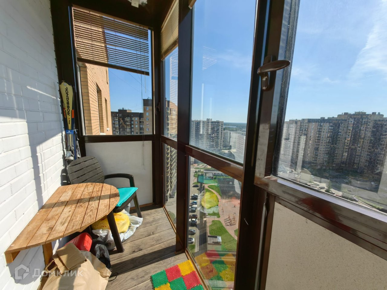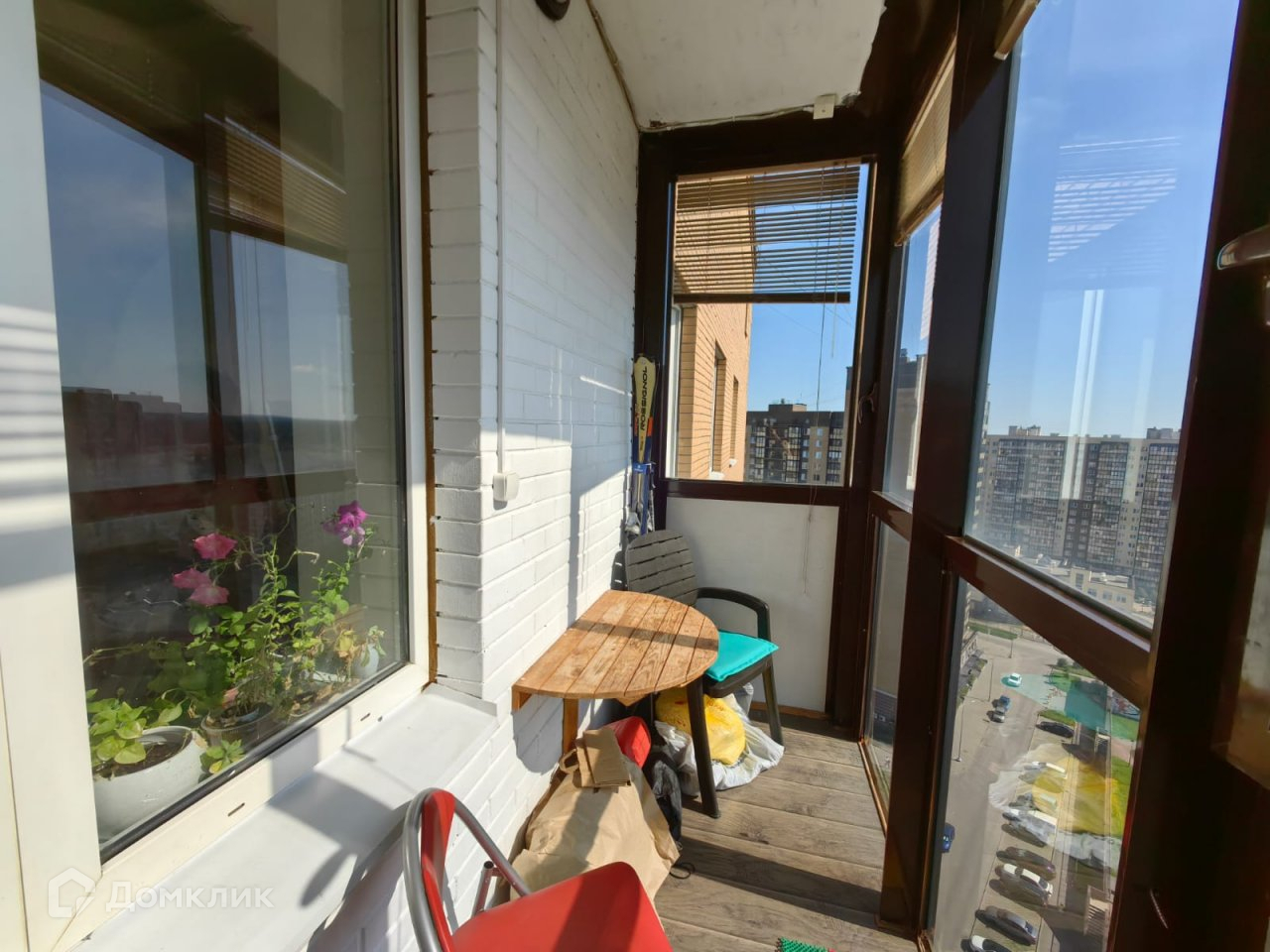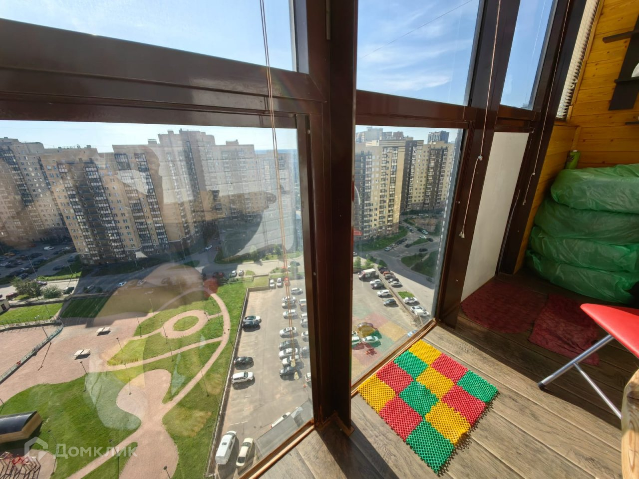 - на балконе - два релакс-кресла и столик, полки. Балкон застеклен прозрачными блоками. Вид потрясающий.