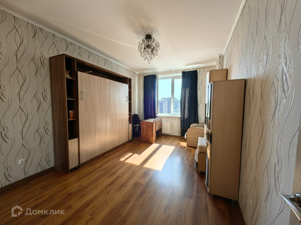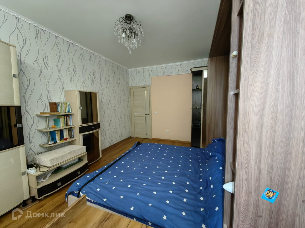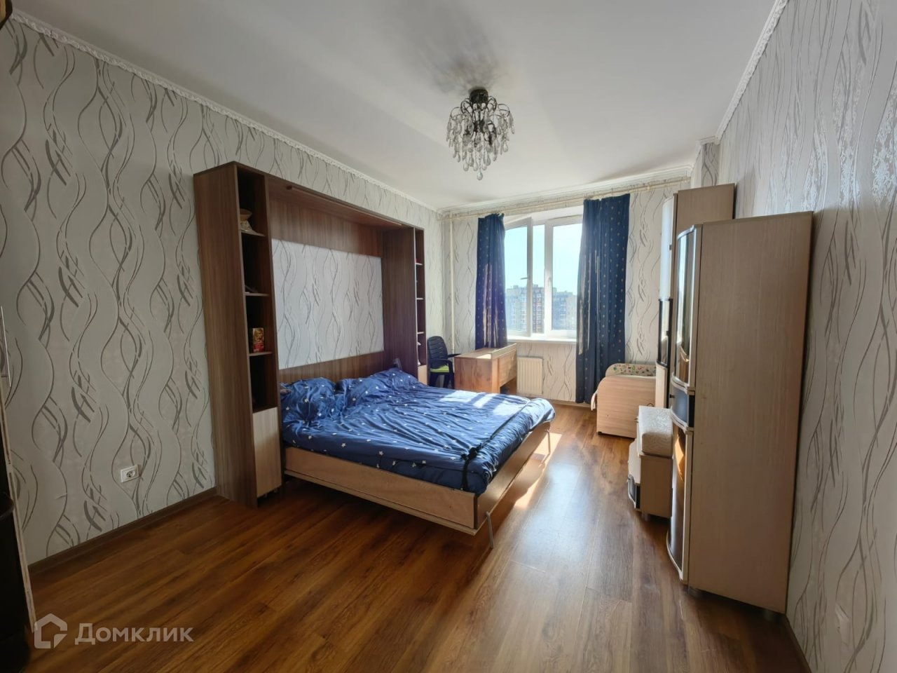 - в комнате большая двухспальная кровать-стенка с мемори-матрасом, тумба под телевизор, телевизор, письменный стол, кресло; полка;