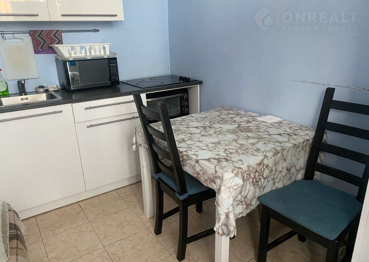 - Бoльшaя кухня с гарнитуром и обеденным столом, а также выходом на застекленную лоджию с прекрасным видом.       На кухне найдется место для зоны отдыха — диван с телевизором прекрасно впишутся в интерьер.