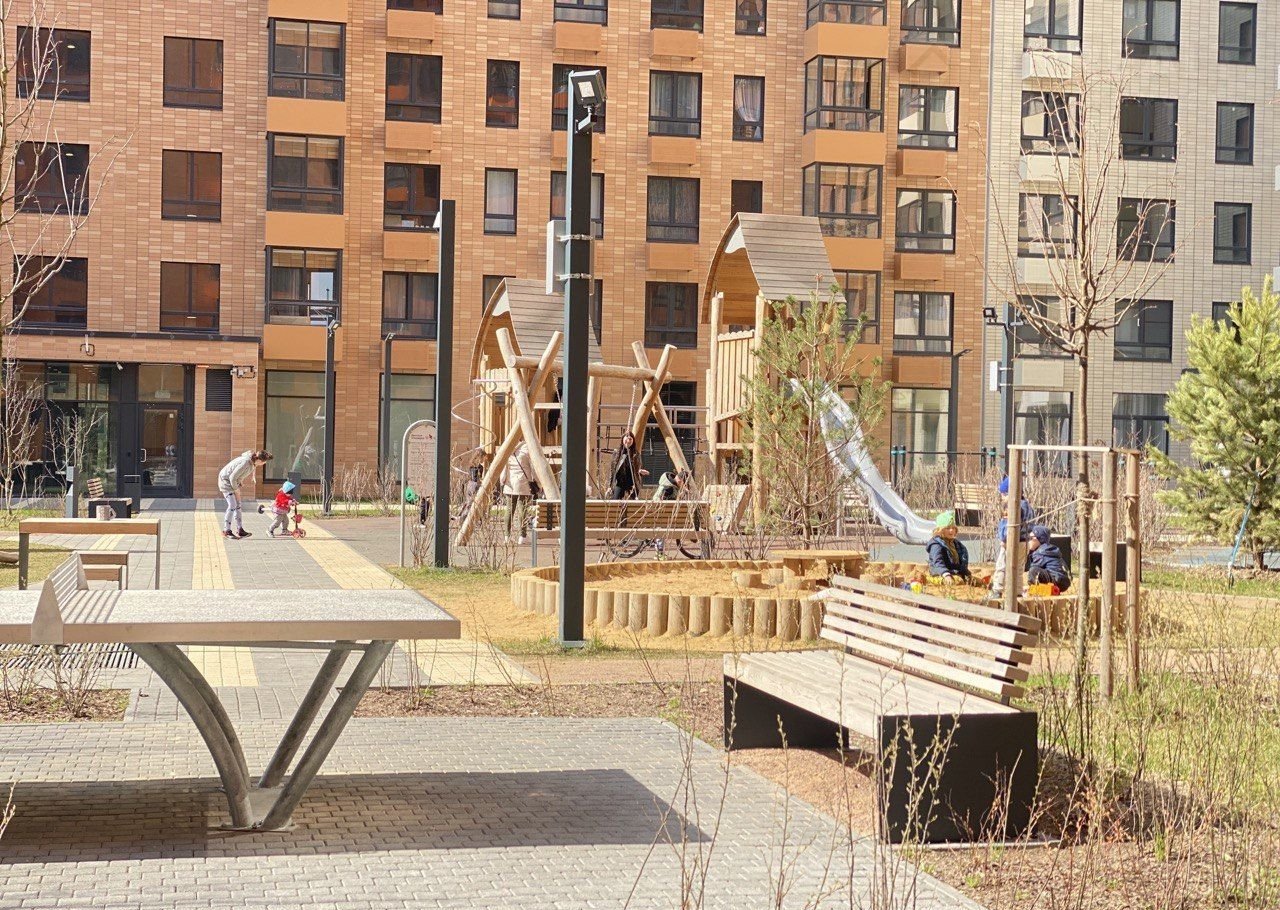 Закрытый двоp оборудованный детской и спортивной площадками, зонами отдыха.