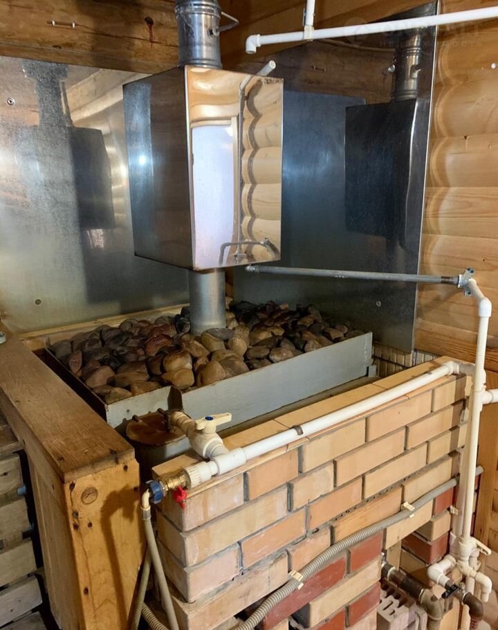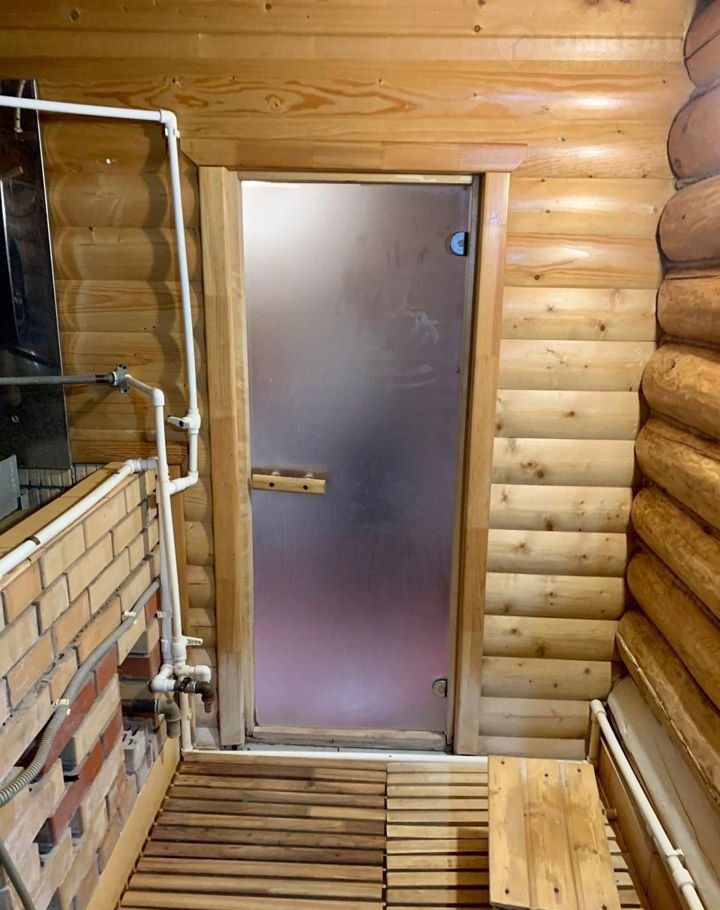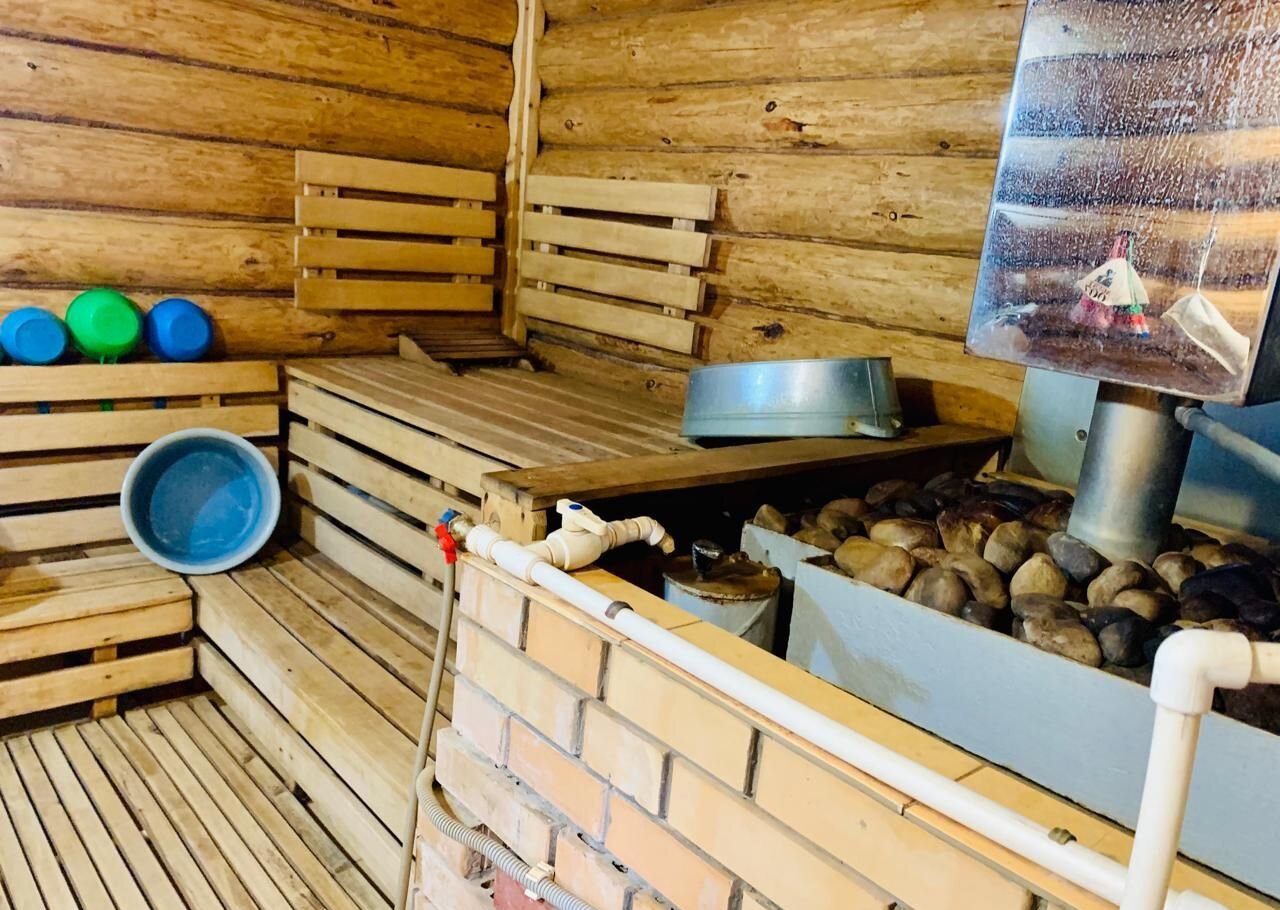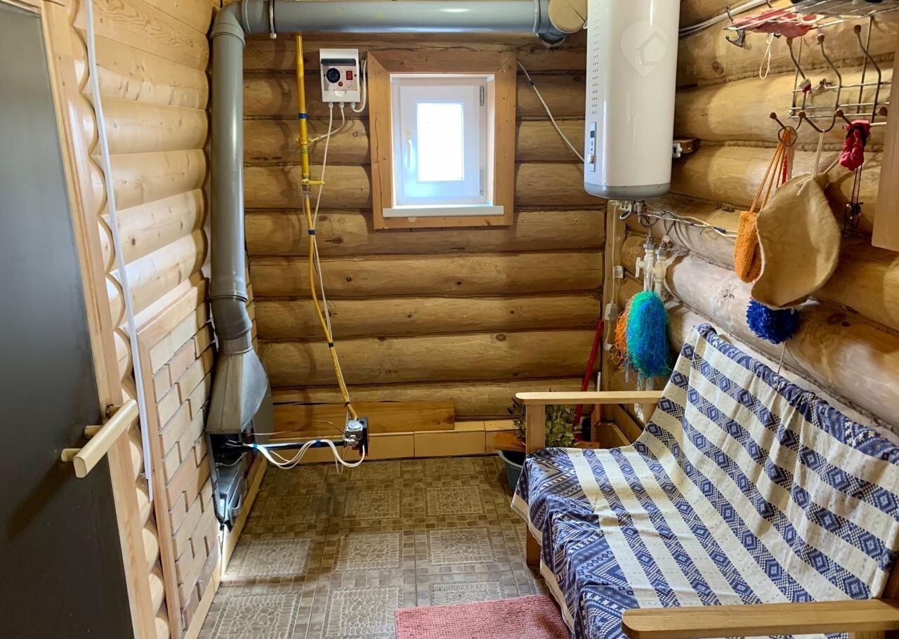 Баня бревeнчaтaя, oбшита внутри блок-хаусом, снаружи металласайдинг, везде тёплые полы, топится на газу, имеется водонагреватель на 80л., чистая вода в баню качается с колодца.