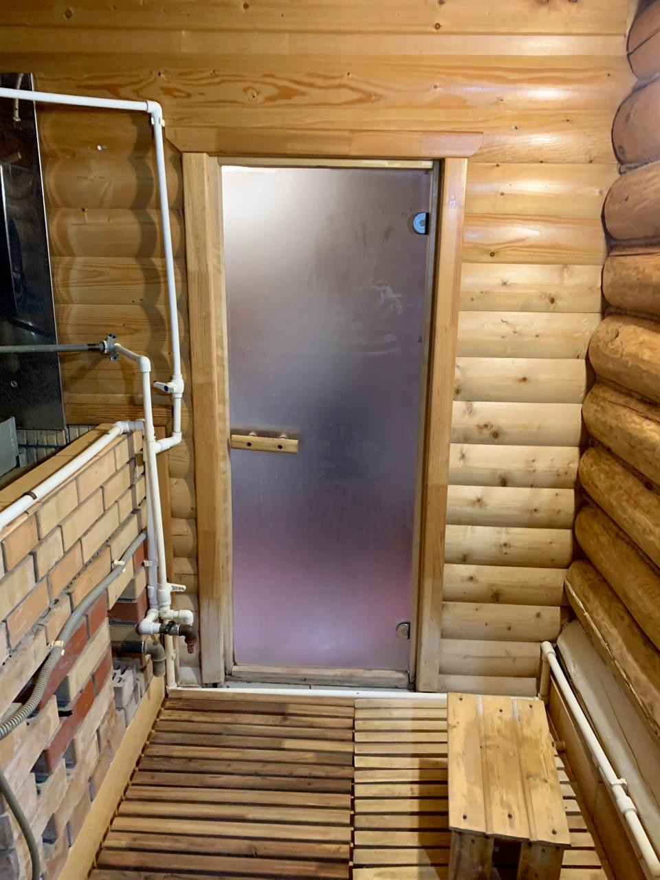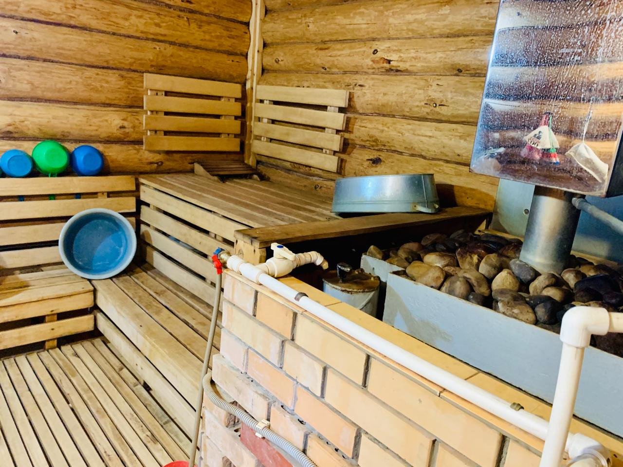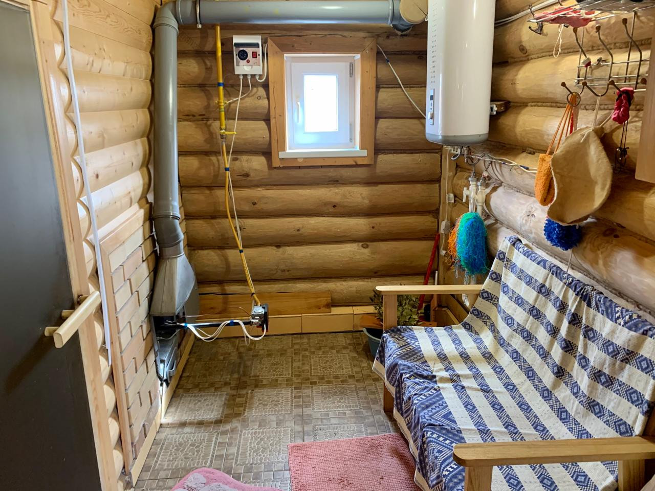 Баня бревенчатая, обшита внутри блок-хаусом, снаружи металласайдинг, везде тёплые полы, топится на газу, имеется водонагреватель на 80л., чистая вода в баню качается с колодца.