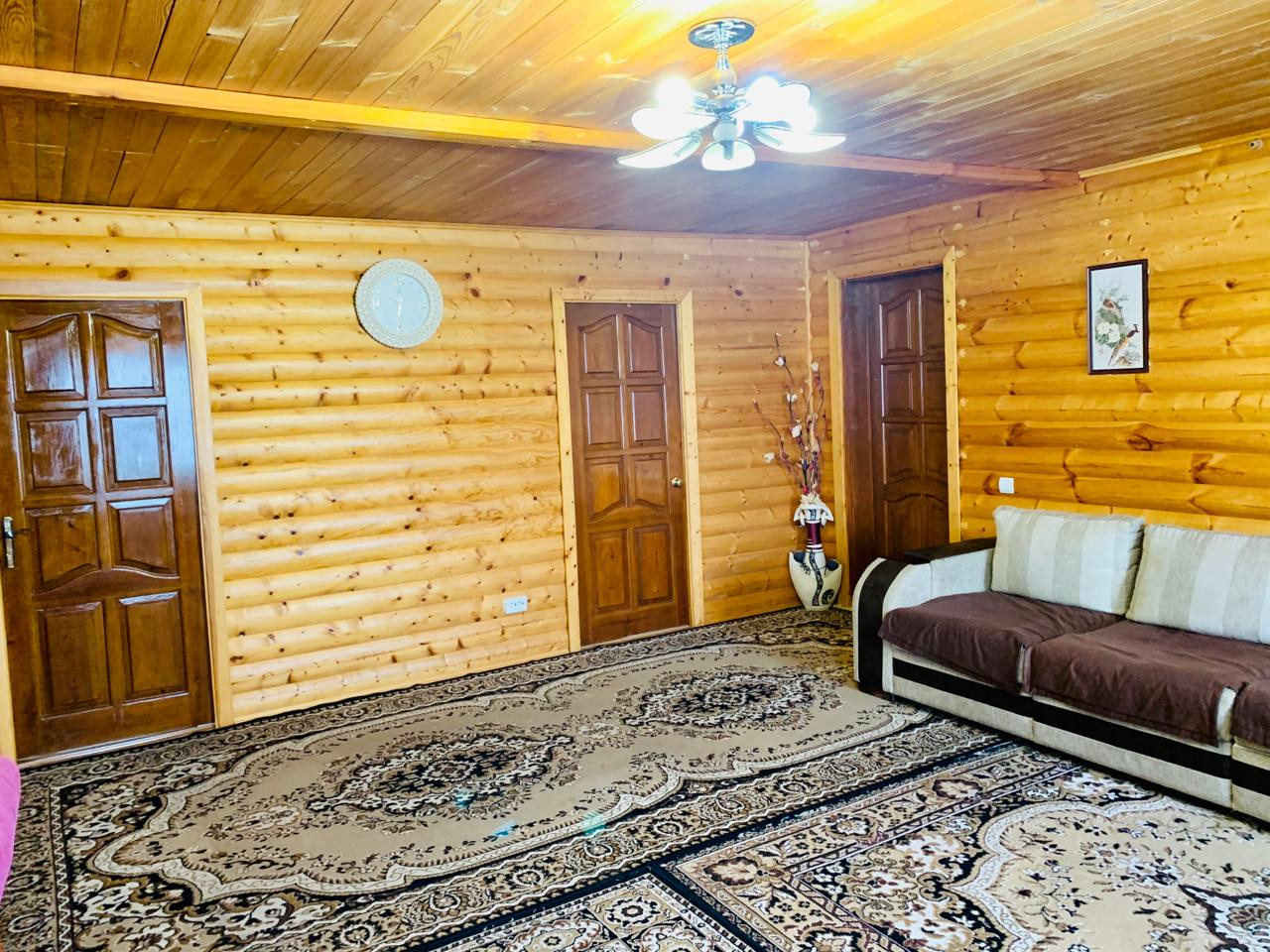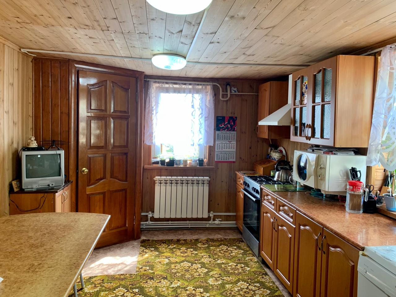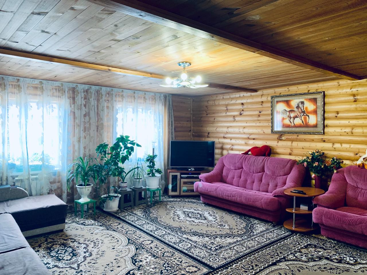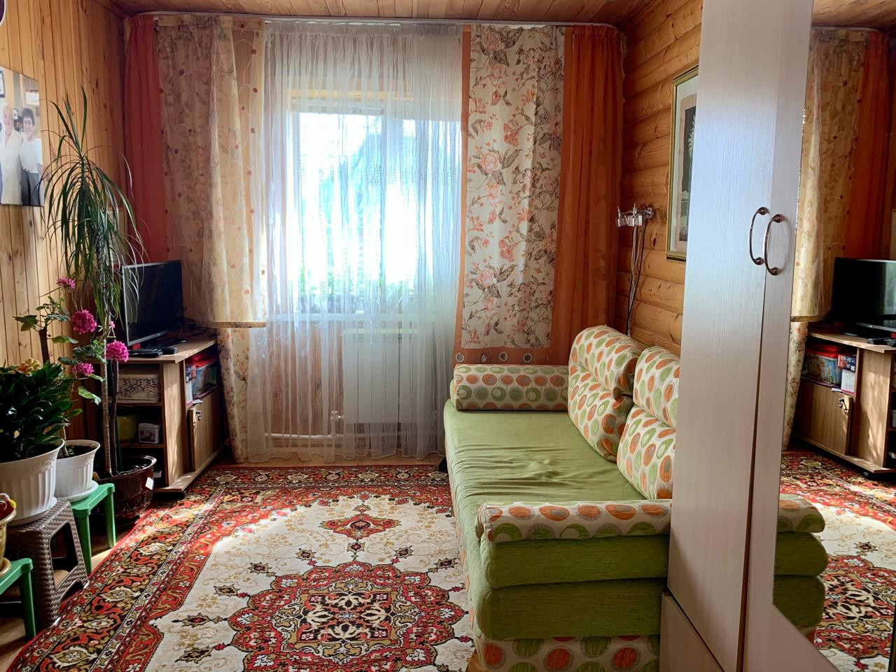 Дом состоит из трёх жилых комнат плюс просторная кухня, коридор, тамбур-сени, сан.узел. Материал бревно-сосна, обшито блок-хаусом. Крыша профностил, утеплённая.