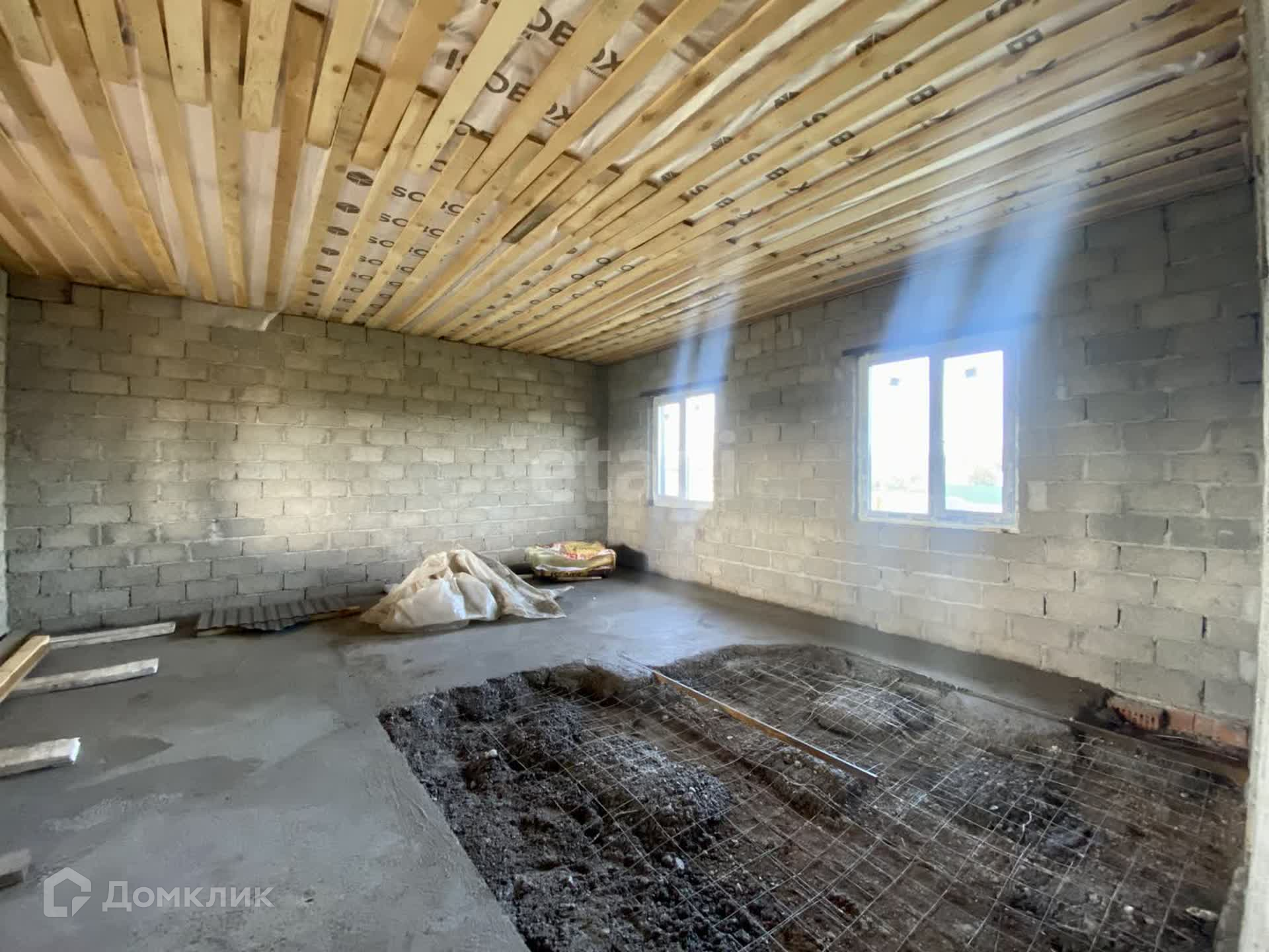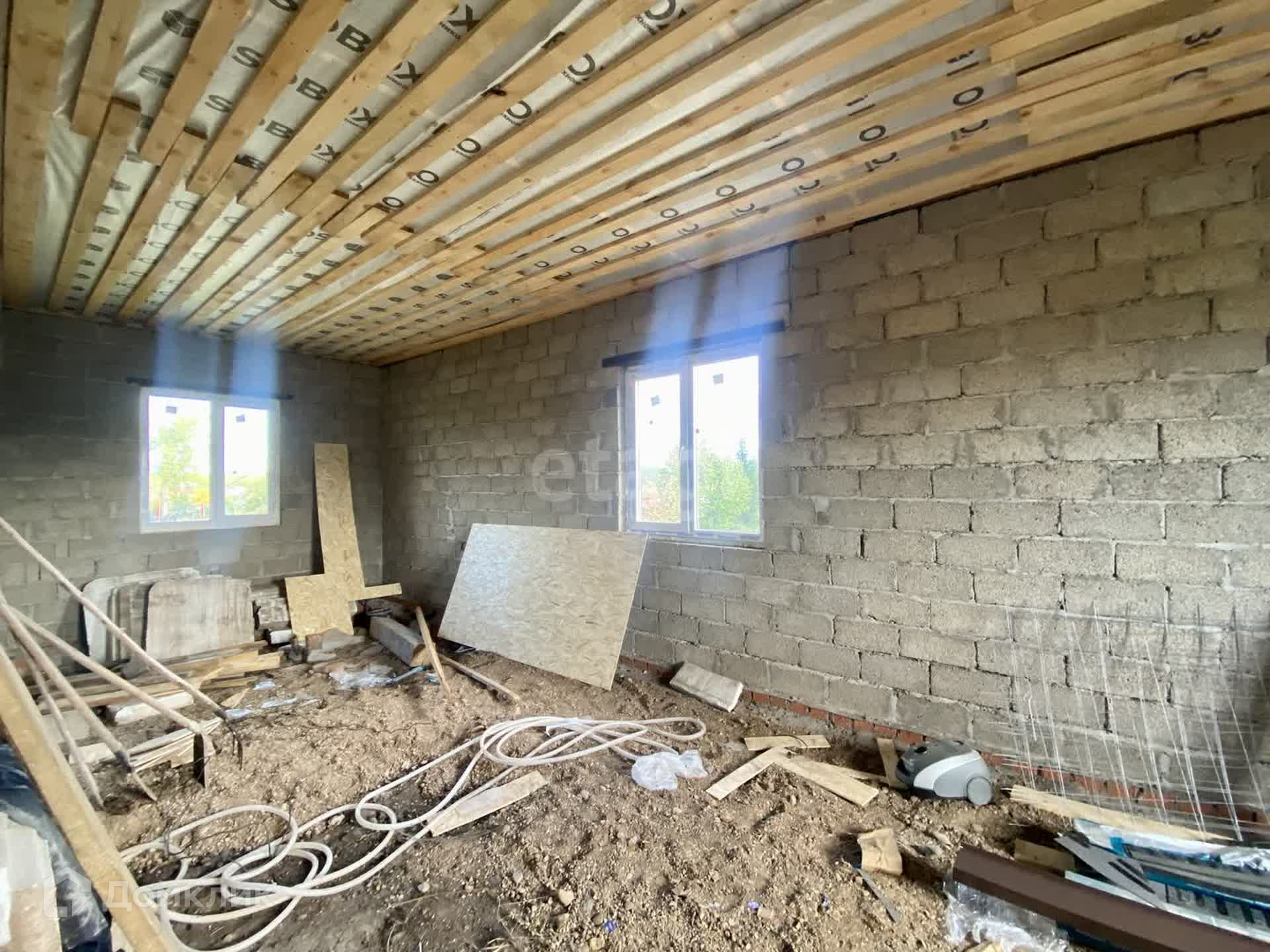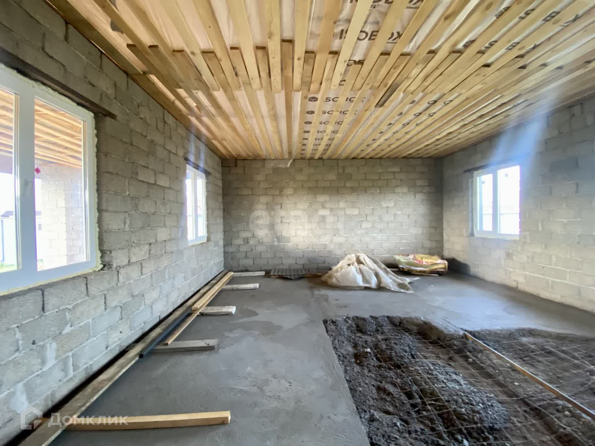 Дом в черновой отделке. Планировка помещений предусматривает просторную гостиную, совмещенную с кухней, спальни, ванную комнаты и другие функциональные помещения.