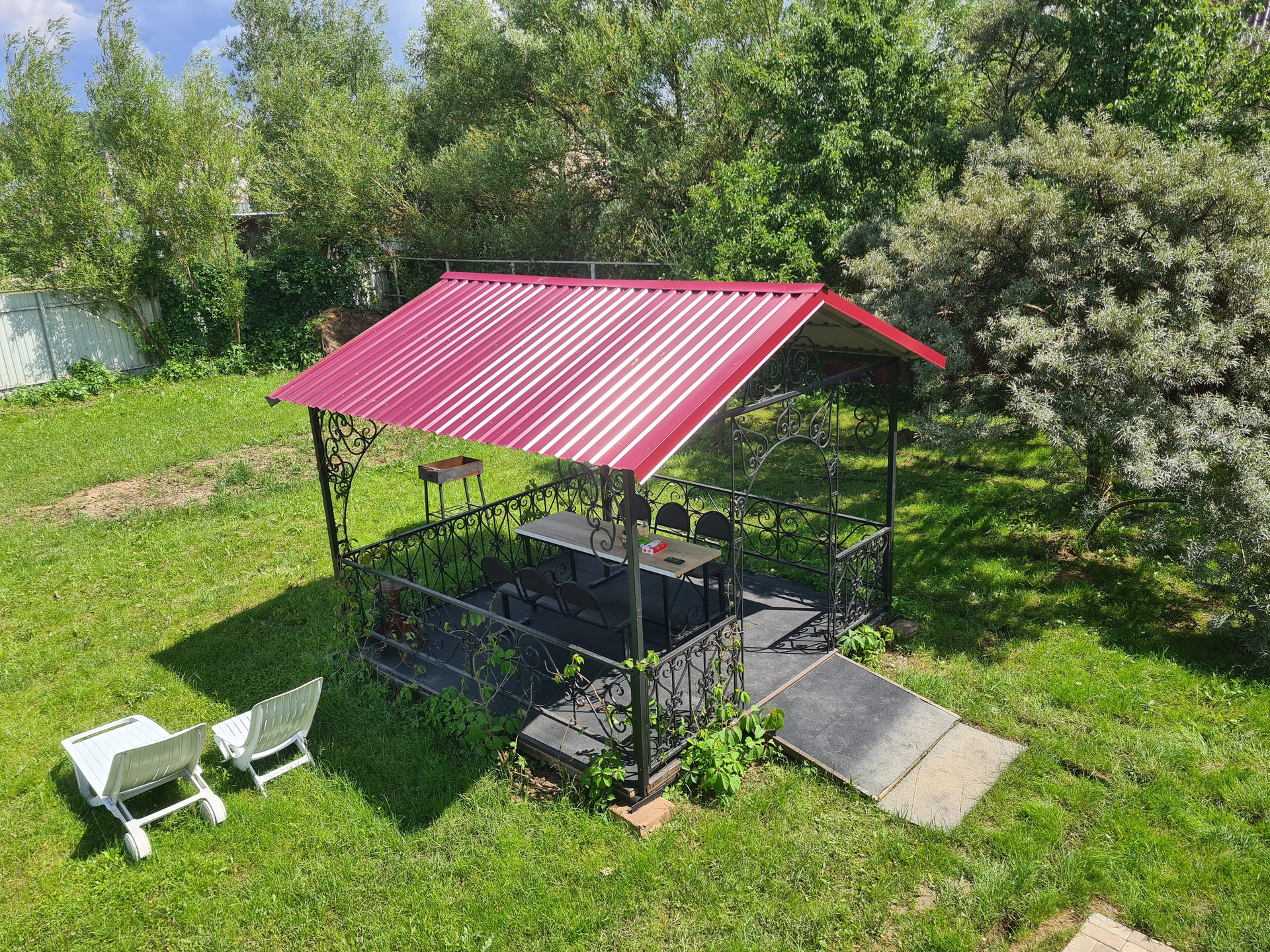 Участок огорожен металлическим забором,на территории плодовые деревья и кустарники, цветочные клумбы. Имеется зона барбекю с беседкой.