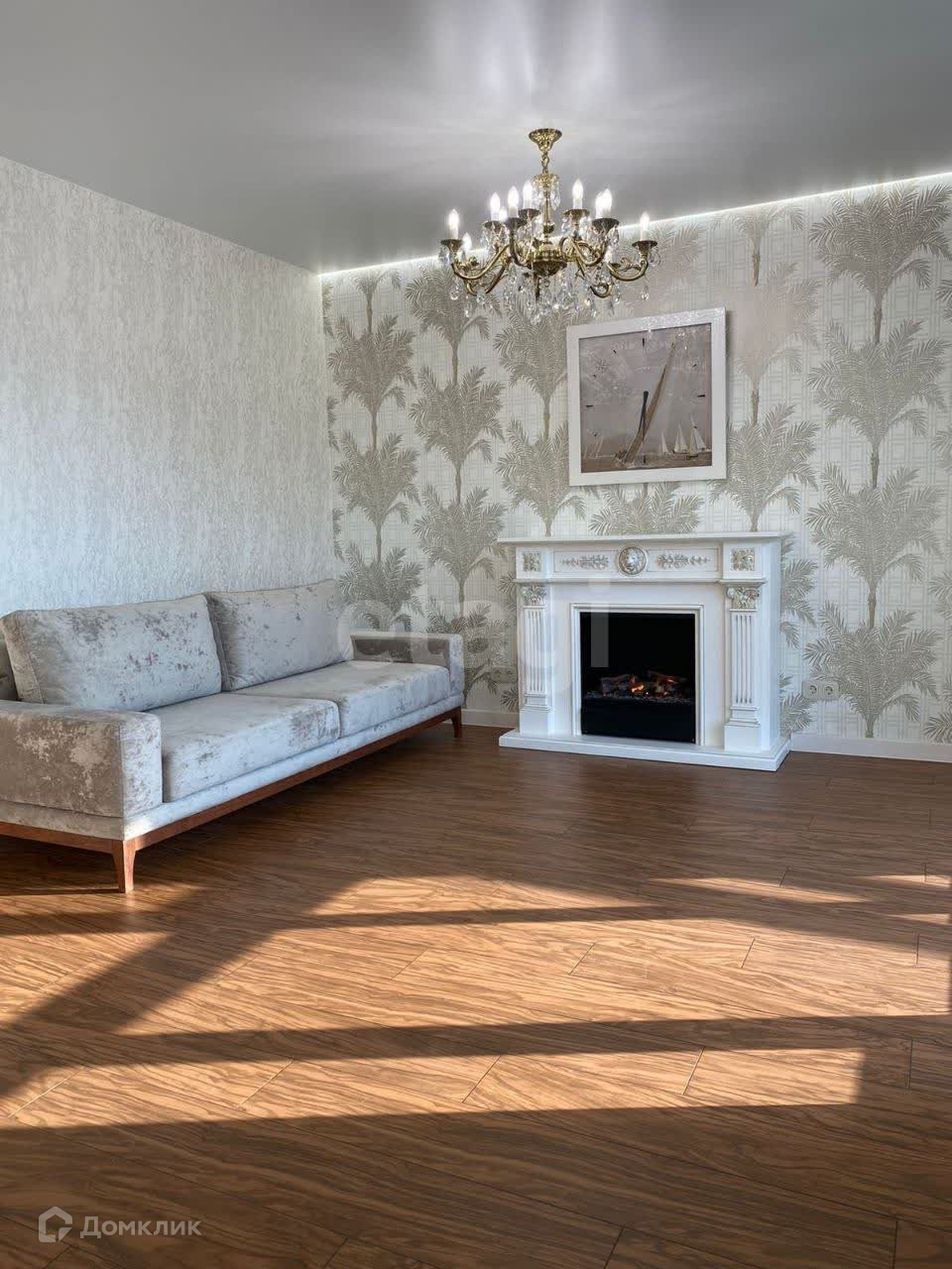 В гостиной расположен электрокамин Dimрlех с эффектом реалистичного живого огня, обогревом и функцией увлажнения.