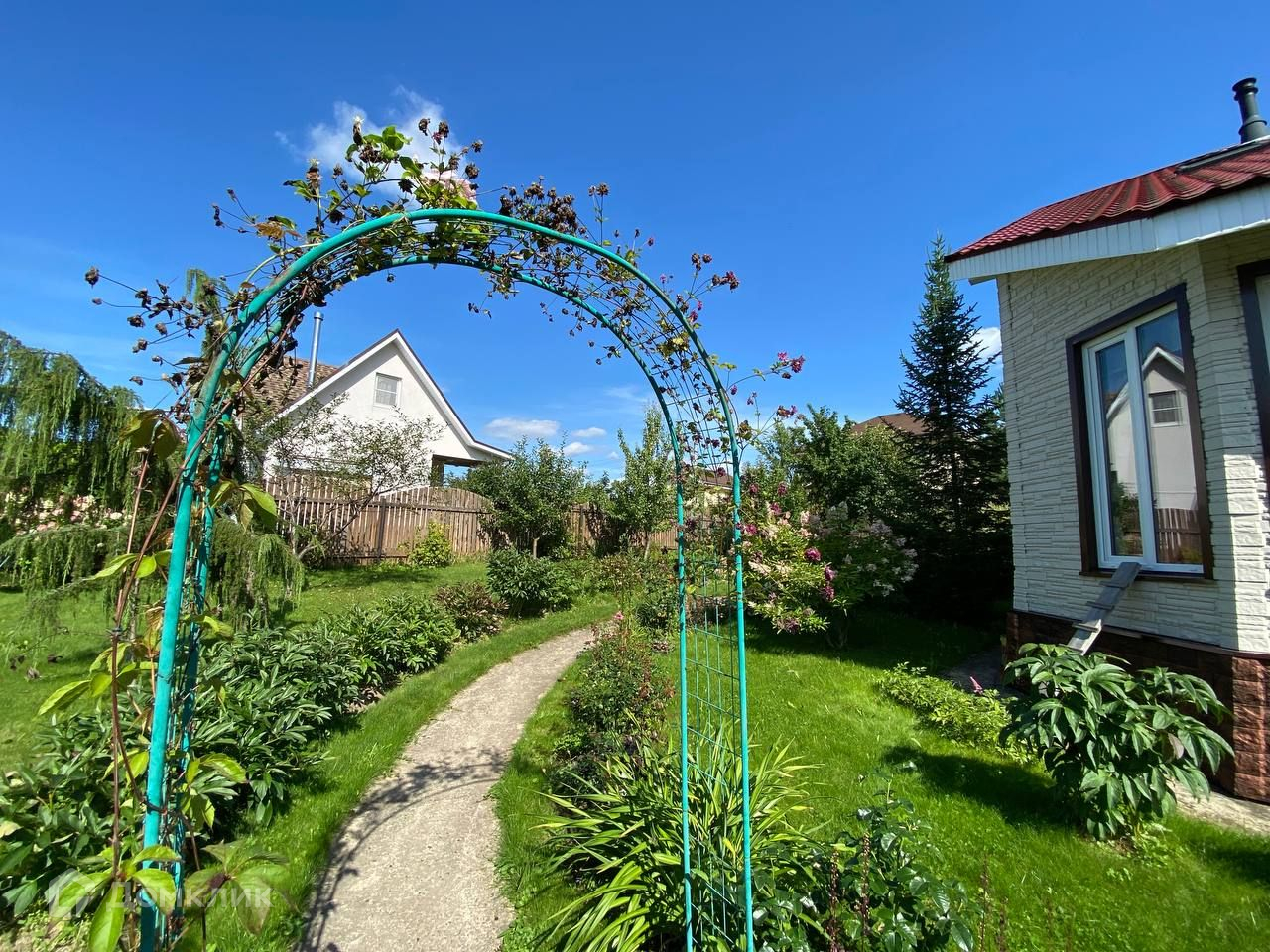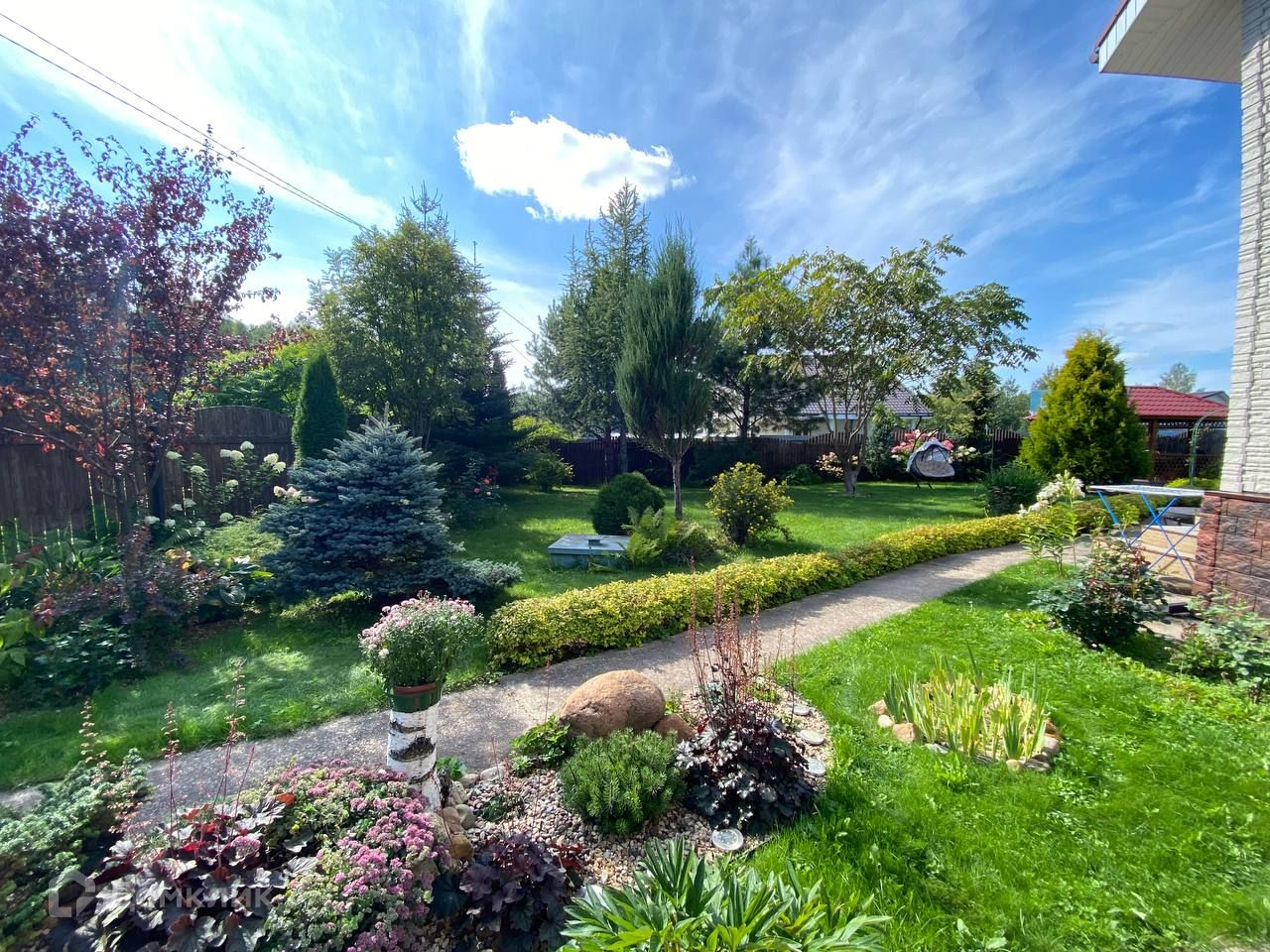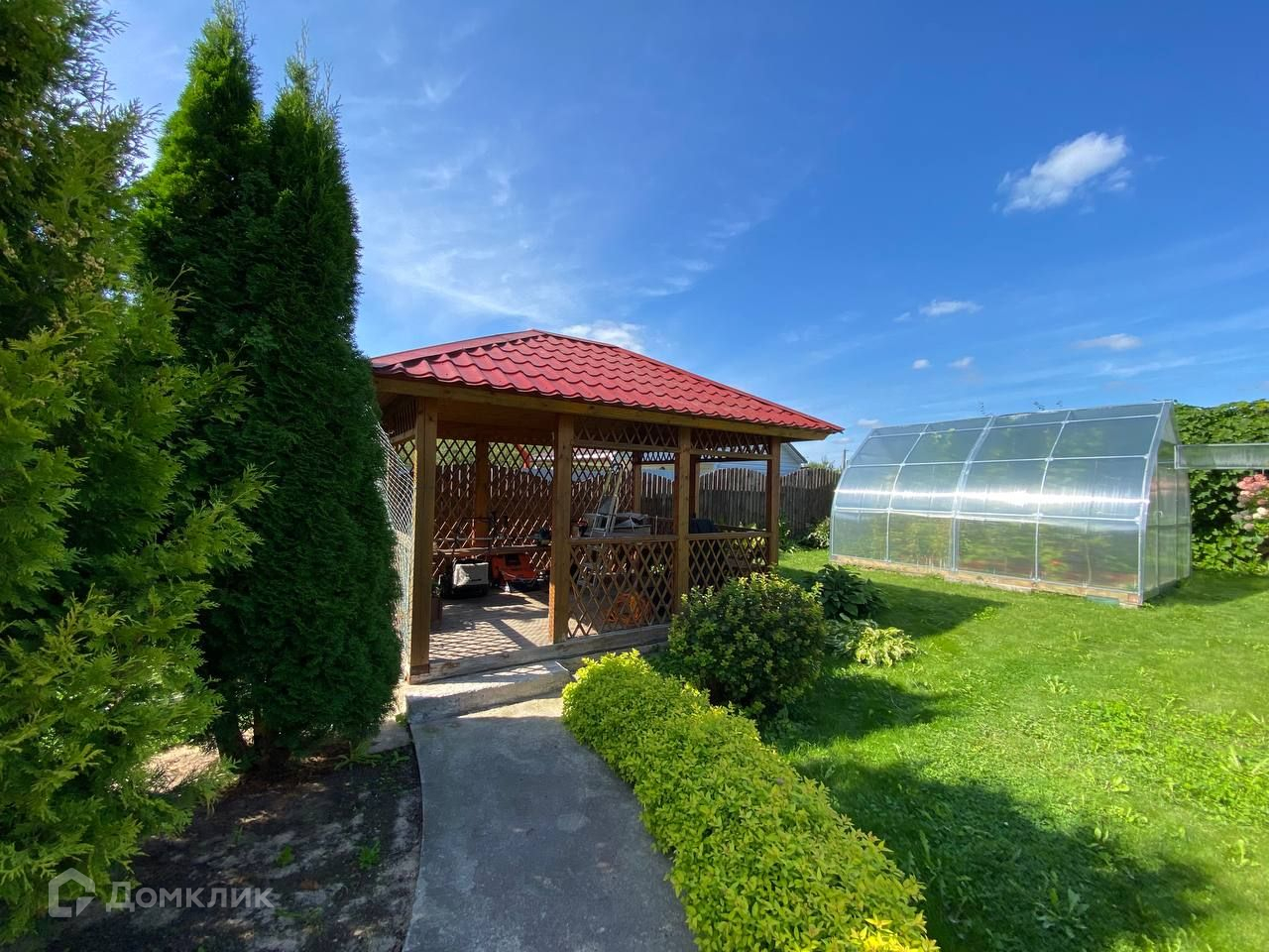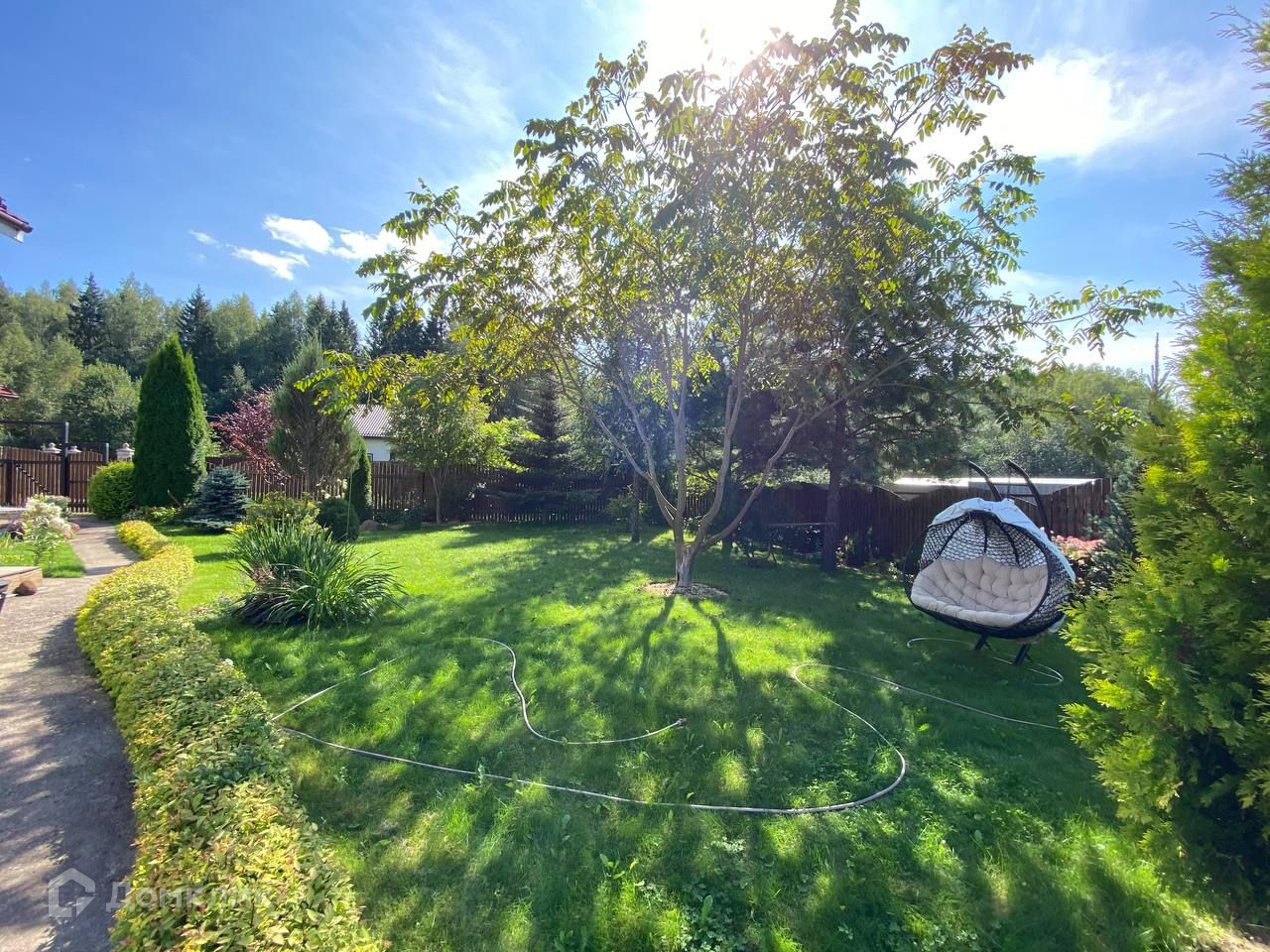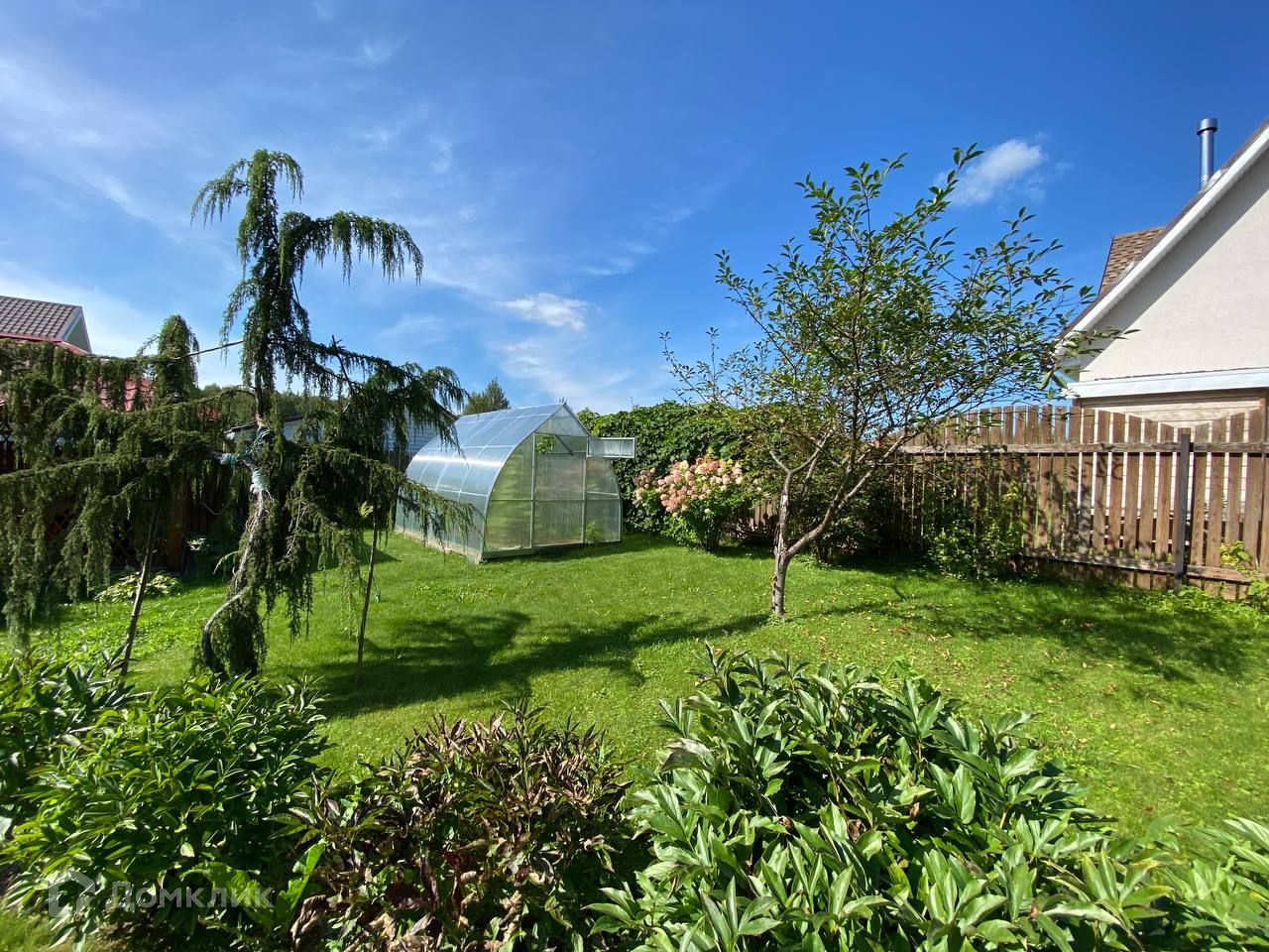 Участок 10 соток, ровный и сухой, правильной формы. На участке есть беседка, теплица, множество декоративных и плодовых деревьев и кустарников.