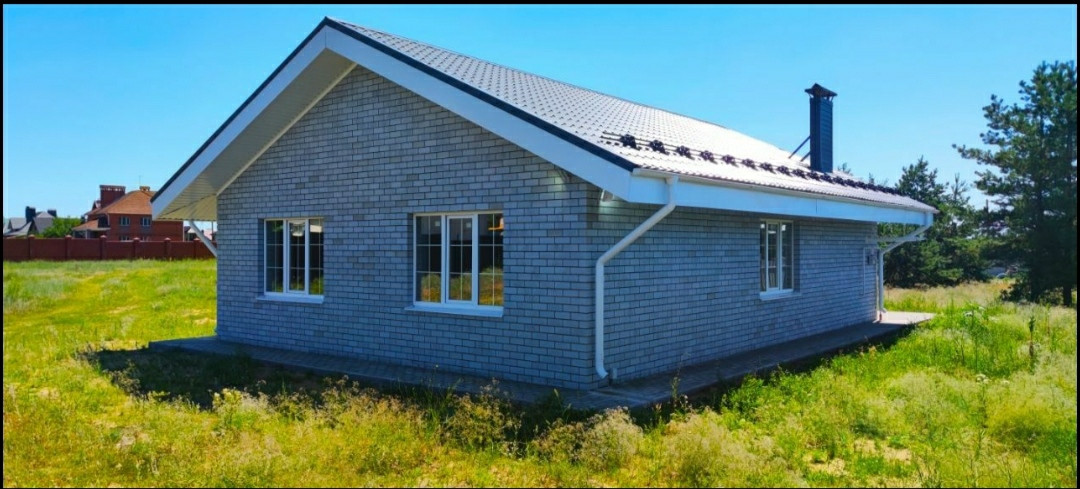 Дом выполнен в актуальном «Скандинавском стиле». Серый кирпич, низкий цоколь, уютная двускатная крыша, белые детали внешней отделки в сочетании с посадкой дома на ровном участке, создают ощущение легкости, современности и тепла одновременно.