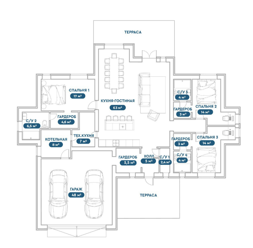 Проект предполагает 3+ полноценные комнаты для организации спален, гостевых комнат, кабинета (с гардеробными зонами).