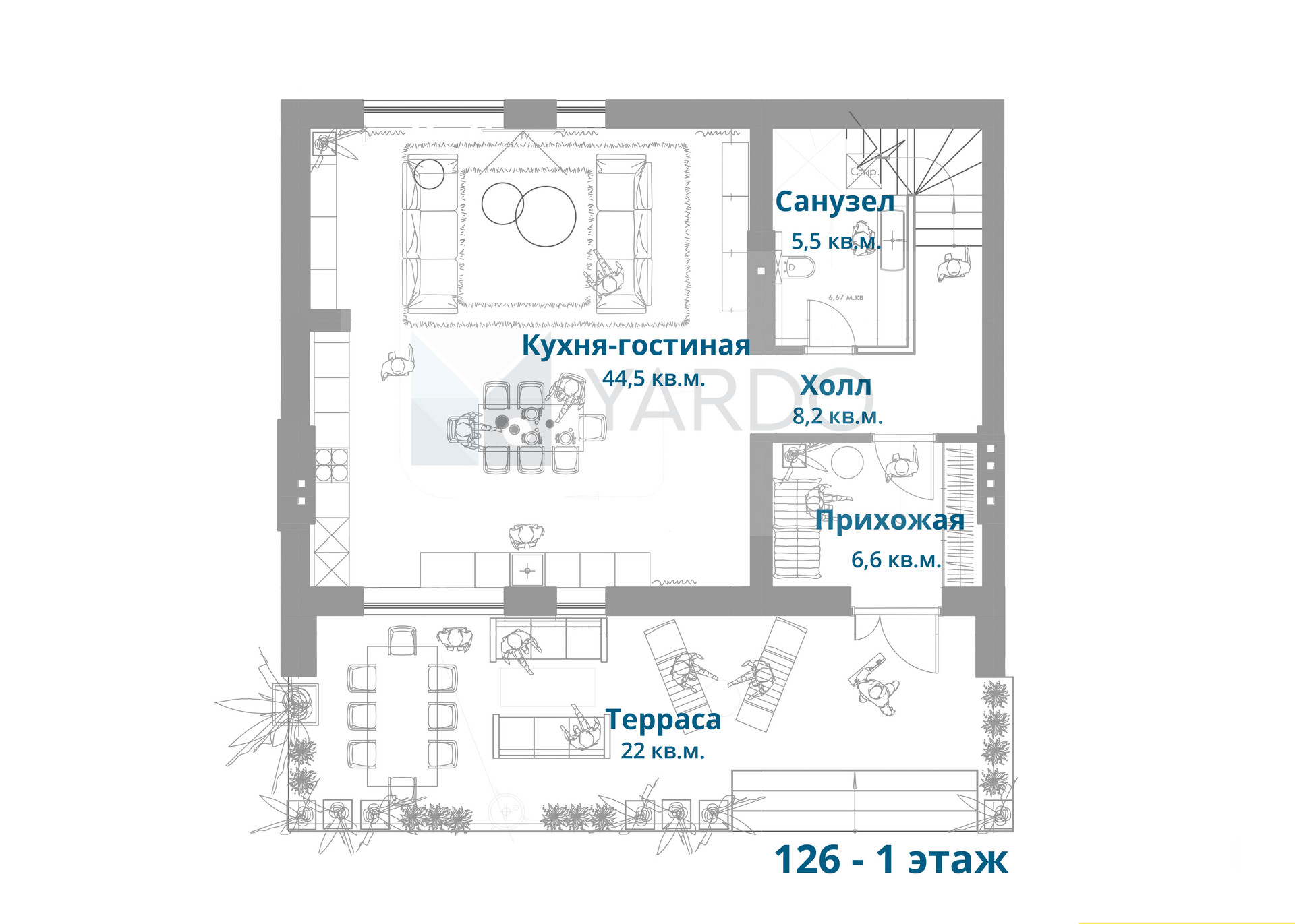 Терраса – 22 кв.м. (не входит в общую площадь);