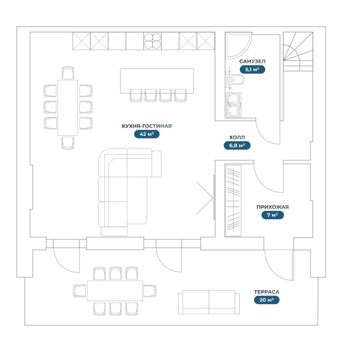 — Кухня-гостиная – 42 м²