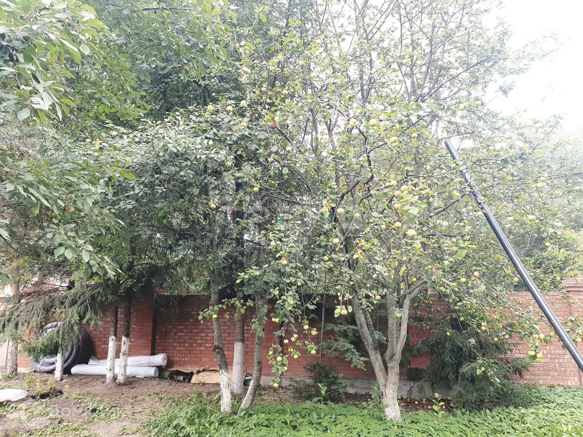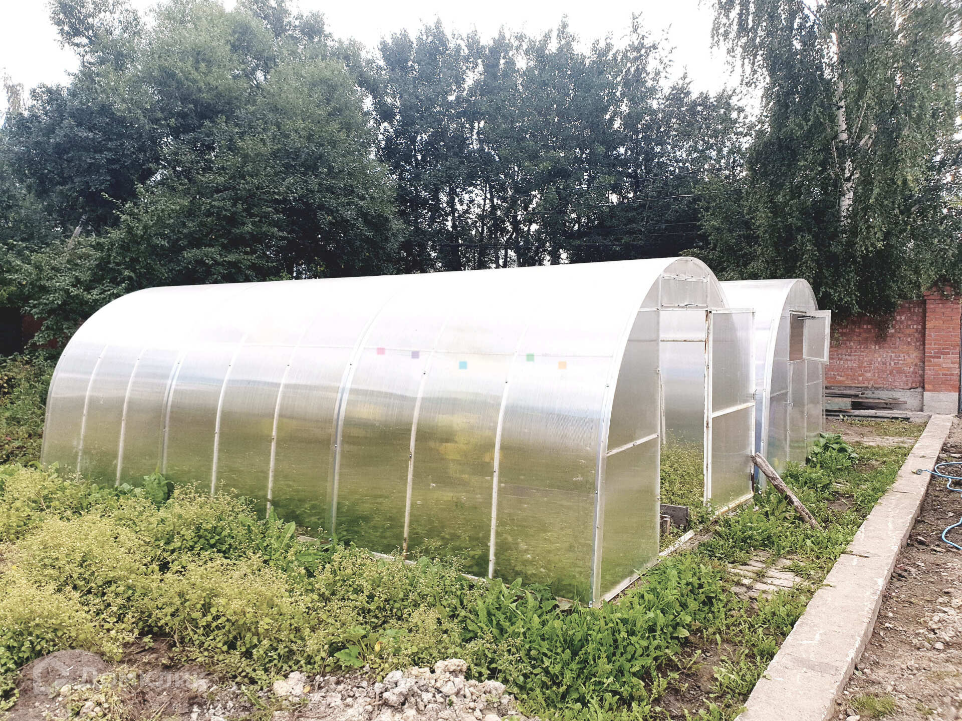 - На участке размещены 2 теплицы, растут плодово-ягодные деревья.