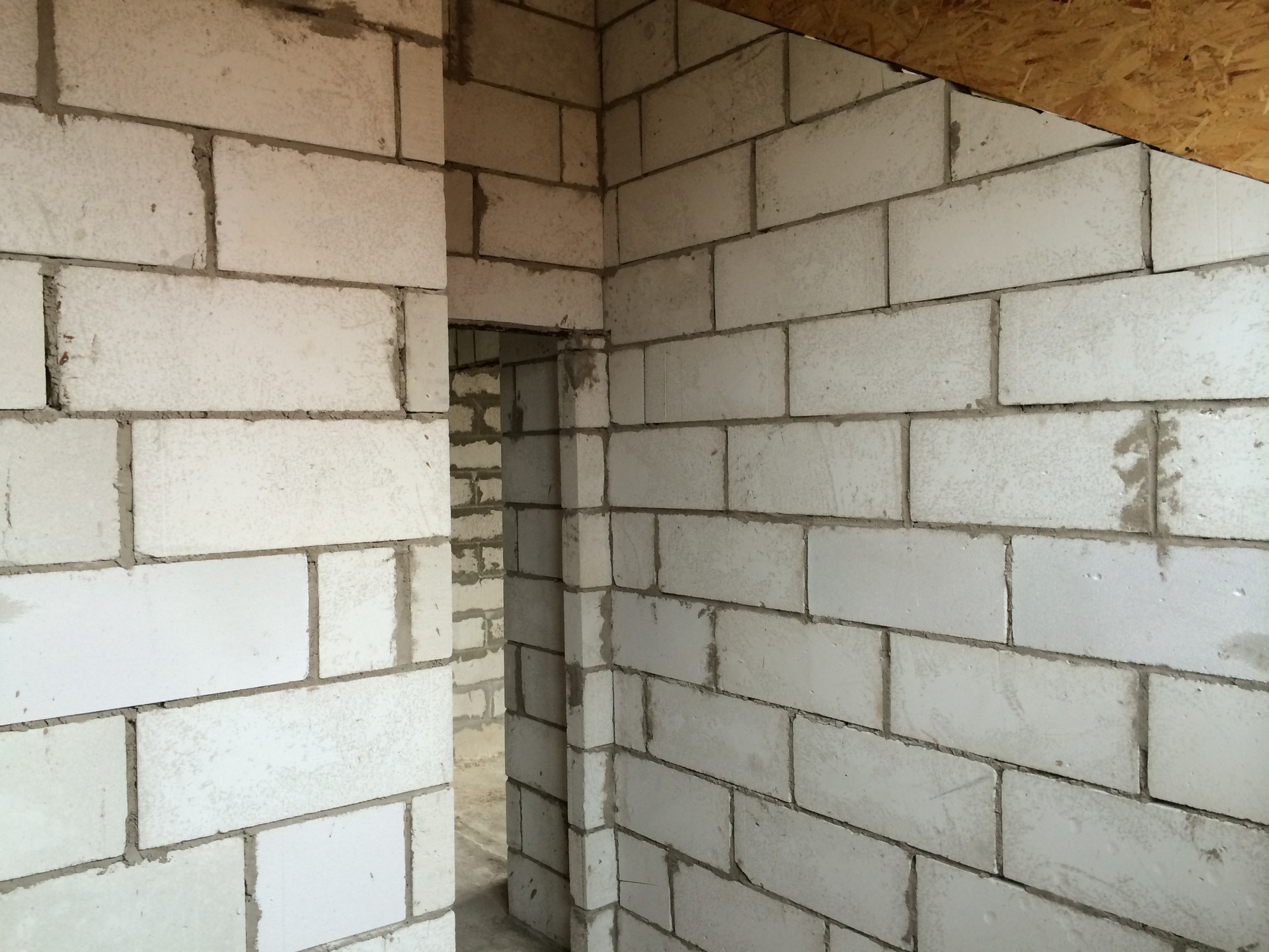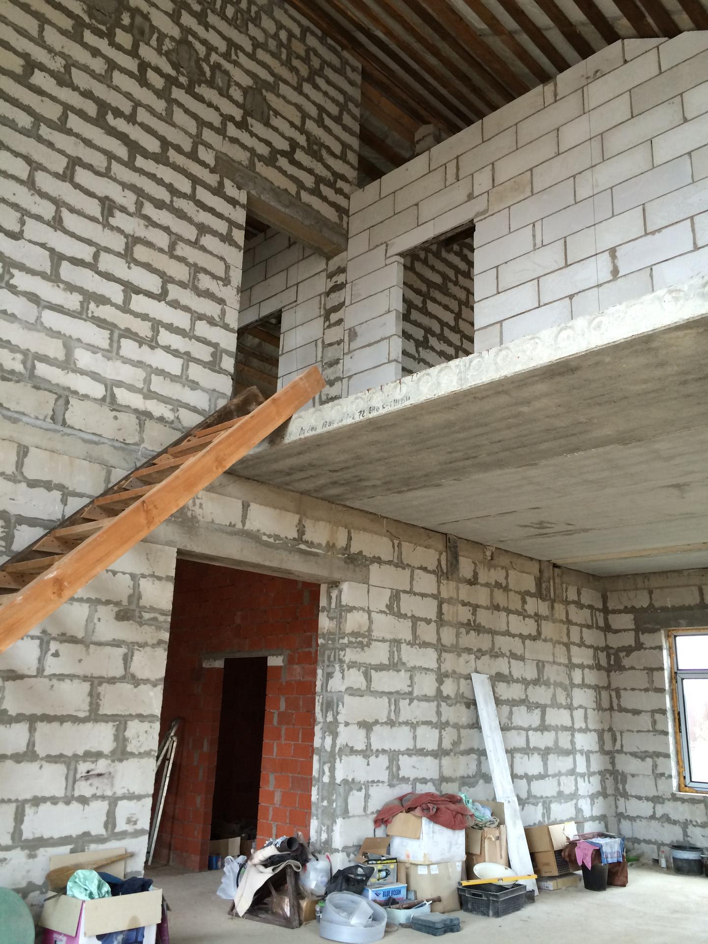 Наружные1стены: Газобетонные блоки8600х400х300,армирование через ряд, клеевая смесь(5мм). Внутренние перегородки: Газобетонные блоки, кирпич.