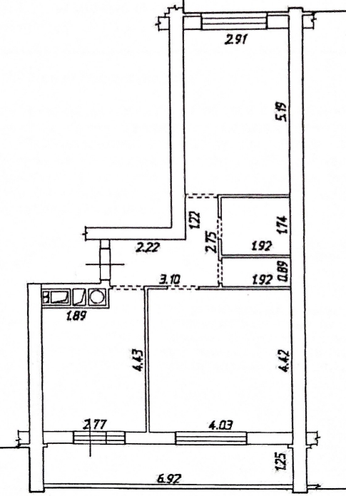Общая площадь без учёта лоджии-55 кв.м., жилая площадь-32,9 кв.м. Кухня-12,2 кв.м., прихожая 6,8 кв.м., жилые комнаты: 15,1 и 17,8 кв.м., лоджия 8,7 кв.м.