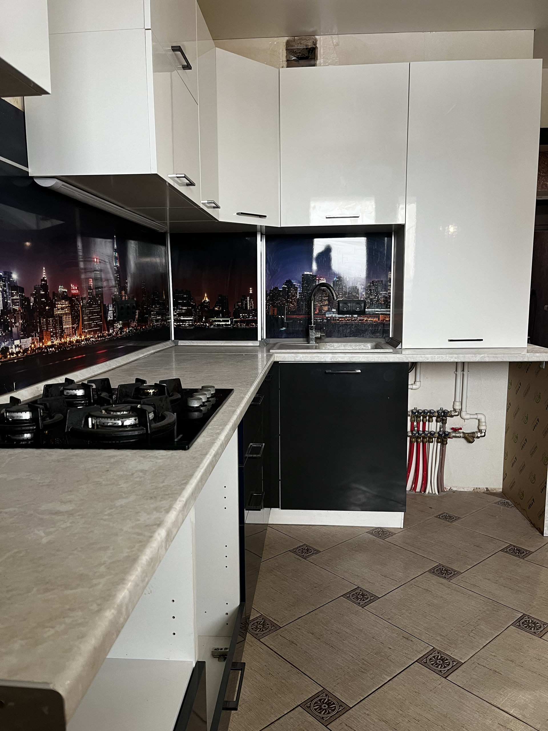 - на полу в комнате - ламинат, в коридоре и кухне - плитка, по всему периметру плитки тёплый пол.