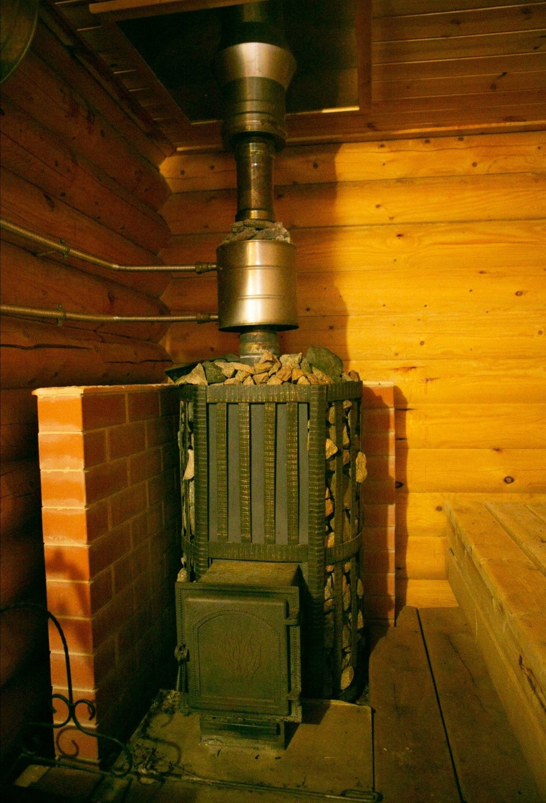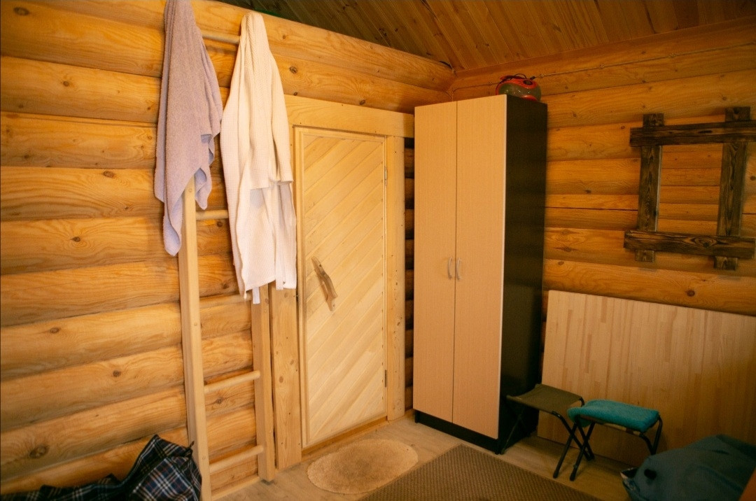 Баня построенна из зимнего леса из оцилиндрованного бревна диаметром 220 мм. Размеры 7*4. Стоит на винтовых сваях. Вода в баню заведена из дома, водопровод работает круглый год. Слив из бани организован в отдельную выгребную яму выполненную из ж/б колец объемом 1 м.куб. электрика в бане в стиле ретро.