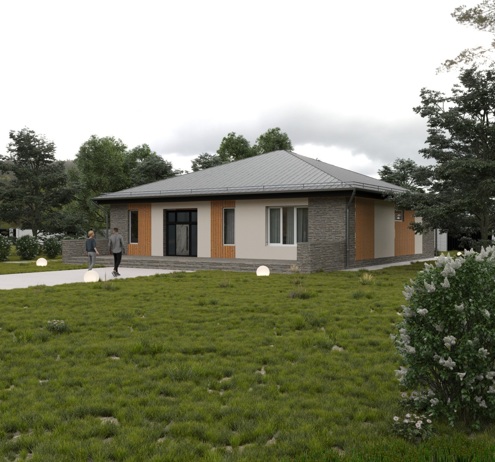 • фасад – декоративная штукатурка с деревянным планикингом и уральским камнем;