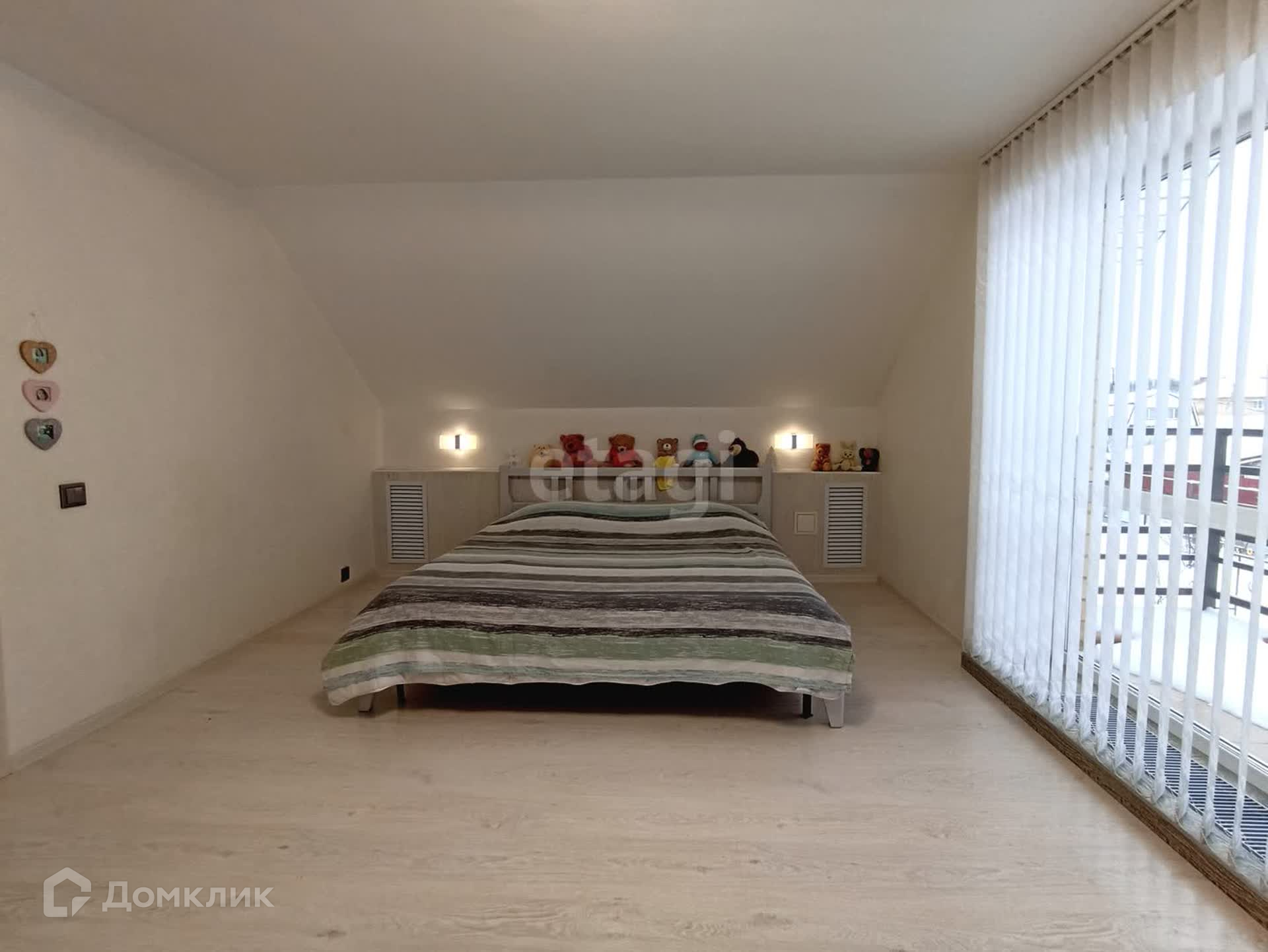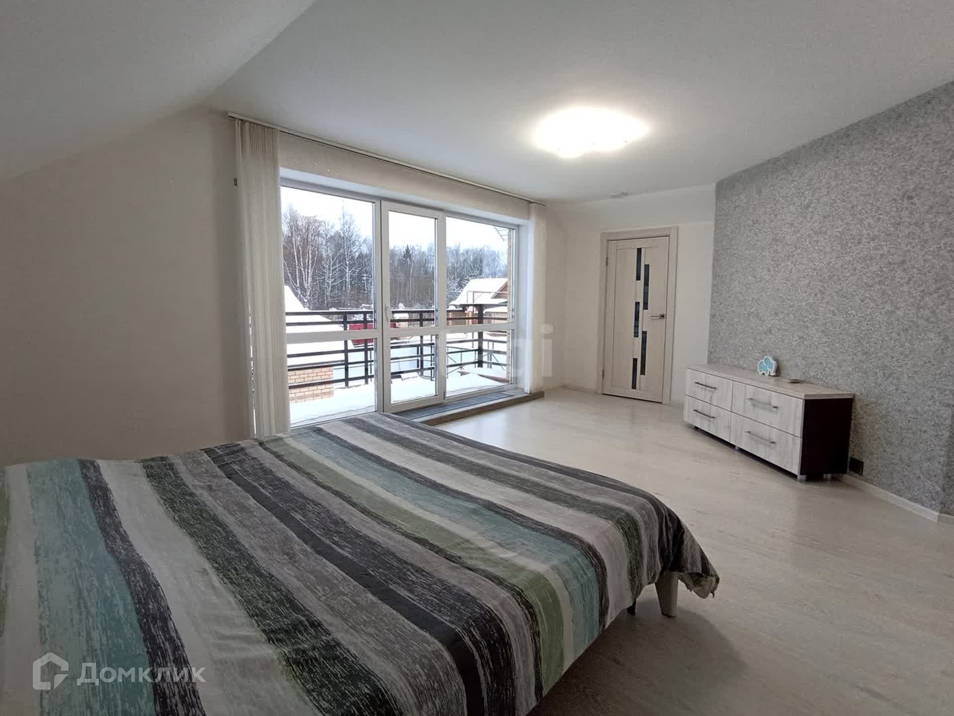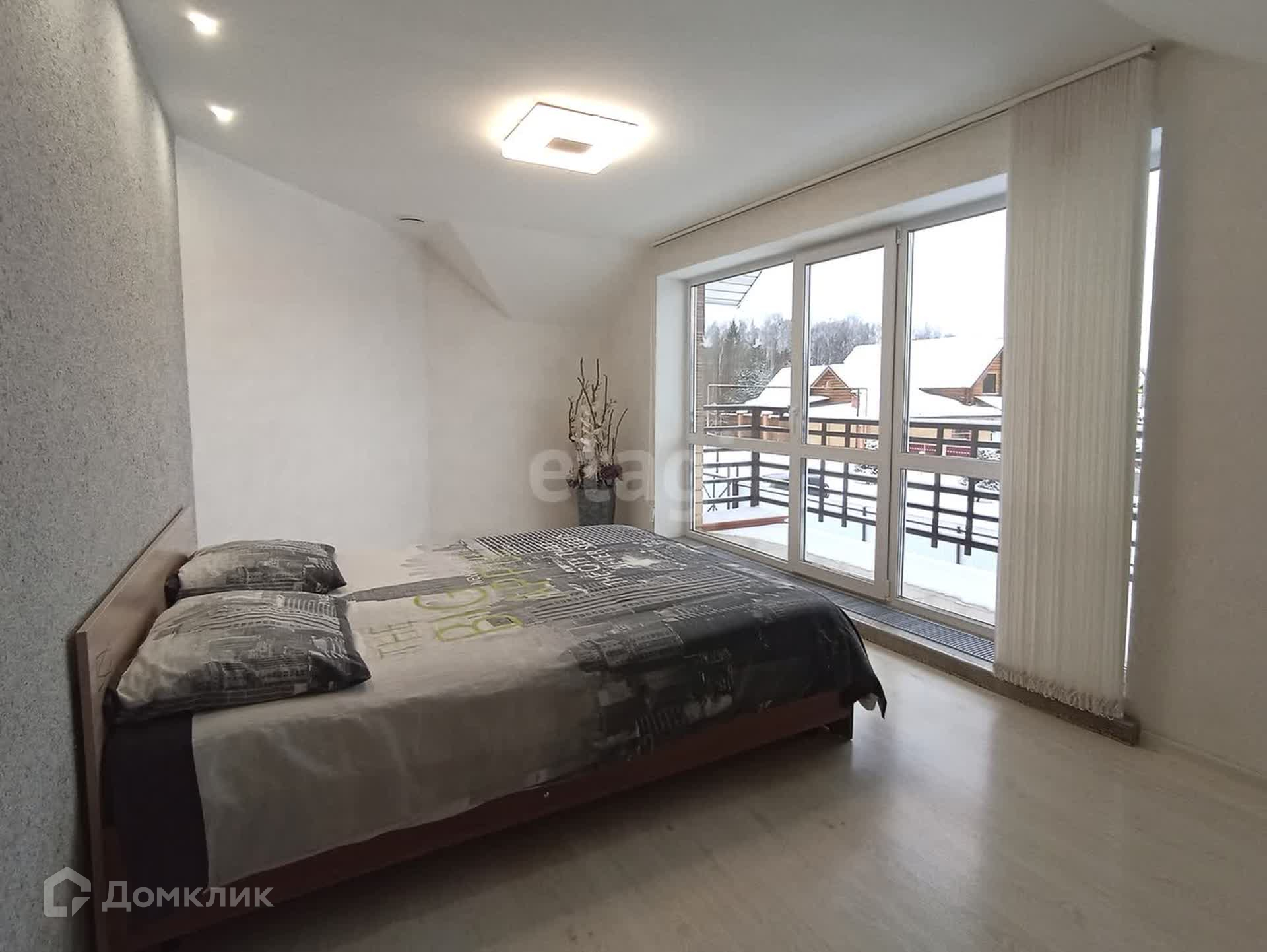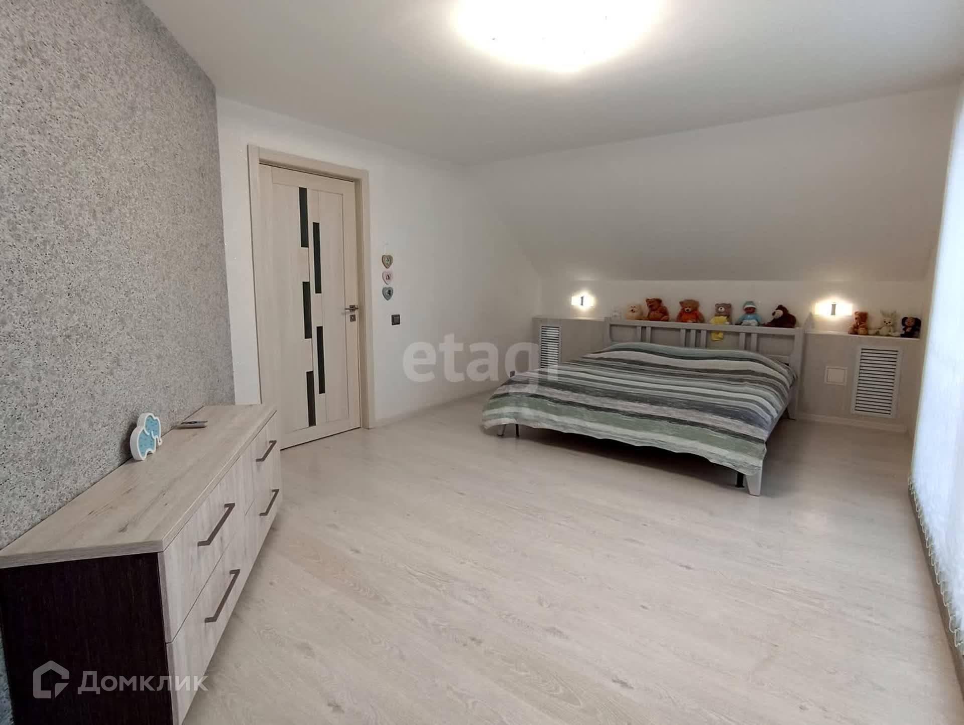 На втором этаже расположены две спальни с собственными гардеробными и балконами, детская комната и санузел. Панорамное остекление дает полноценно насладиться широким видом живописных окрестностей. Пол в комнатах устелен качественным ламинатом. В оформлении стен использованы жидкие обои. В санузле сделан теплый пол.