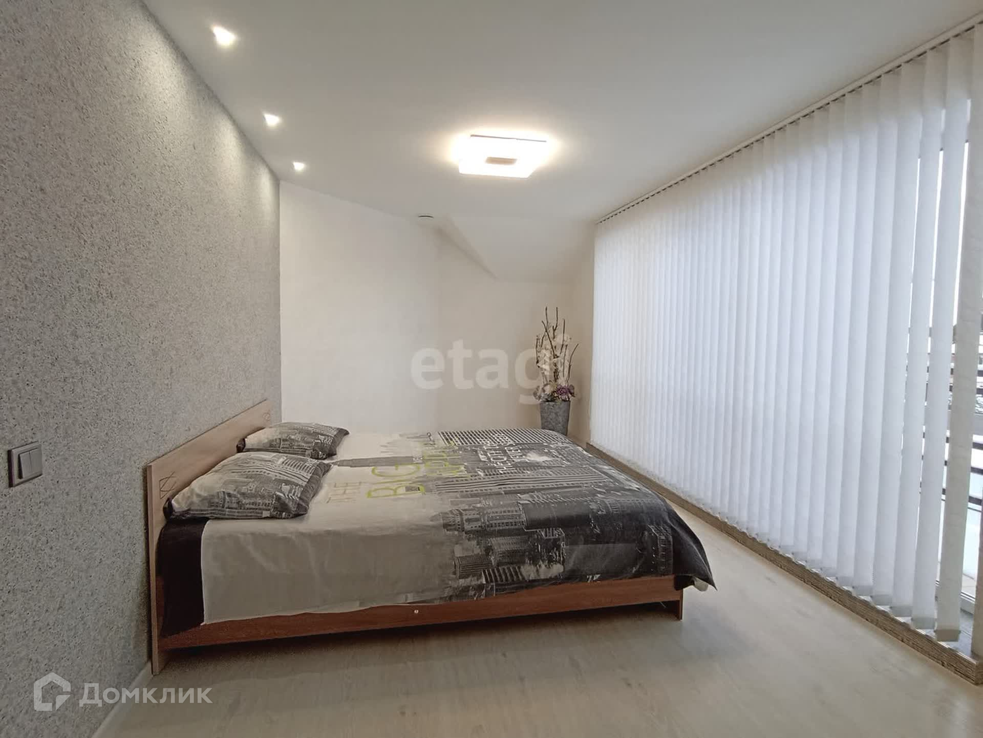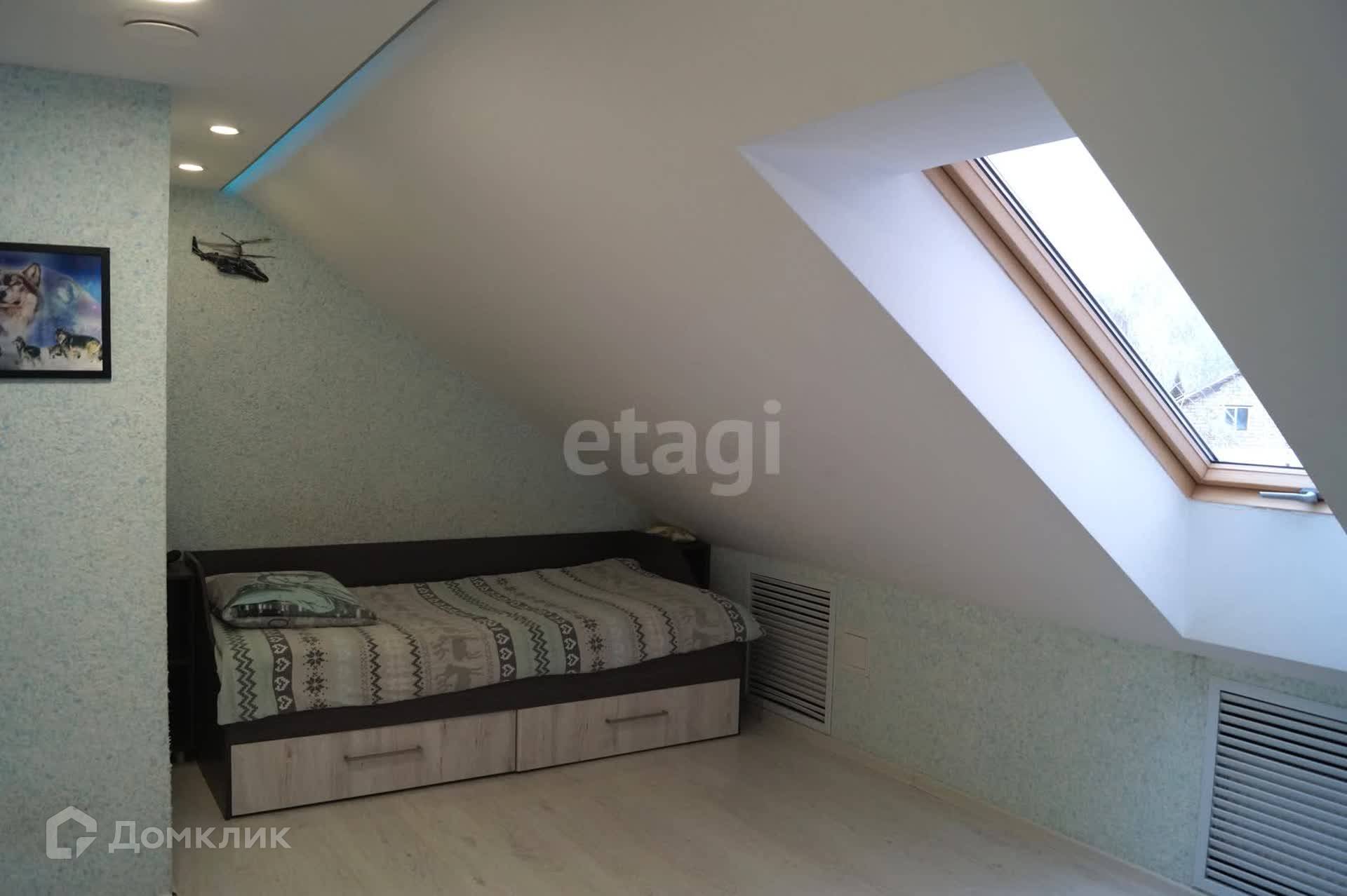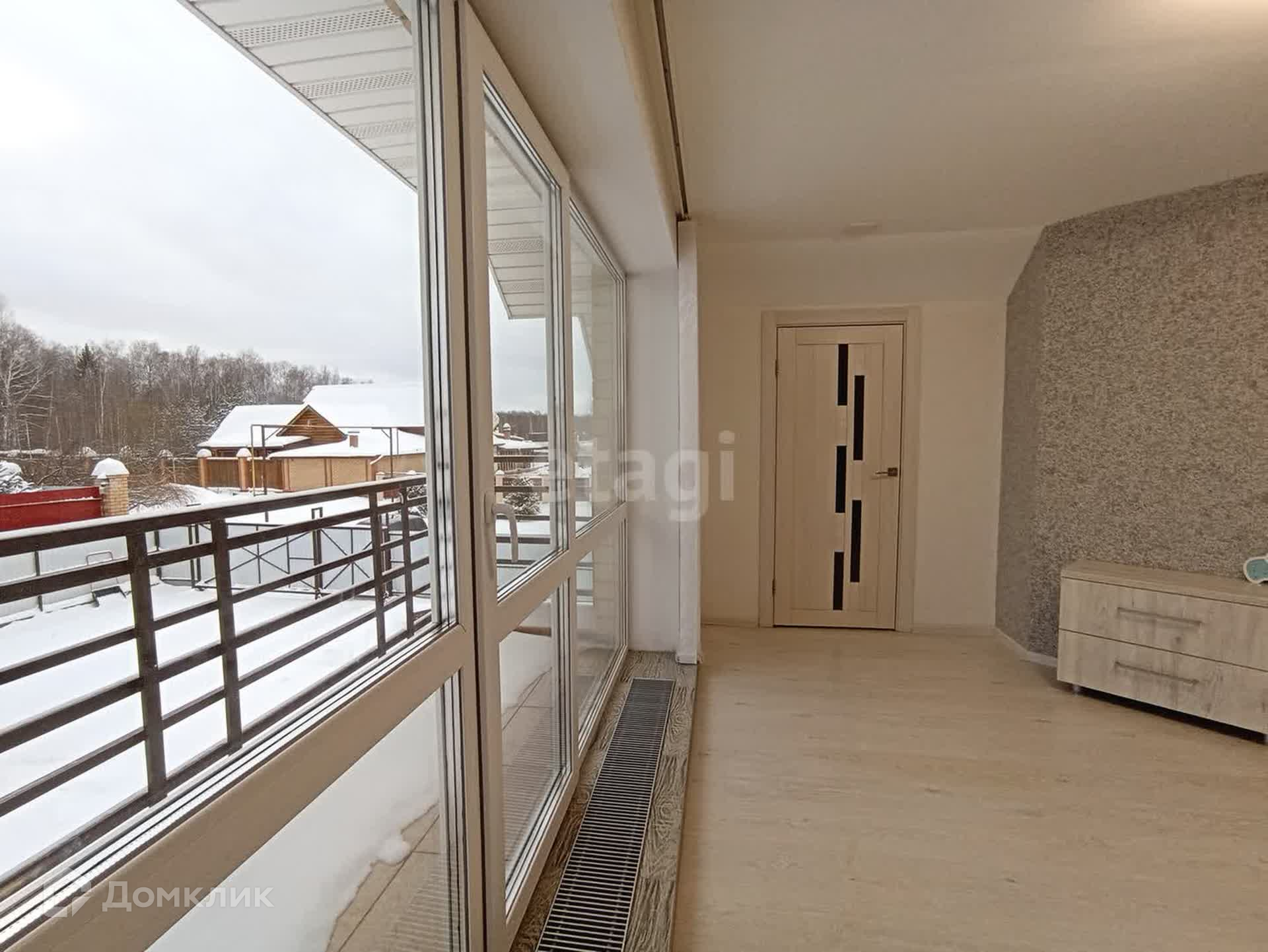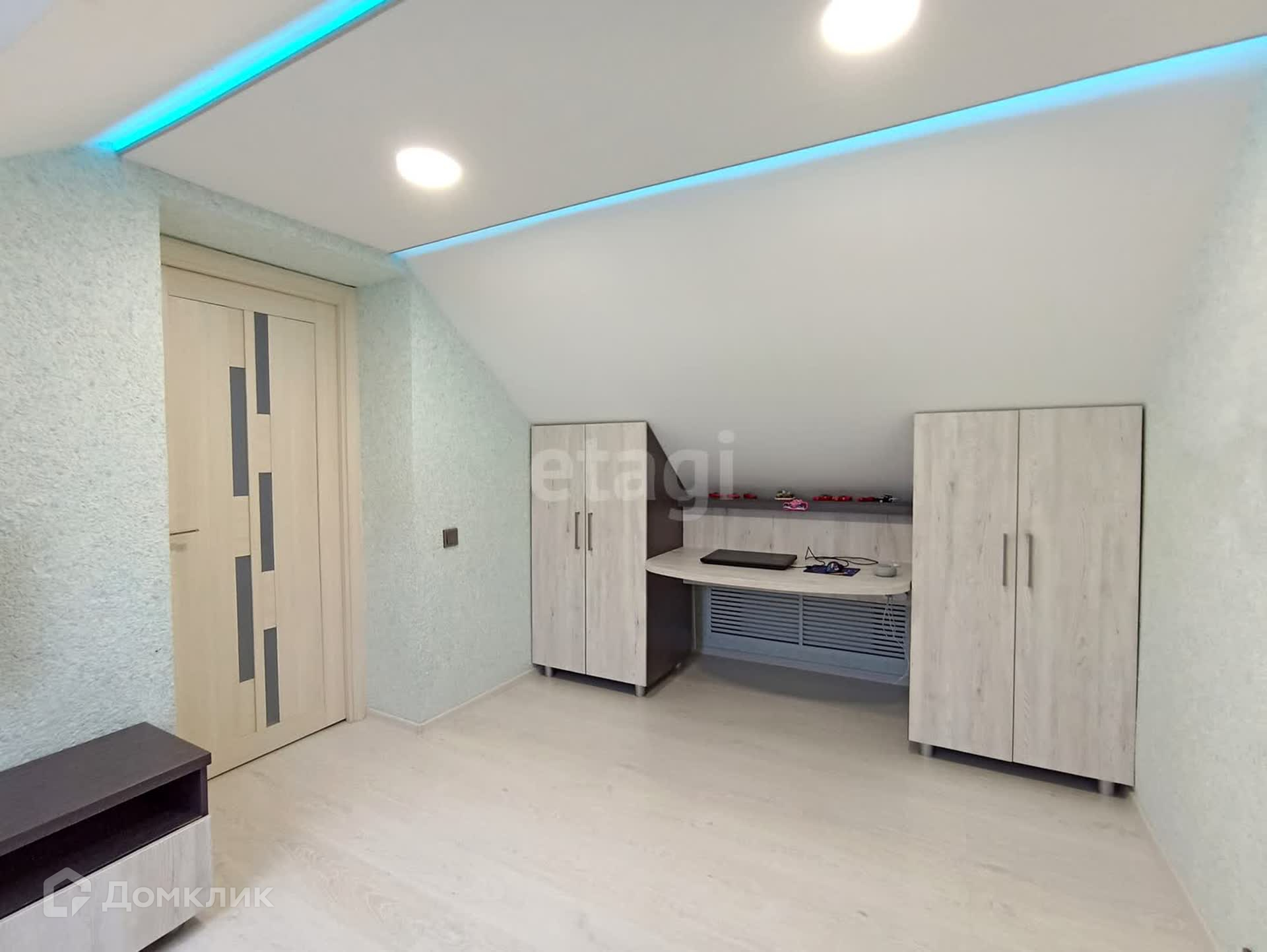 На втором этаже расположены две спальни с собственными гардеробными и балконами, детская комната и санузел. Панорамное остекление дает полноценно насладиться широким видом живописных окрестностей. Пол в комнатах устелен качественным ламинатом. В оформлении стен использованы жидкие обои. В санузле сделан теплый пол.