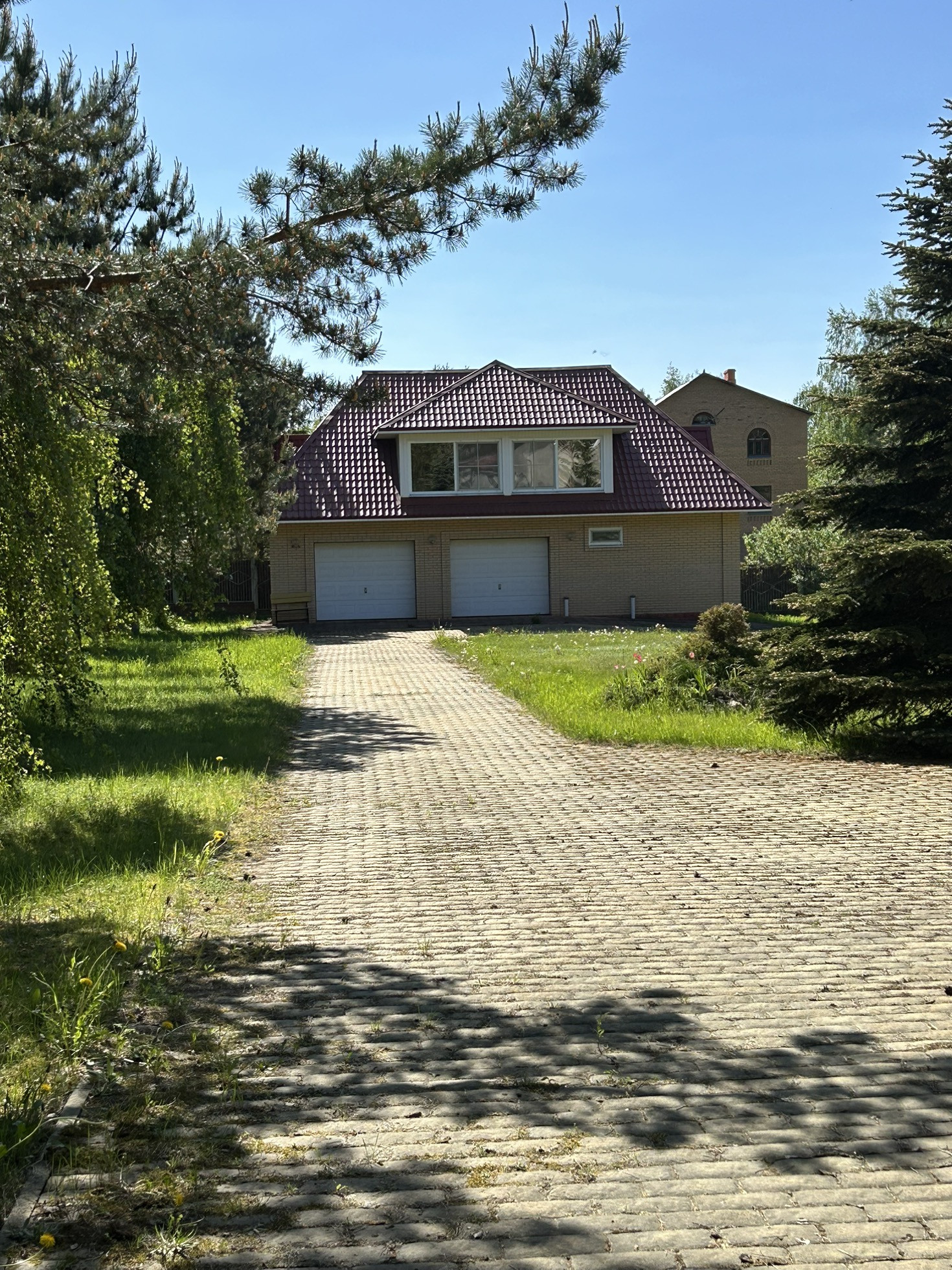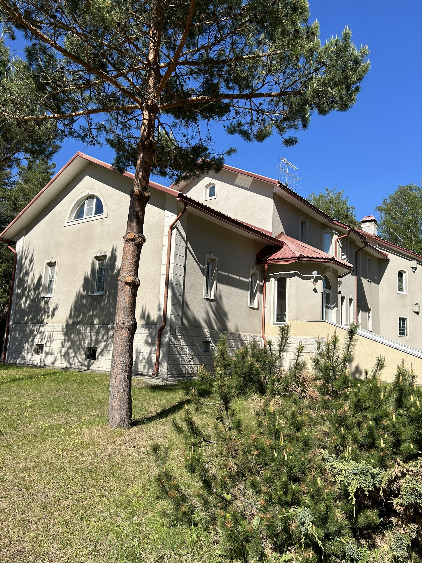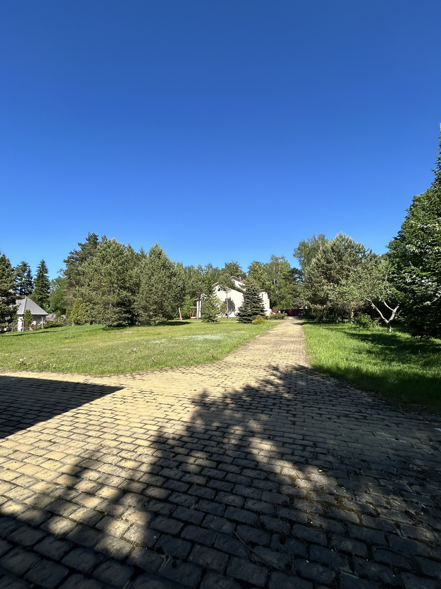 участок 52 сотки, на участке растут сосны, ели, плодоносящие яблони, сирень.