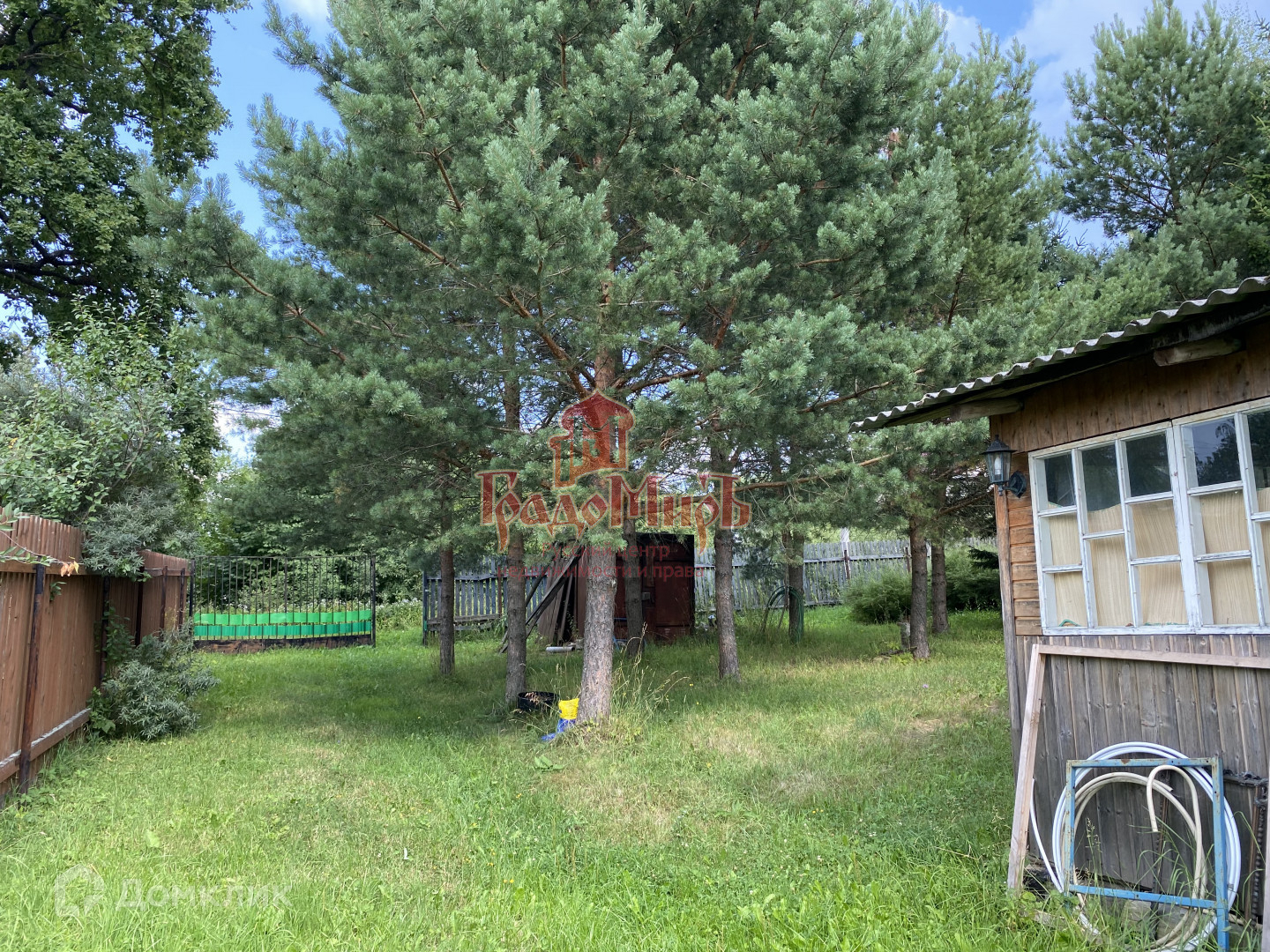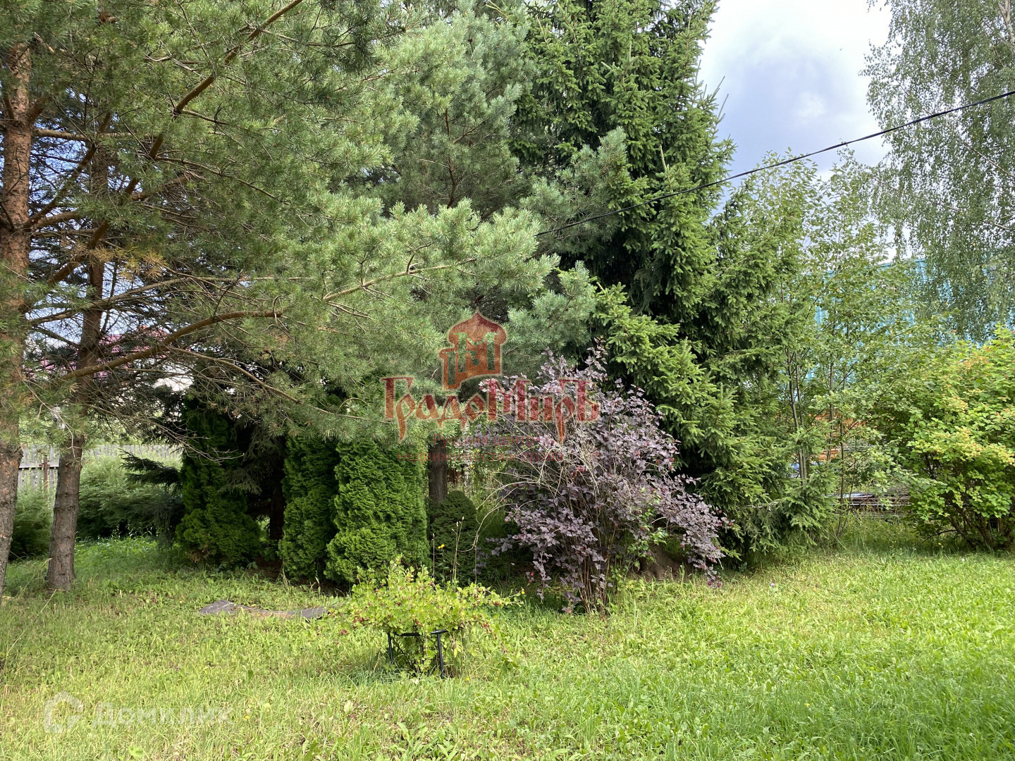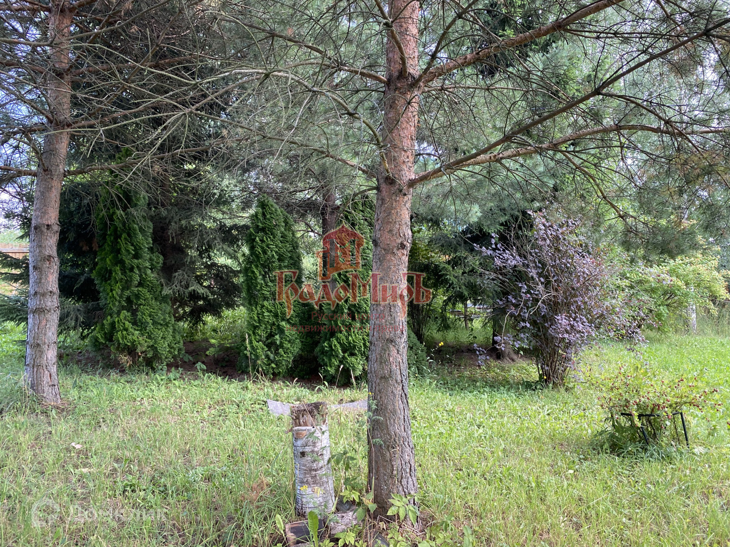 На участке растут сосны, ели, яблоня, туи, можжевельник и декоративные кустарники.