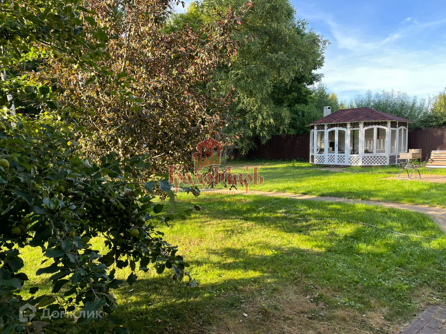 Ухоженный газон, взрослые деревья, создающие особую атмосферу, плодоносящие яблони.