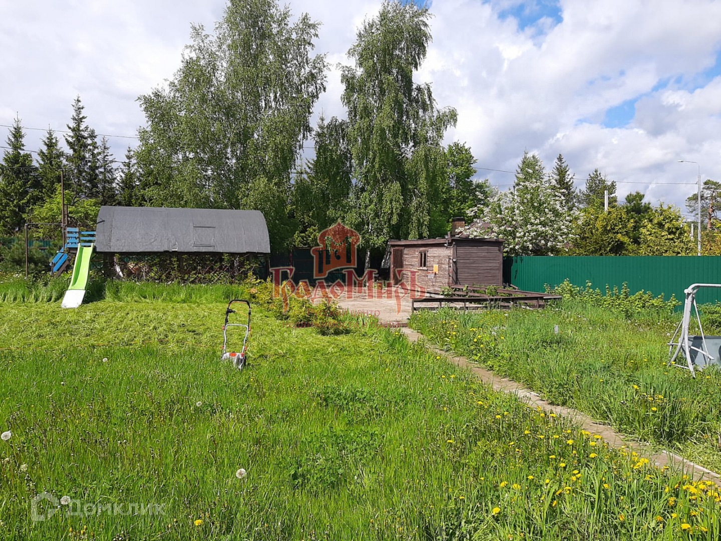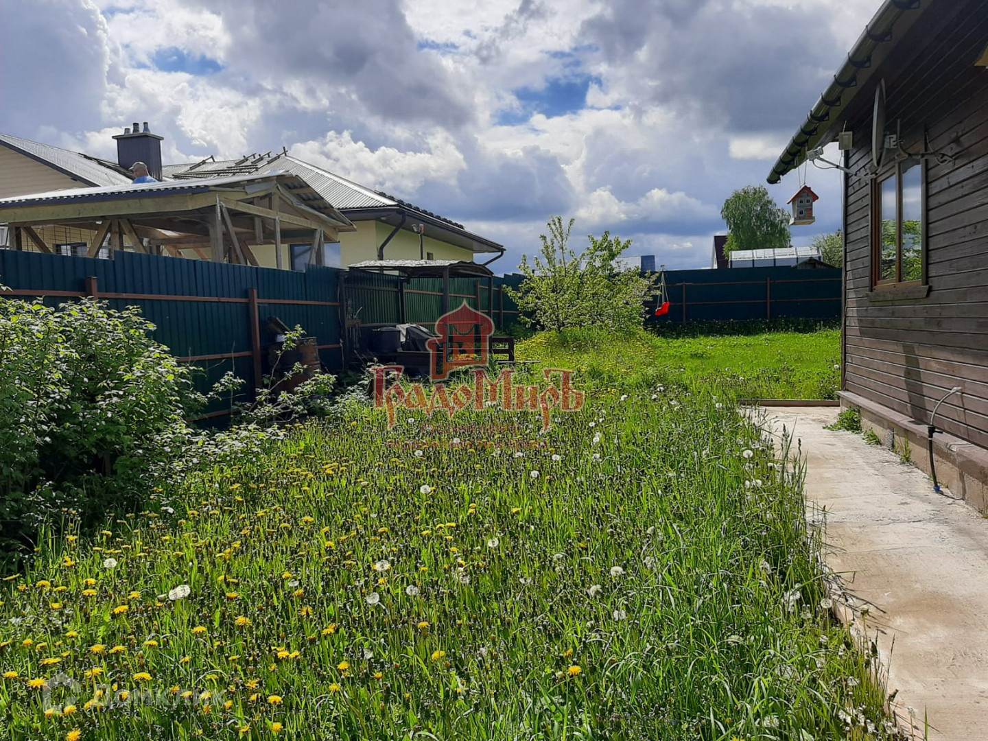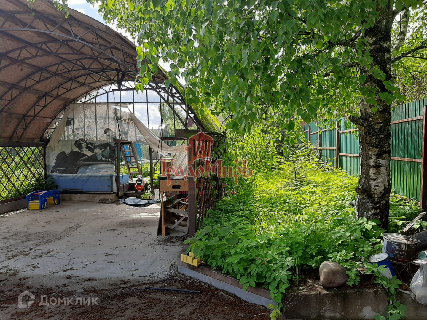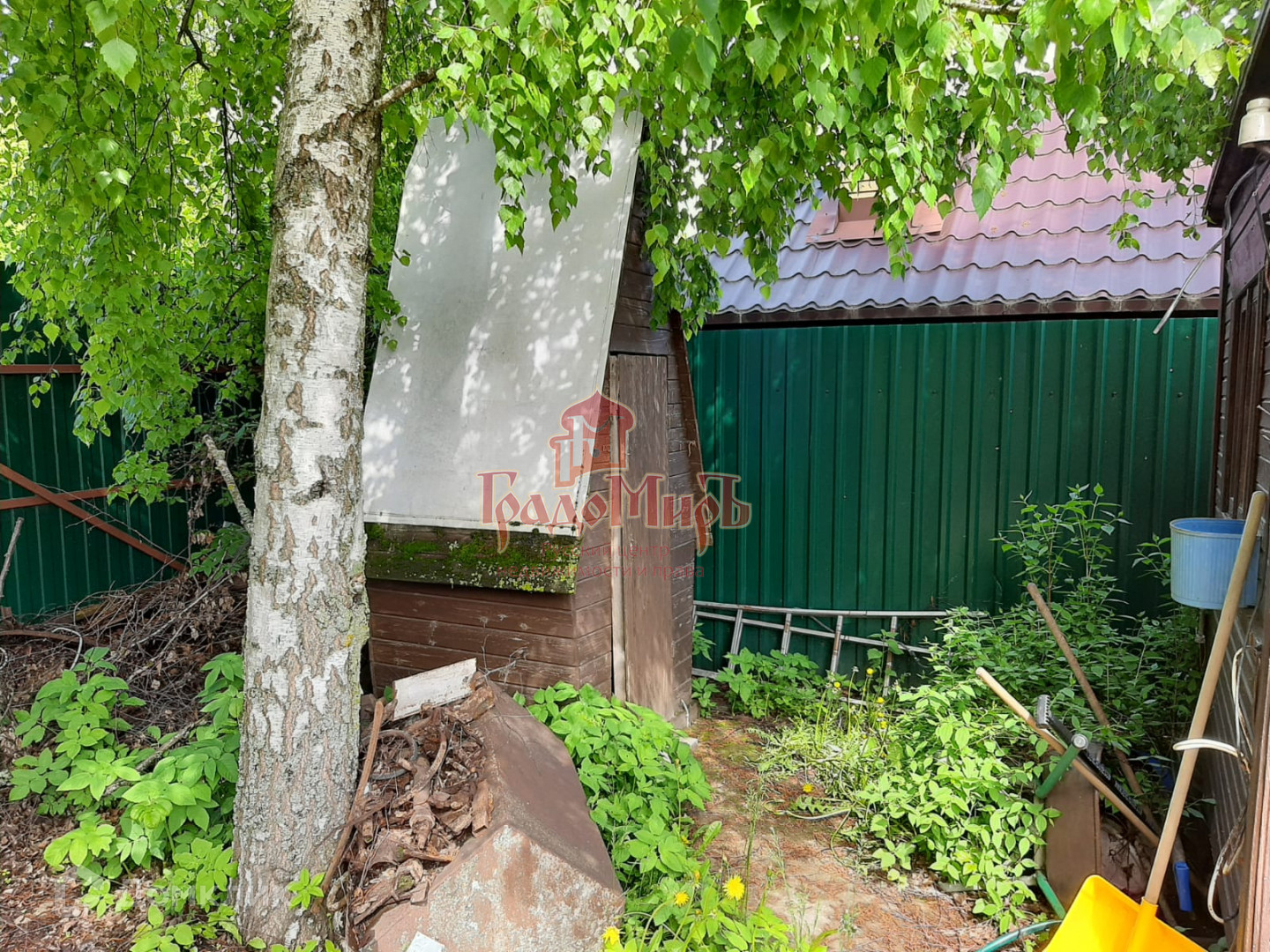 На участке есть навес на 2 машины, бытовка, уличный туалет. Сам участок ровный, с садовыми деревьями и кустарниками. По периметру участок огорожен забором из профнастила.