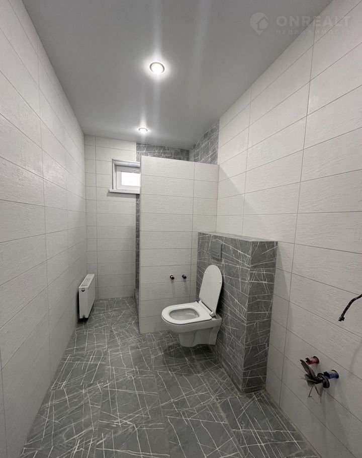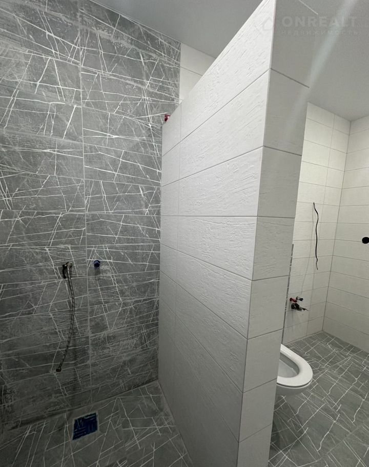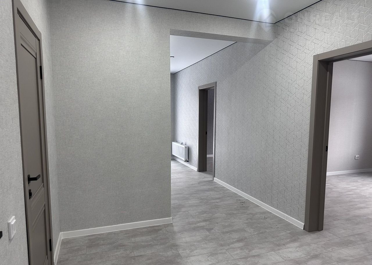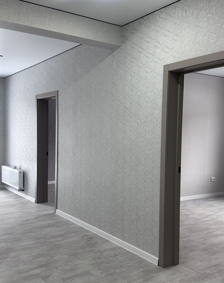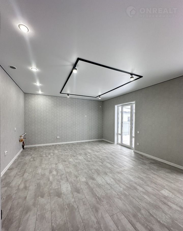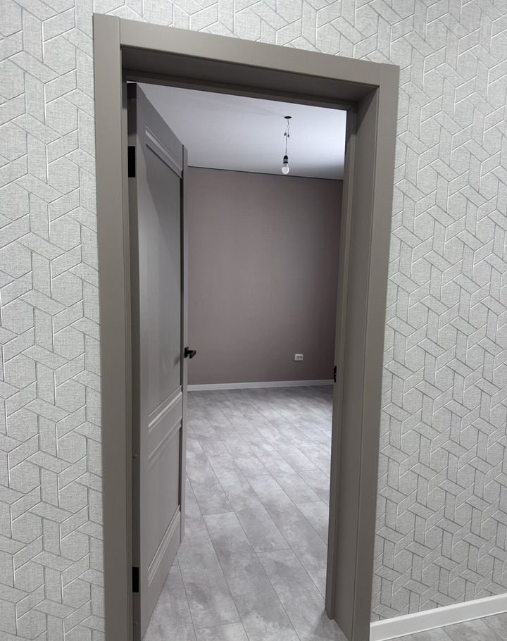 Потолки натяжные с точечными светильниками, на полу ламинат, на стенах обои. Двери установлены, надежная входная дверь. Санузел в плитке, установлен унитаз.
