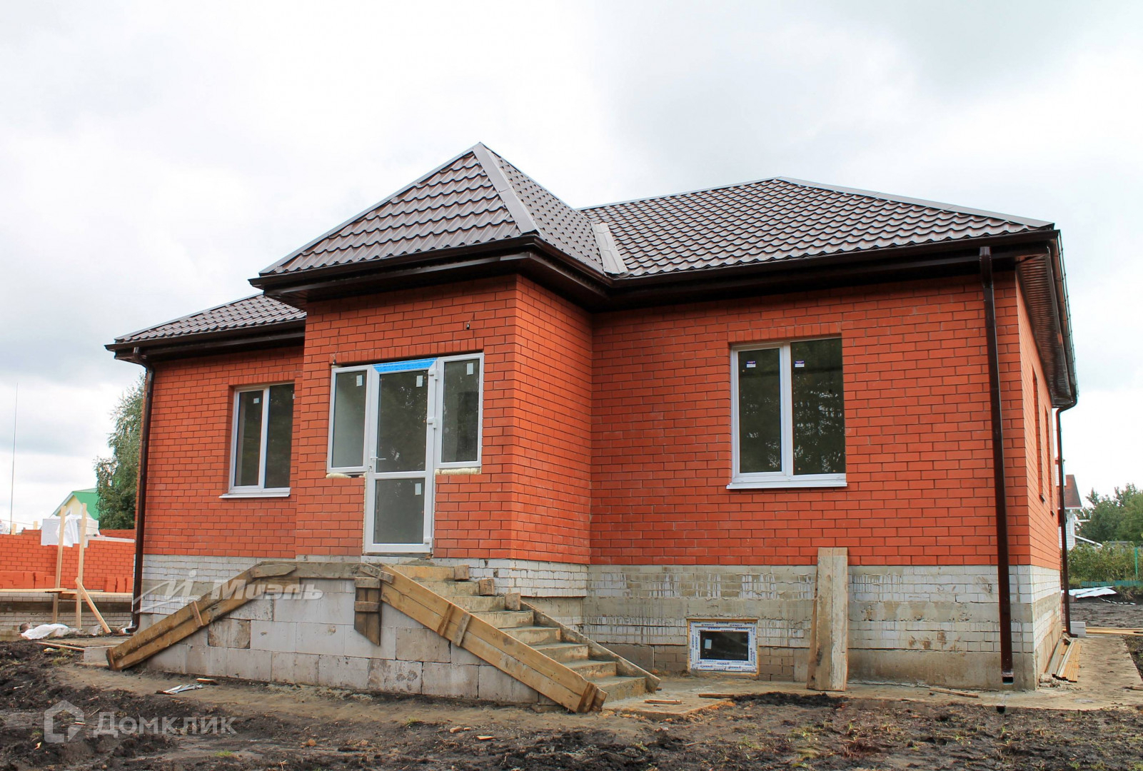 Сам дом из пеноблока, облицован красным кирпичом, стоит на крепком блочном фундаменте, крыша покрыта металлопрофилем.
