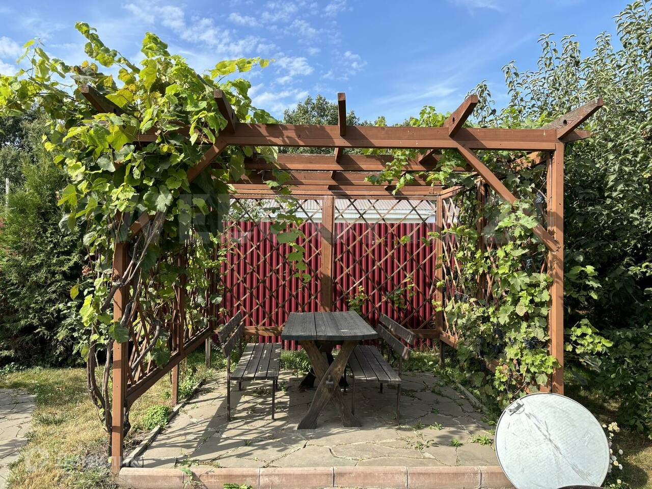 На участке 10 сот разместились вместительный гараж, мастерская, двухэтажная баня, зона барбекю и летняя беседка.
