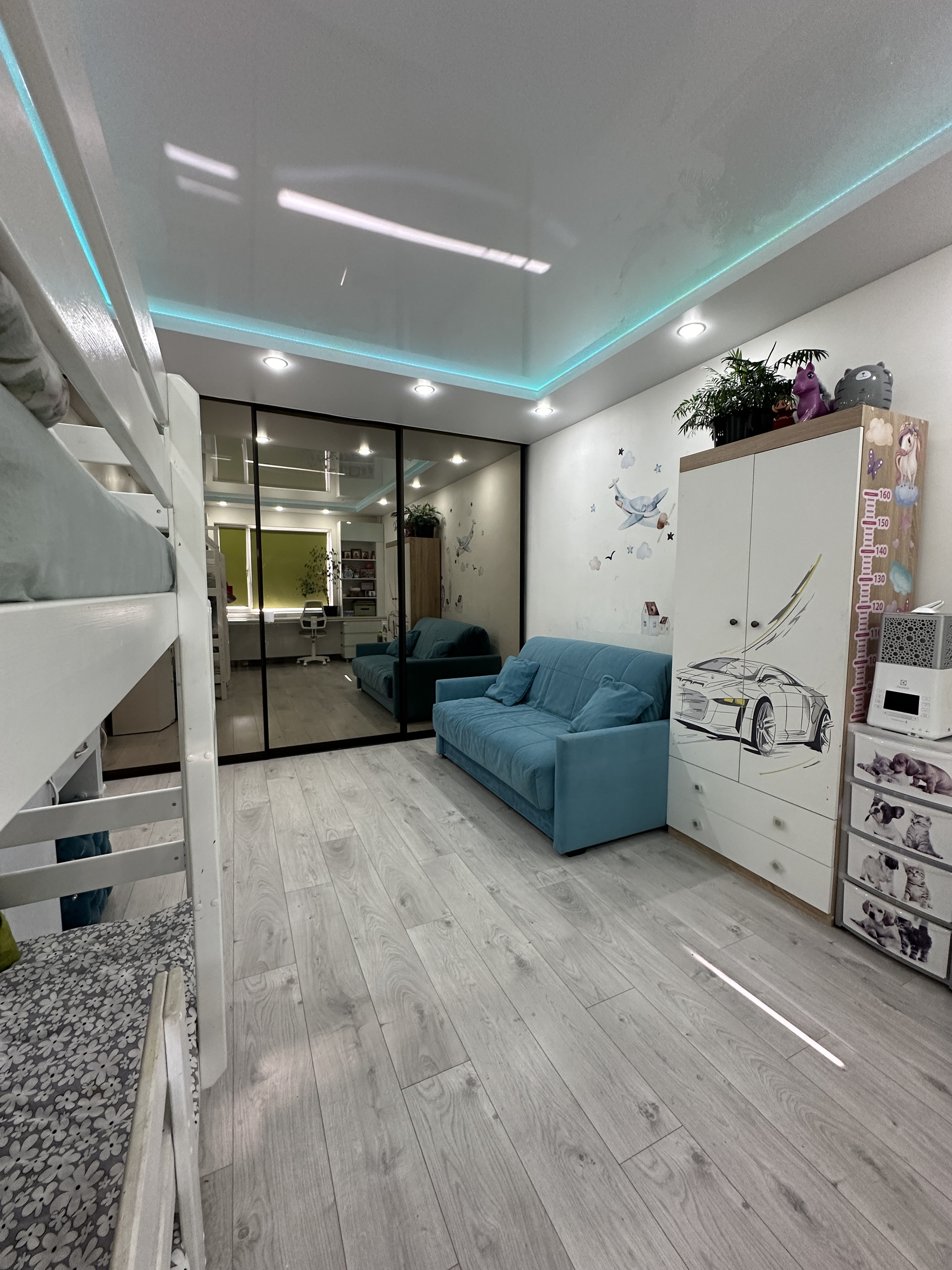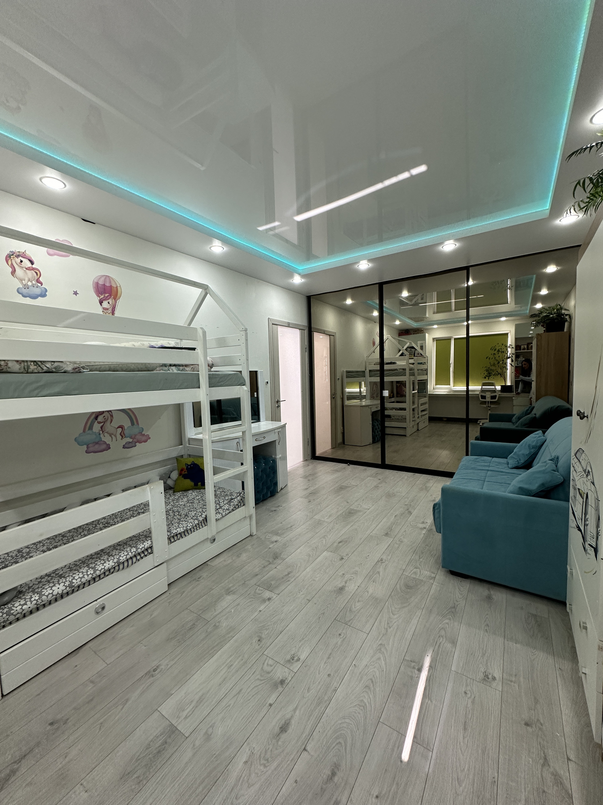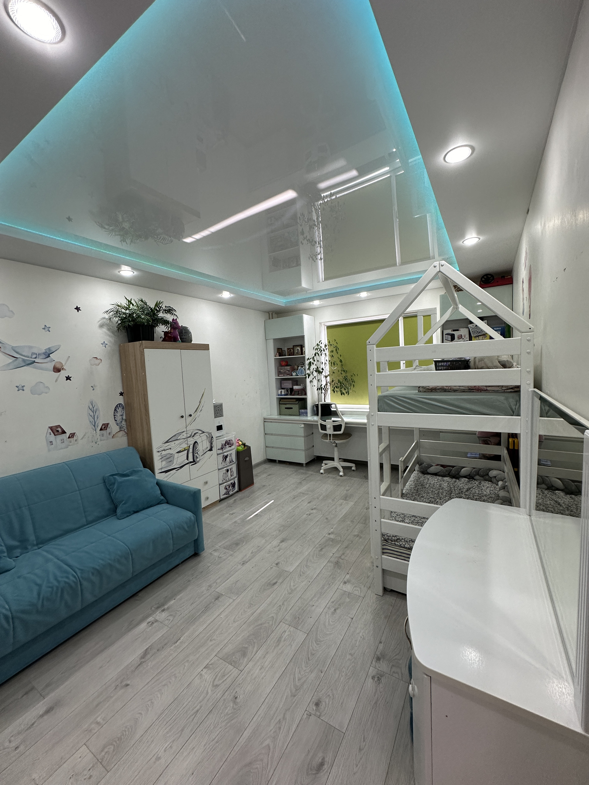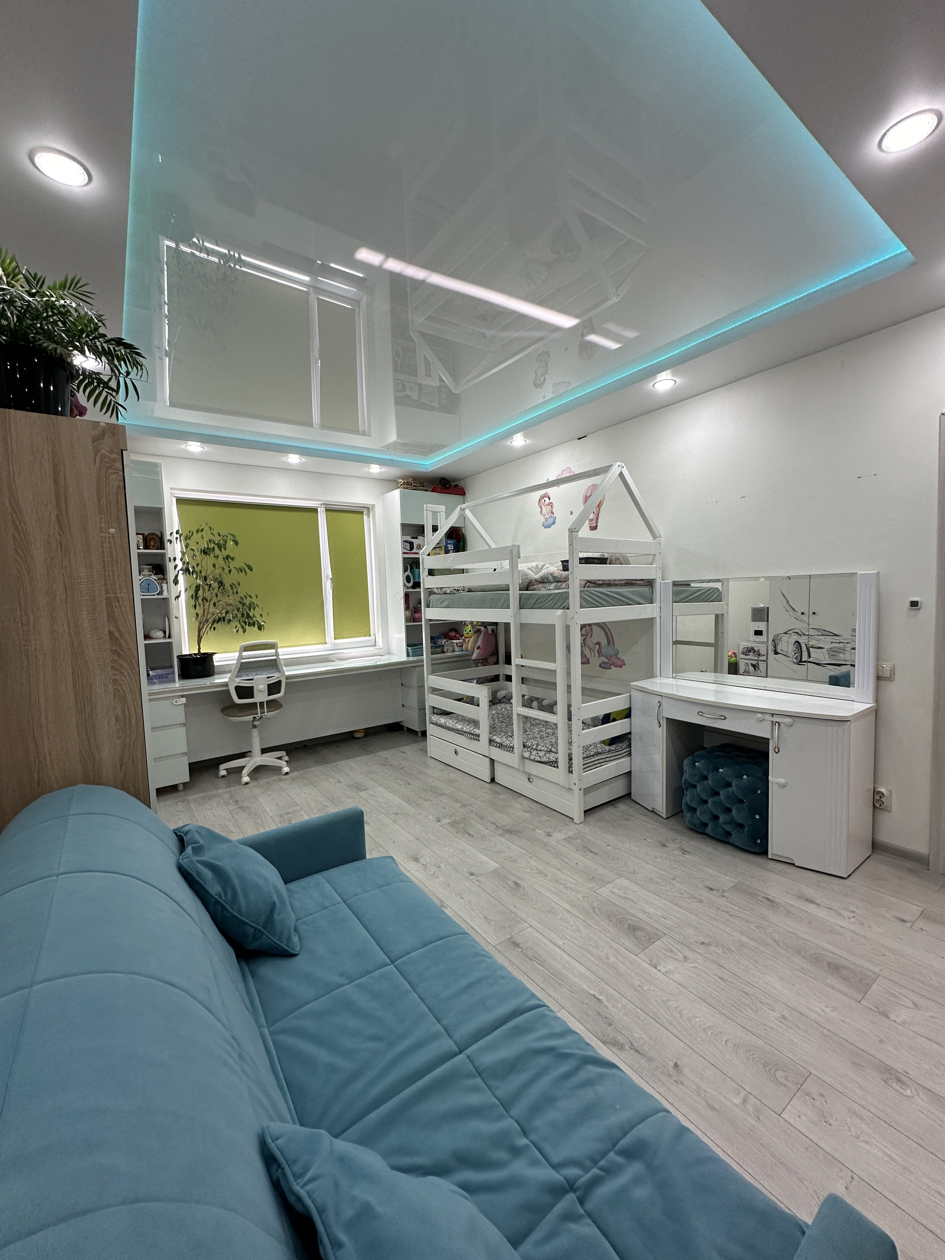 В спальне многоуровневый потолок с цветной подсветкой, большой стол и встроенный шкаф с местами хранения. Видео наблюдение