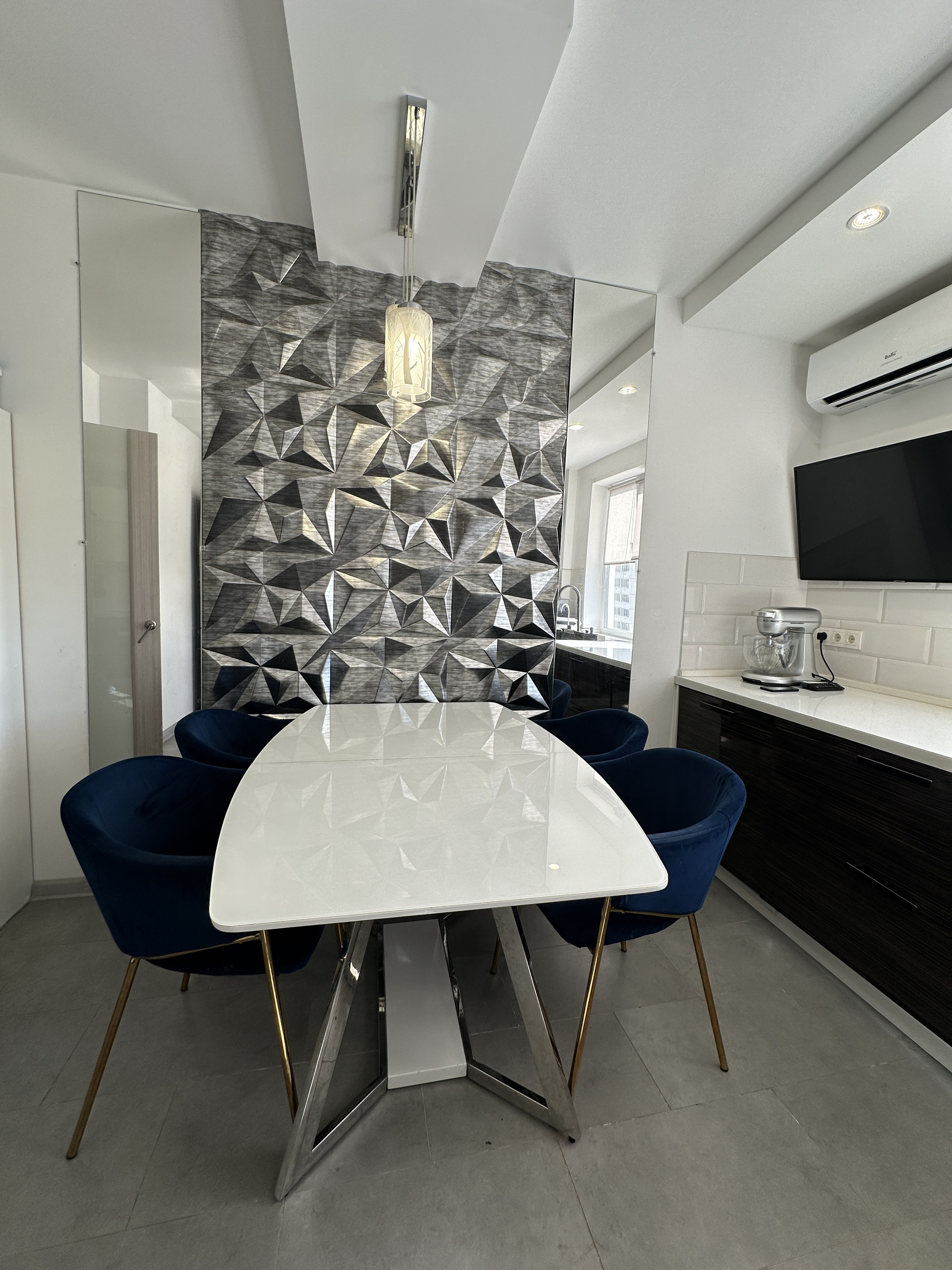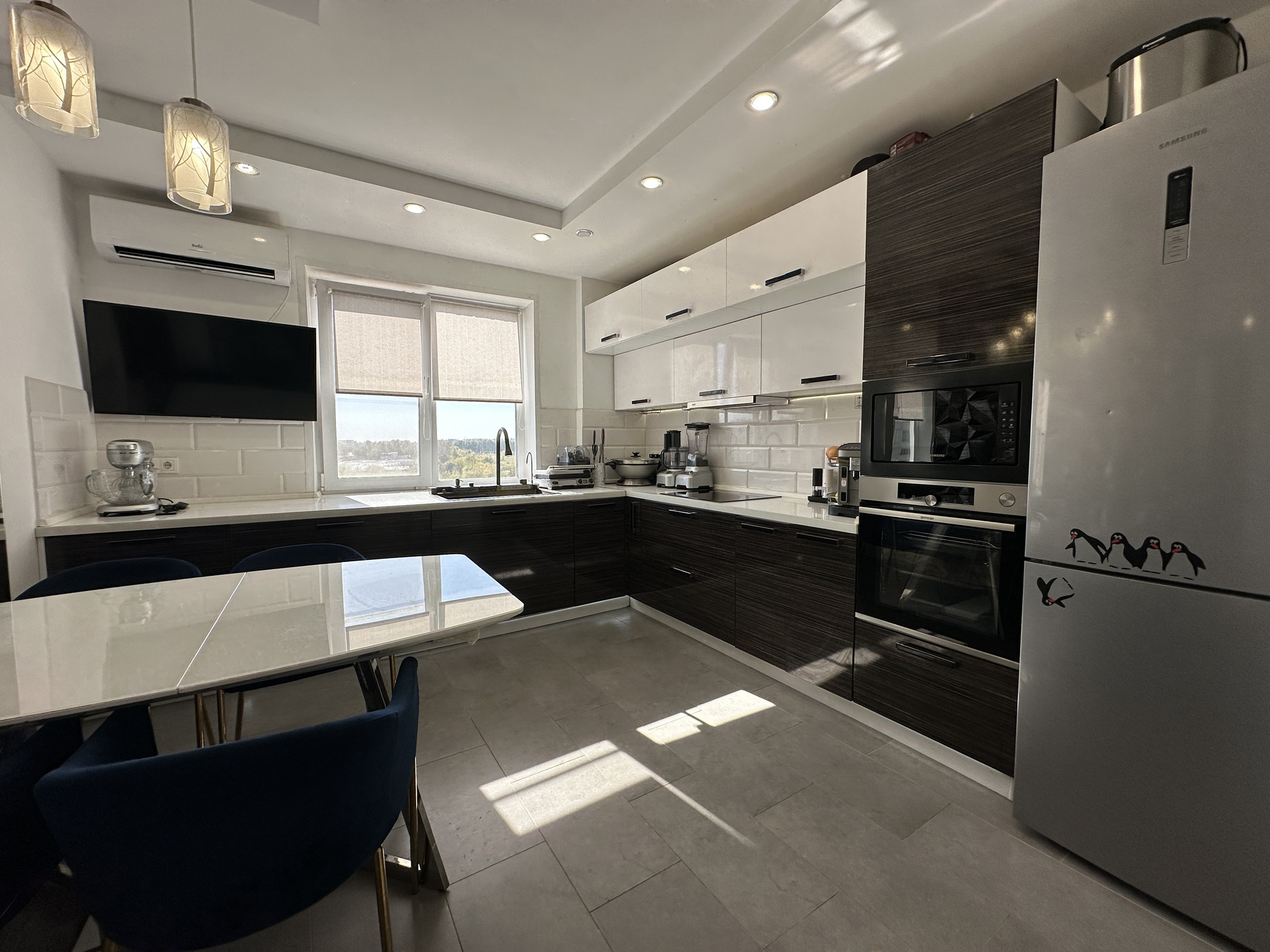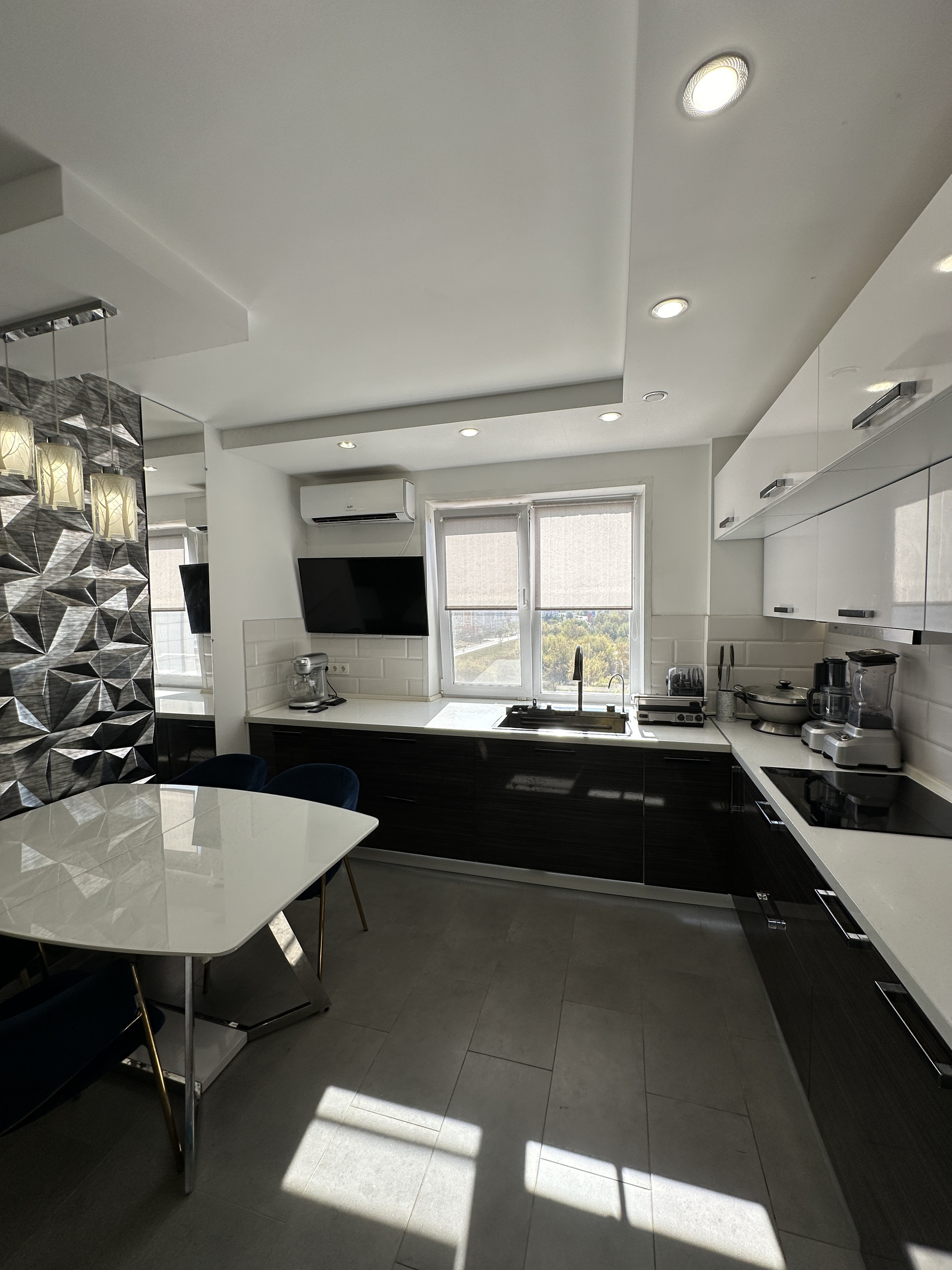 Далее кухня со столешницей 5 погонных метра. Встроенные посудомойка, стиралка, духовой шкаф, индукционная плита, многофункциональная мойка, микроволновка. Измельчитель бытовых отходов, 4 сценария освещения и подсветки, кондиционер, телевизор 42 диагональ. Холодильник, стильная обеденная зона. За дверью пылесос Dyson и стеллаж для хранения бытовой техники.