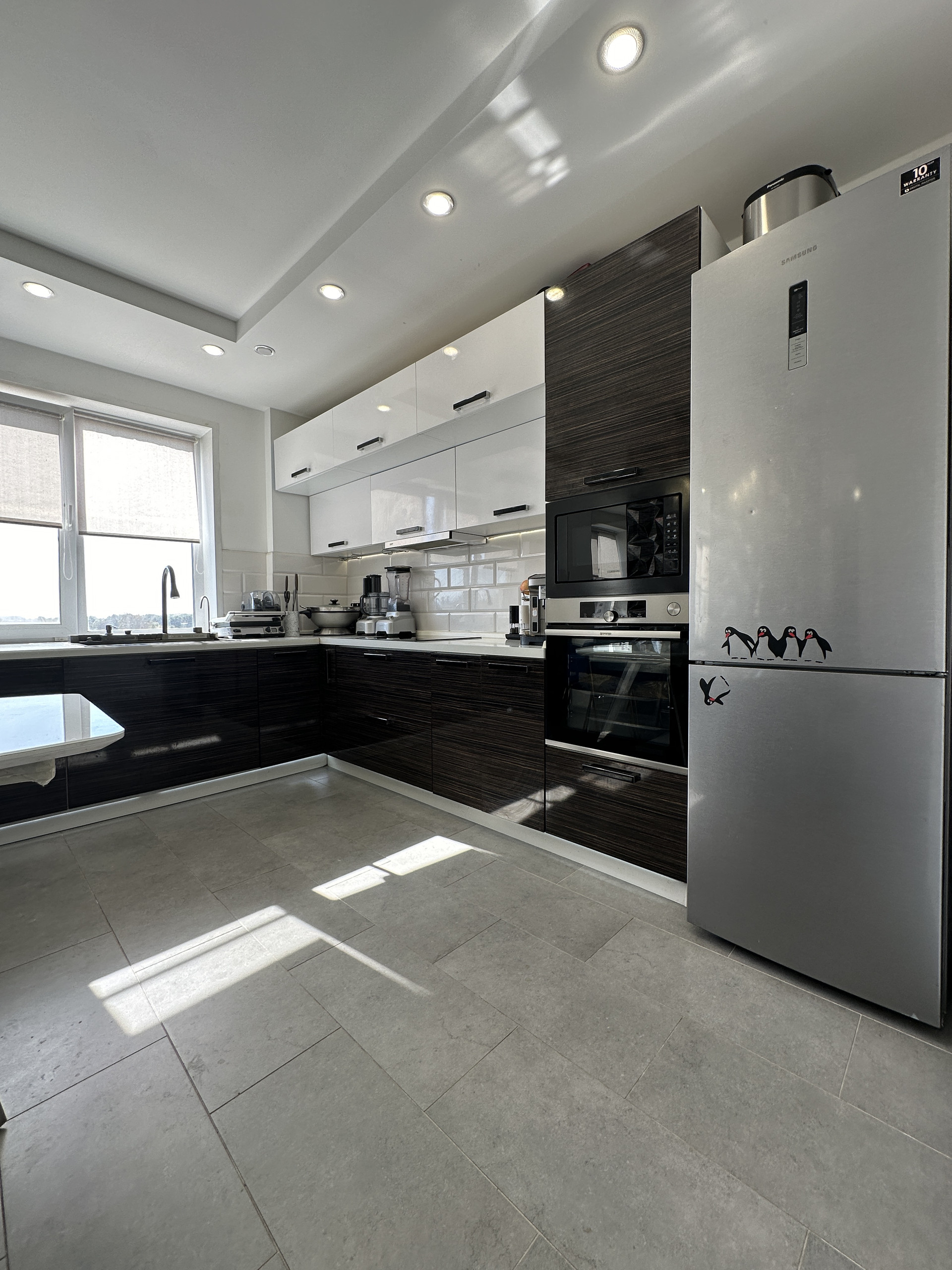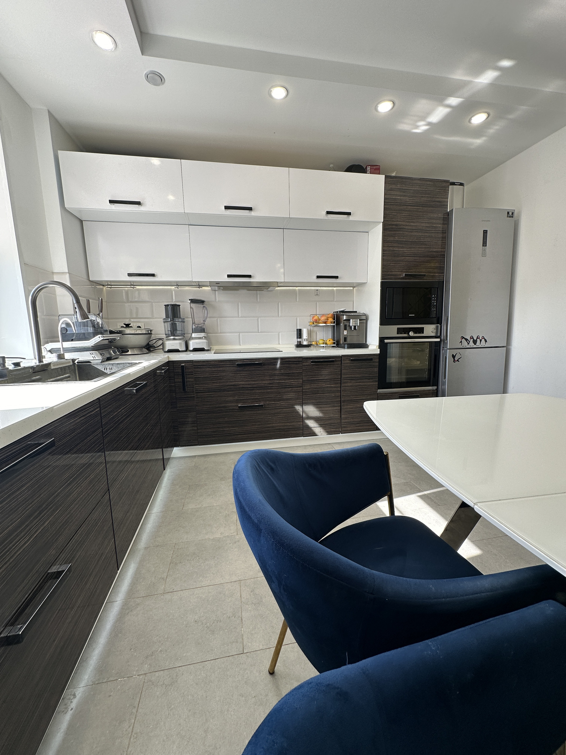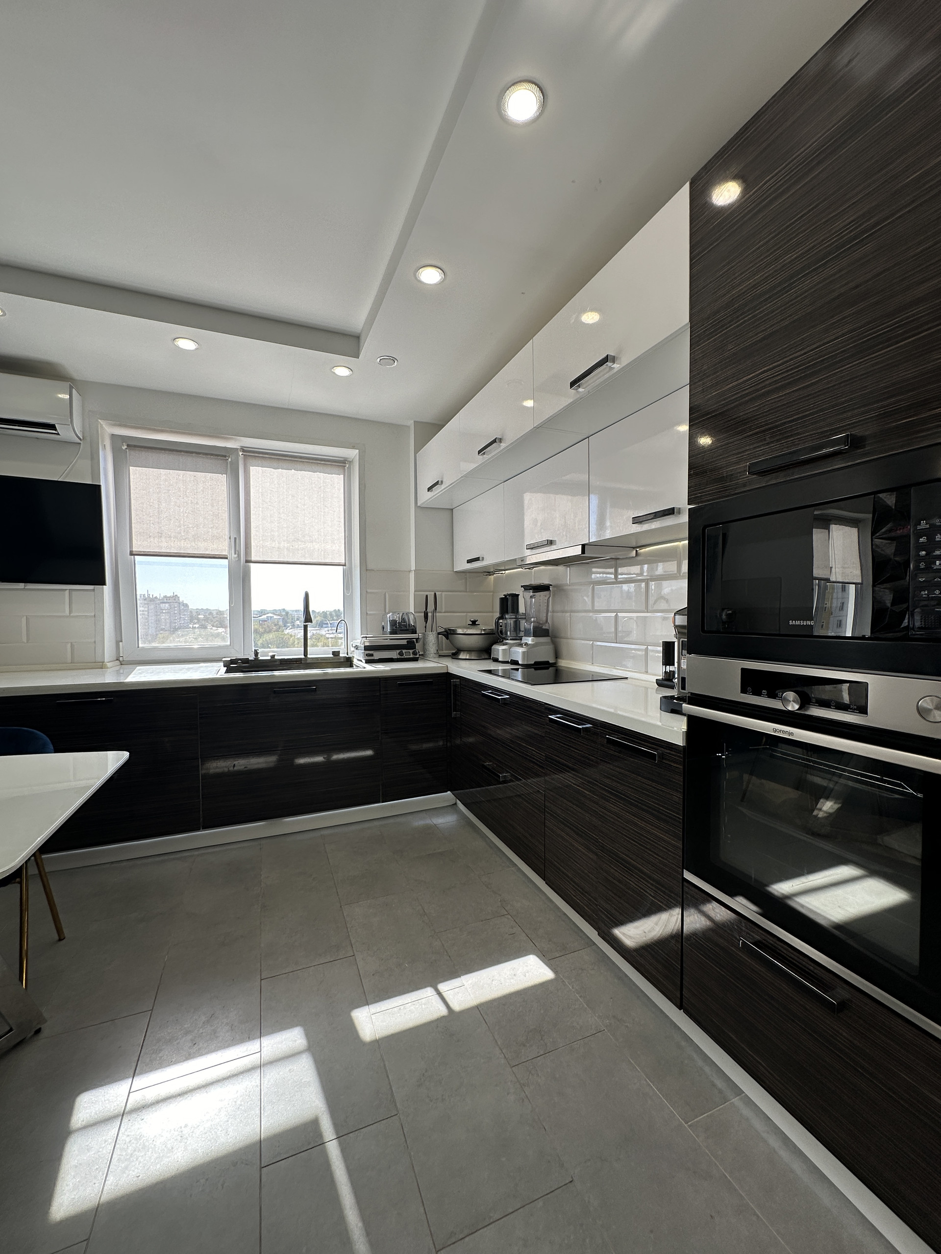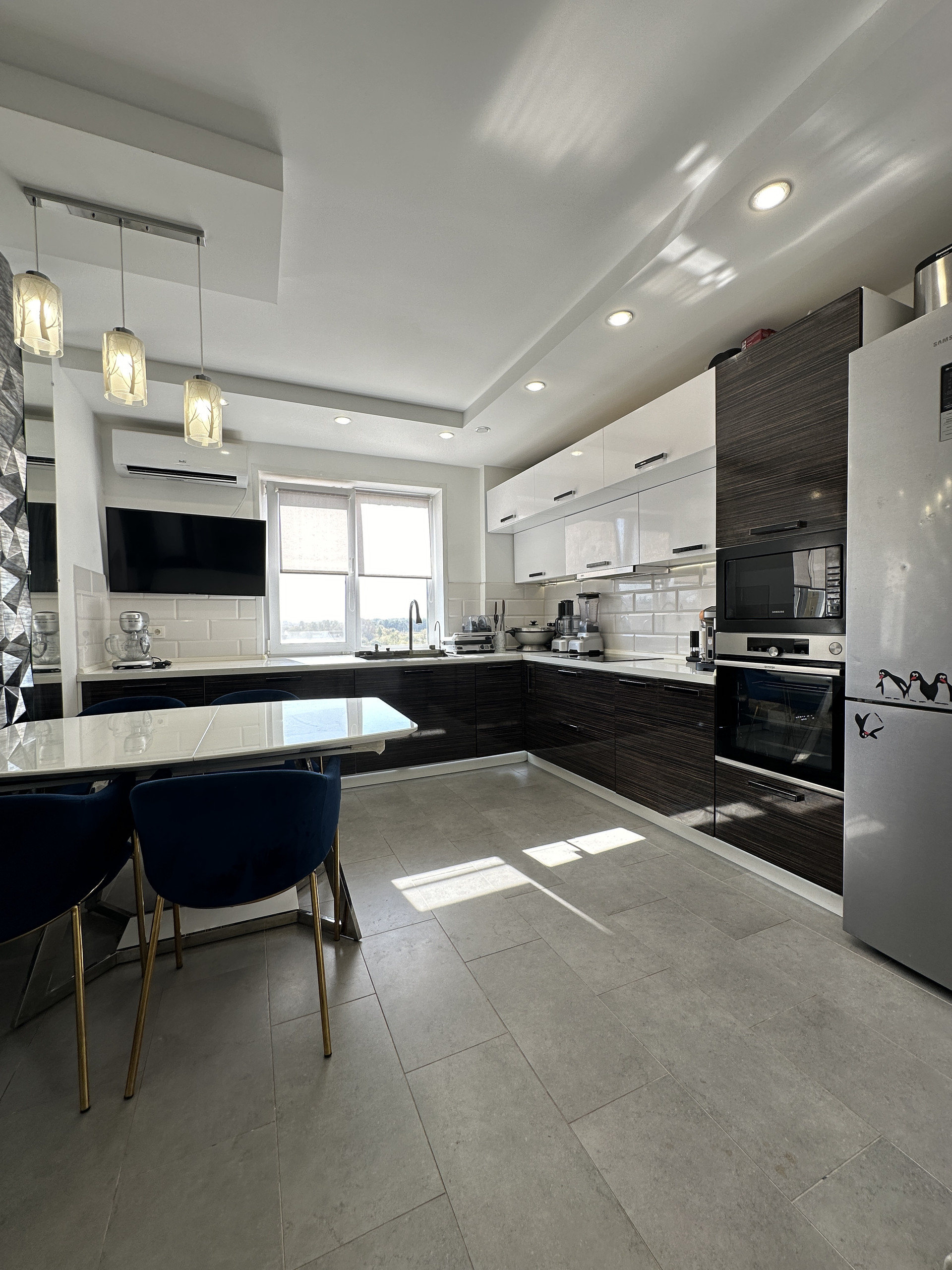 Далее кухня со столешницей 5 погонных метра. Встроенные посудомойка, стиралка, духовой шкаф, индукционная плита, многофункциональная мойка, микроволновка. Измельчитель бытовых отходов, 4 сценария освещения и подсветки, кондиционер, телевизор 42 диагональ. Холодильник, стильная обеденная зона. За дверью пылесос Dyson и стеллаж для хранения бытовой техники.