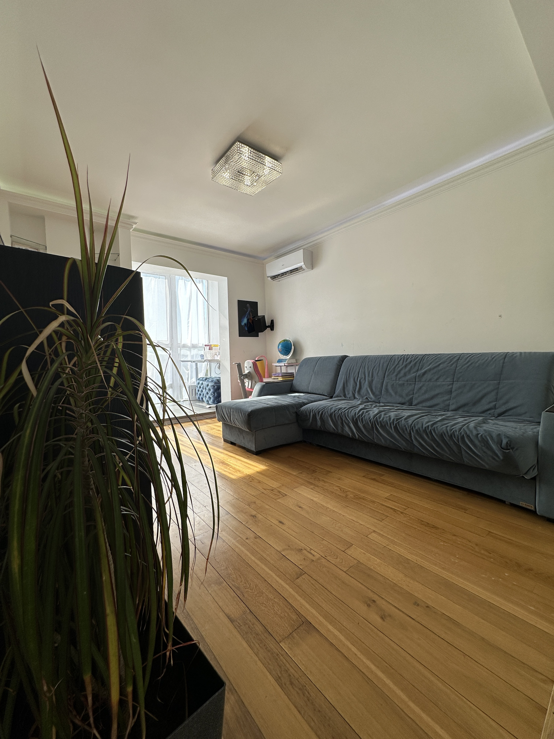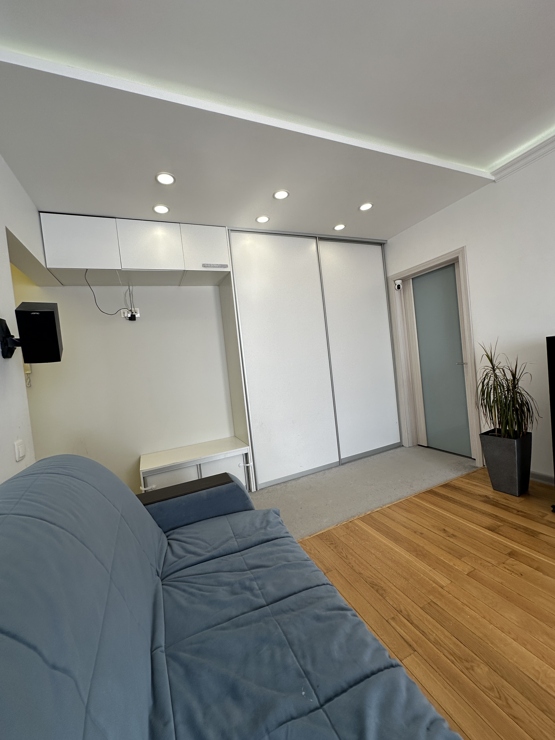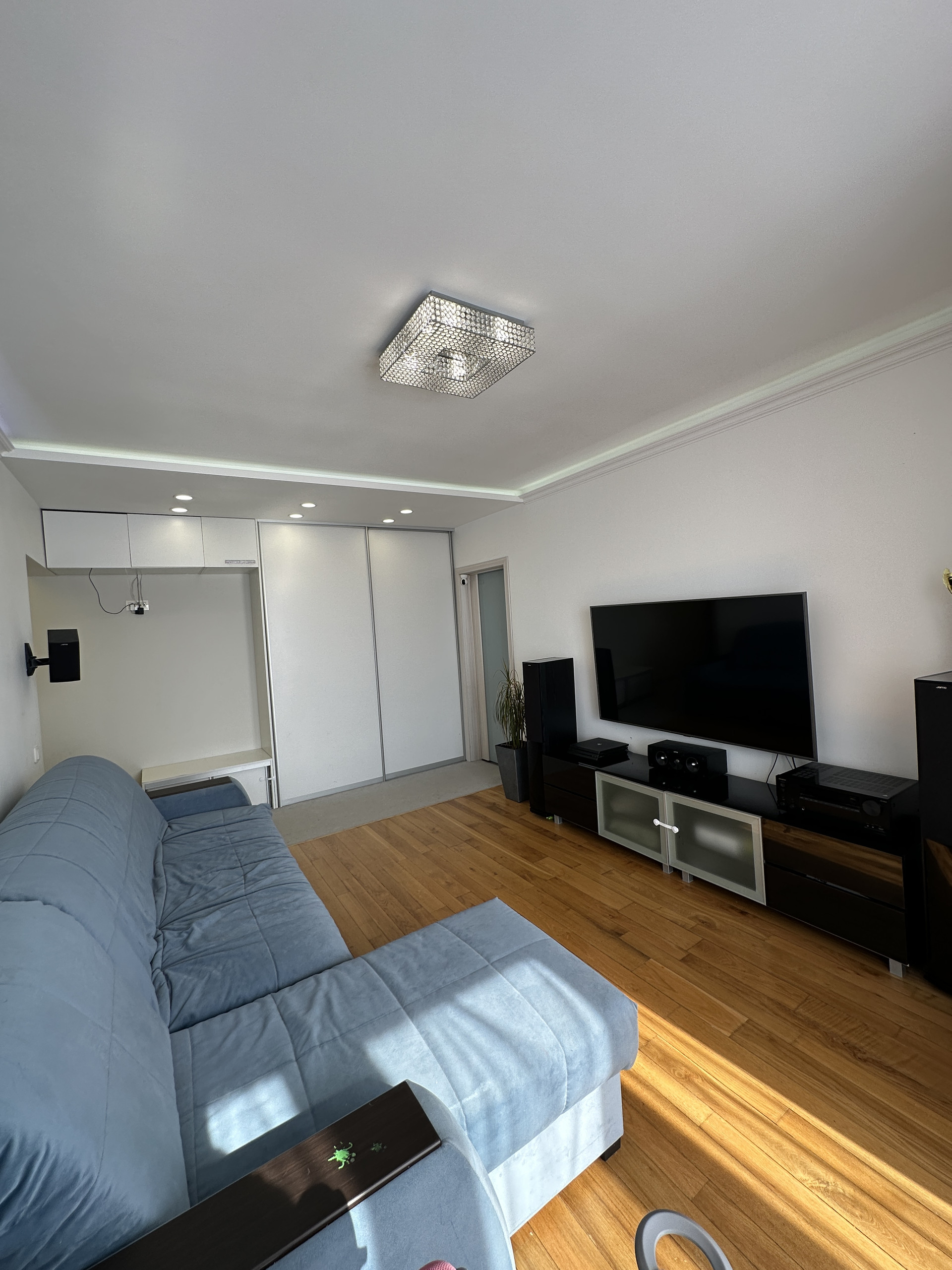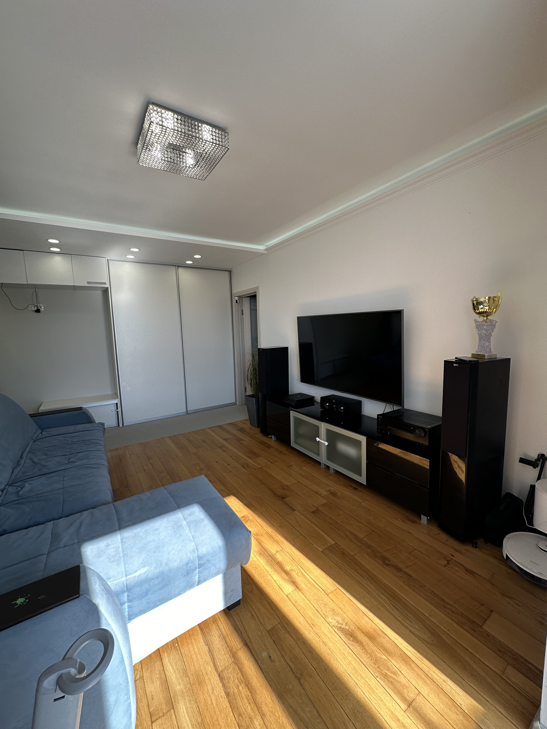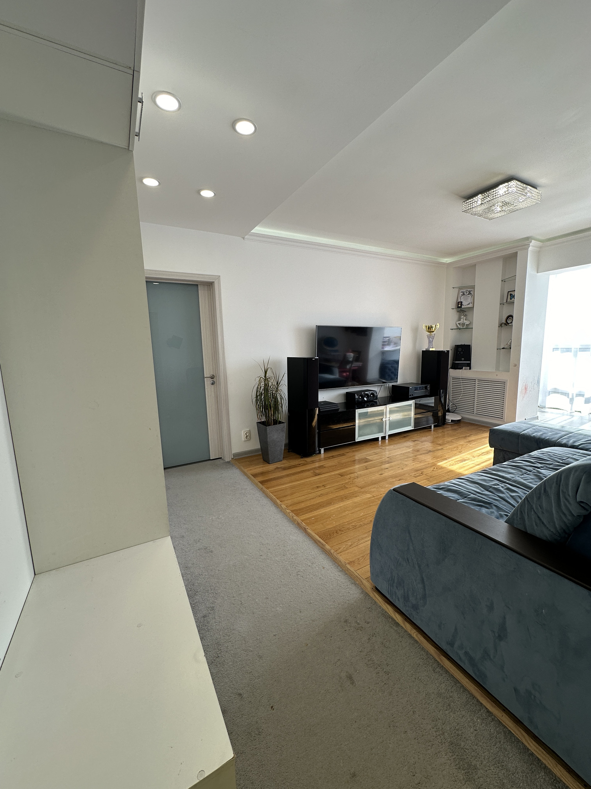 Зал или гостиная со встроенным шкафом для верхней одежды и кондиционером . На полу массив экслюзивного дубового паркета, потолок с диодной подсветкой. Теплое панорамное остекление с видом на 53-ю школу.
