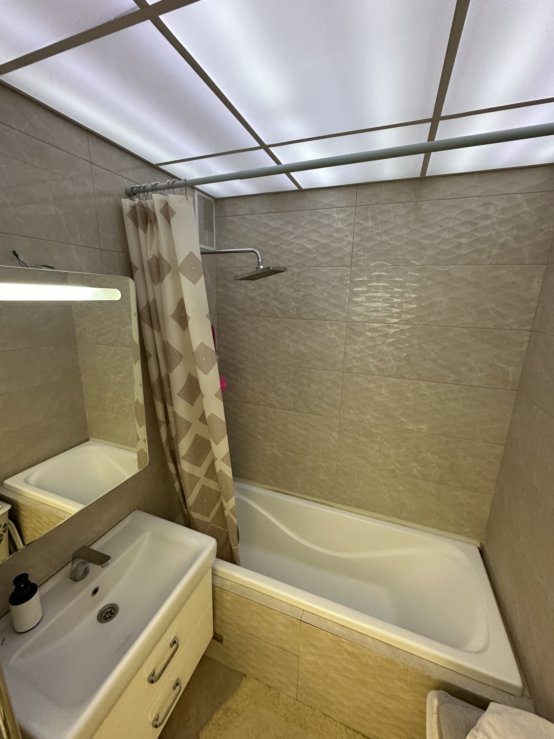 В ванной комнате есть: ванна 1,7 м, тропический душ, шкаф для хранения, полотенцесушитель, раковина 60 см с сенсорным рукомойником. Зеркало с подсветкой и местом хранения, потолок из акрилового стекла с RGBW подсветкой ( цветная + белая)