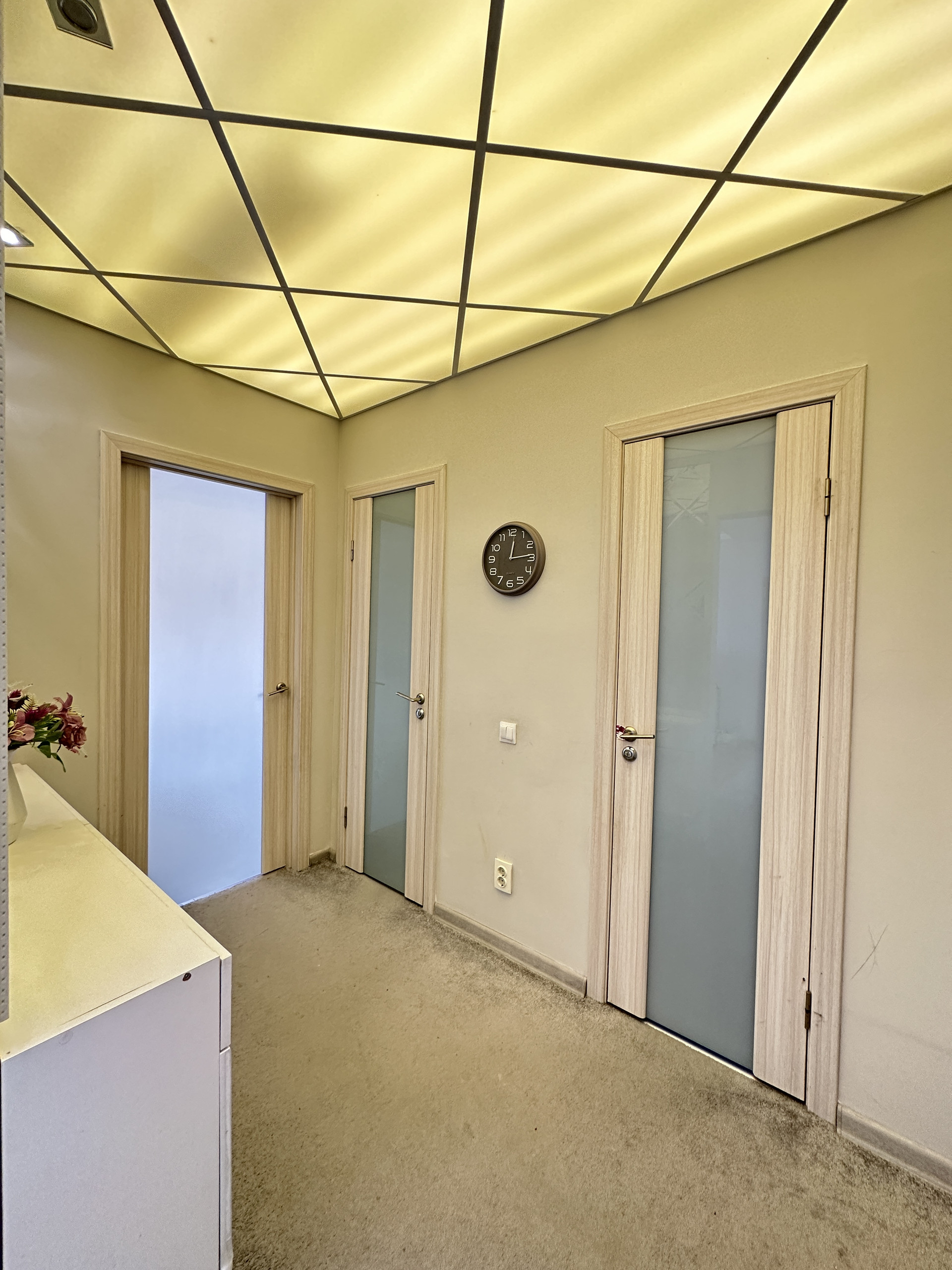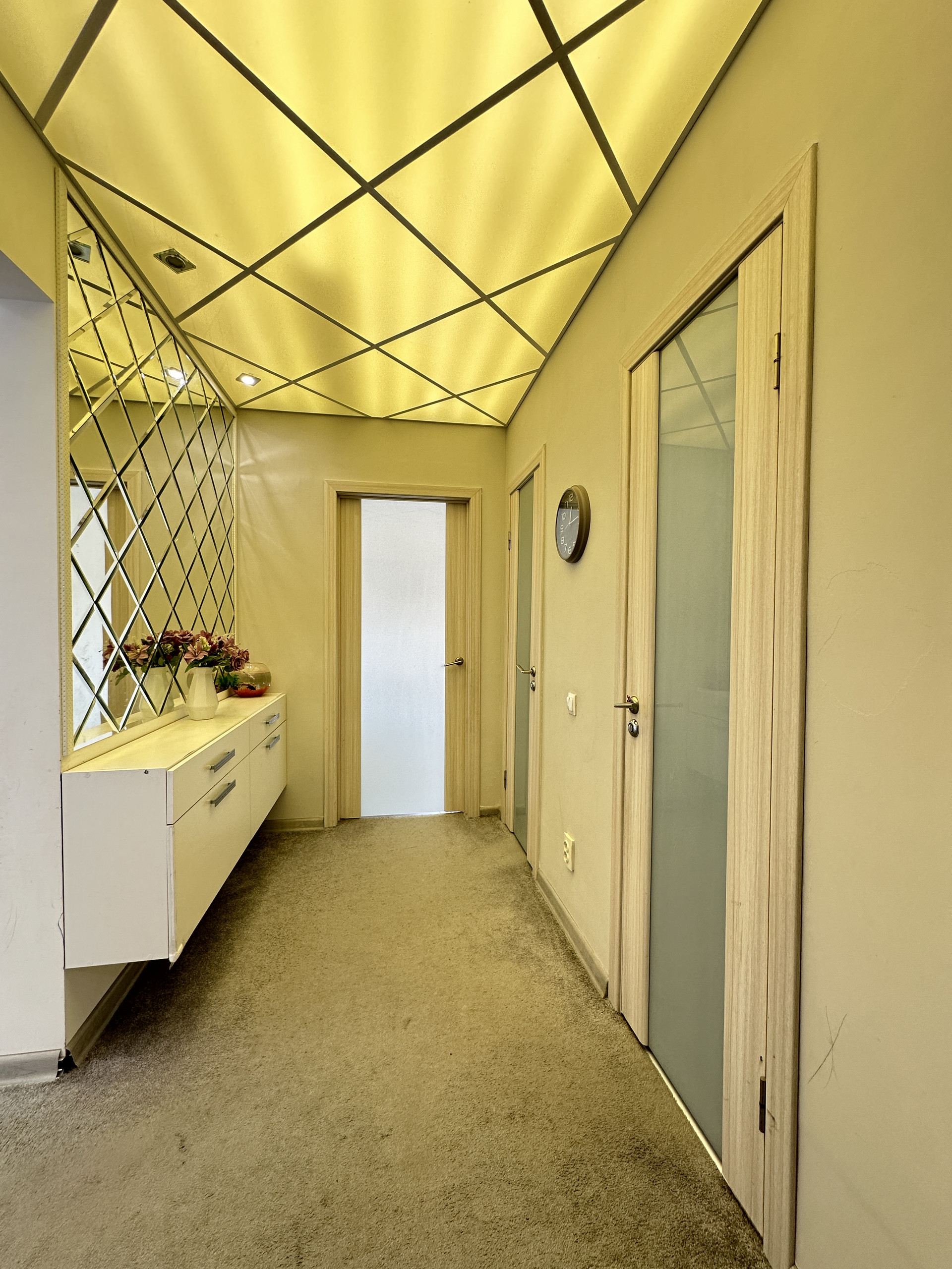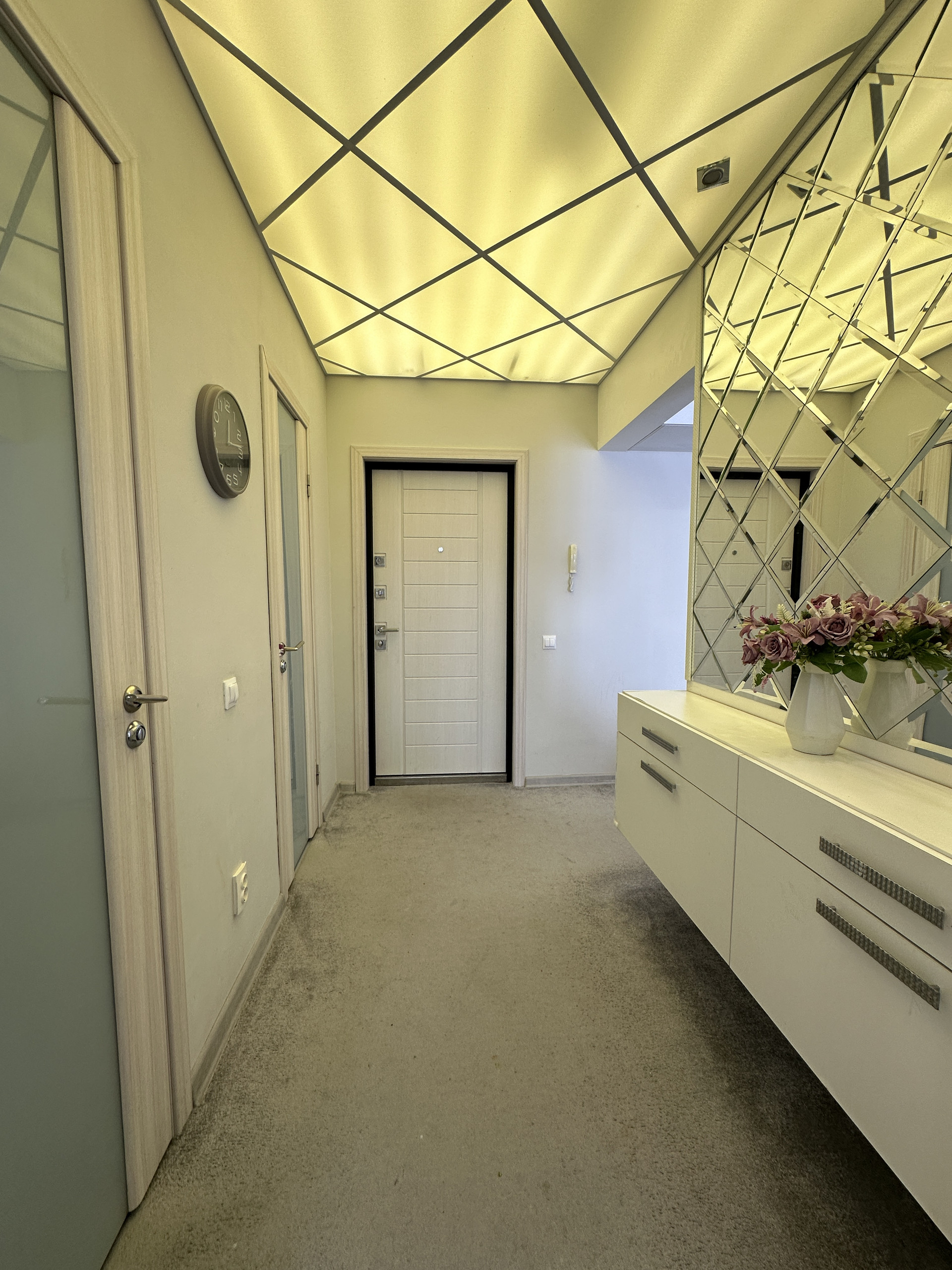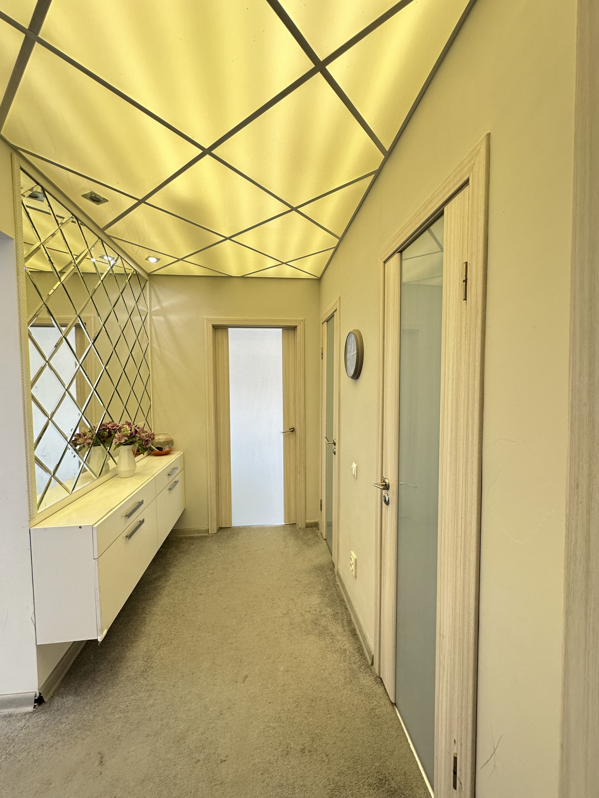 Далее внутри. В прихожей огромное стильное зеркало с местами хранения и обувницей. Потолок из акрилового стекла с диодной подсветкой. На полу керамогранит дублированный ковролином.