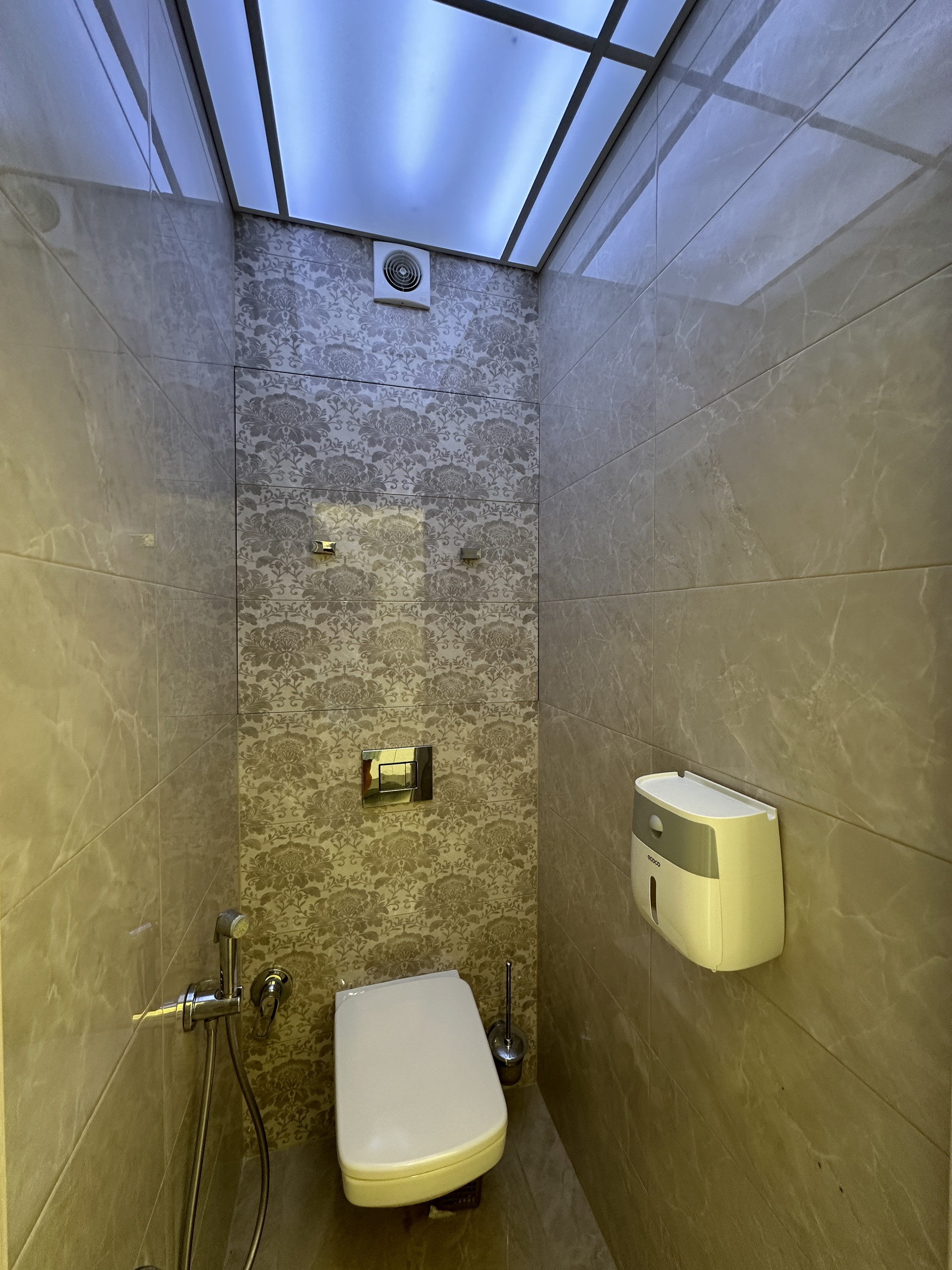 Туалет с инсталяцией и гигиеническим душем. Огромный скрытый шкаф с счетчиками и фильтрами. Потолок и плитка в стиль ванны.
