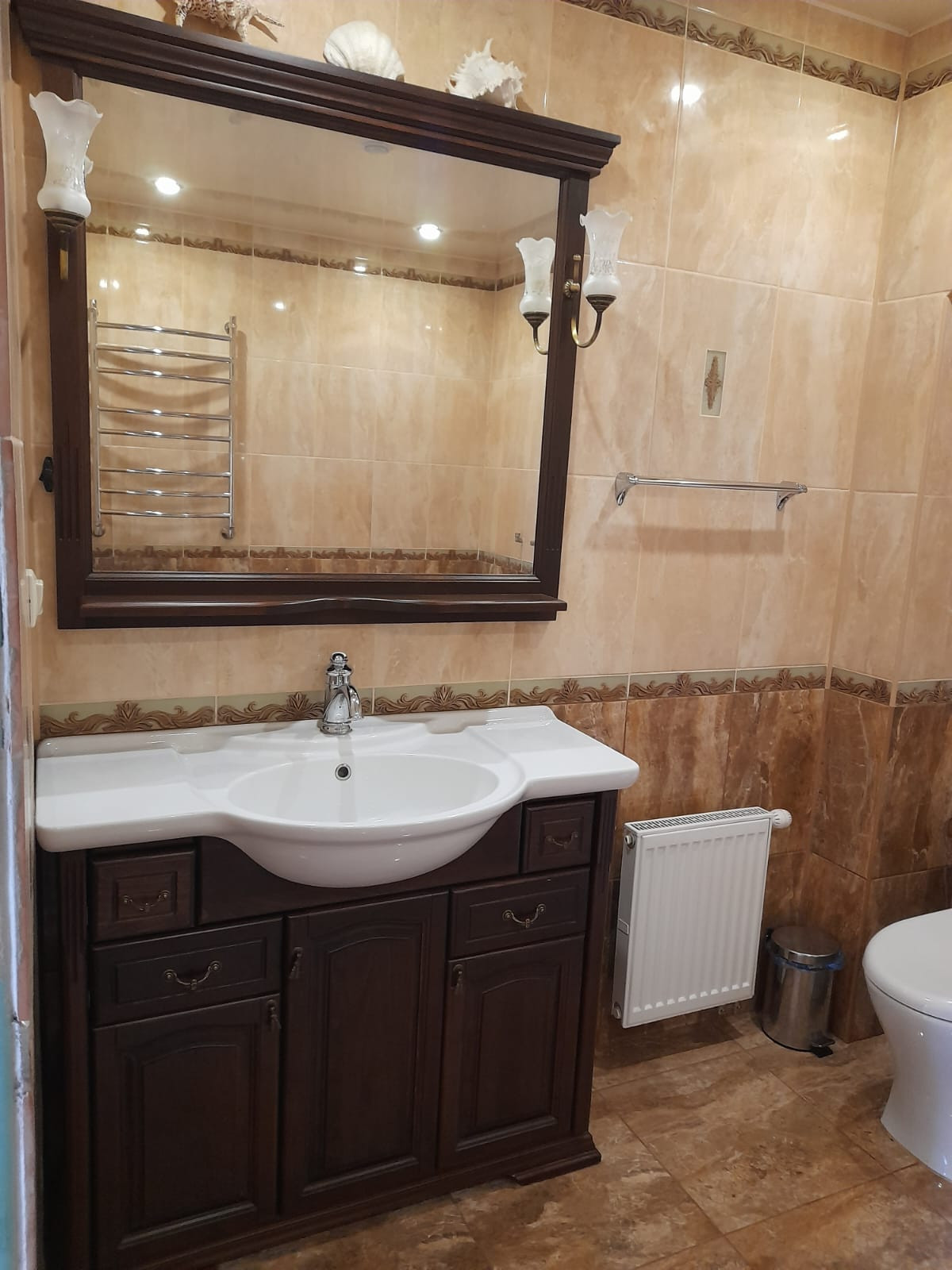 Дом: из пенобетонных блоков, утеплен,  оштукатурен и покрашен. Все помещения с отделкой: полы на первом этаже-плитка с электрическим подогревом, на втором-паркетная доска, стены-штукатурка, обои, покраска, на окнах стеклопакеты.