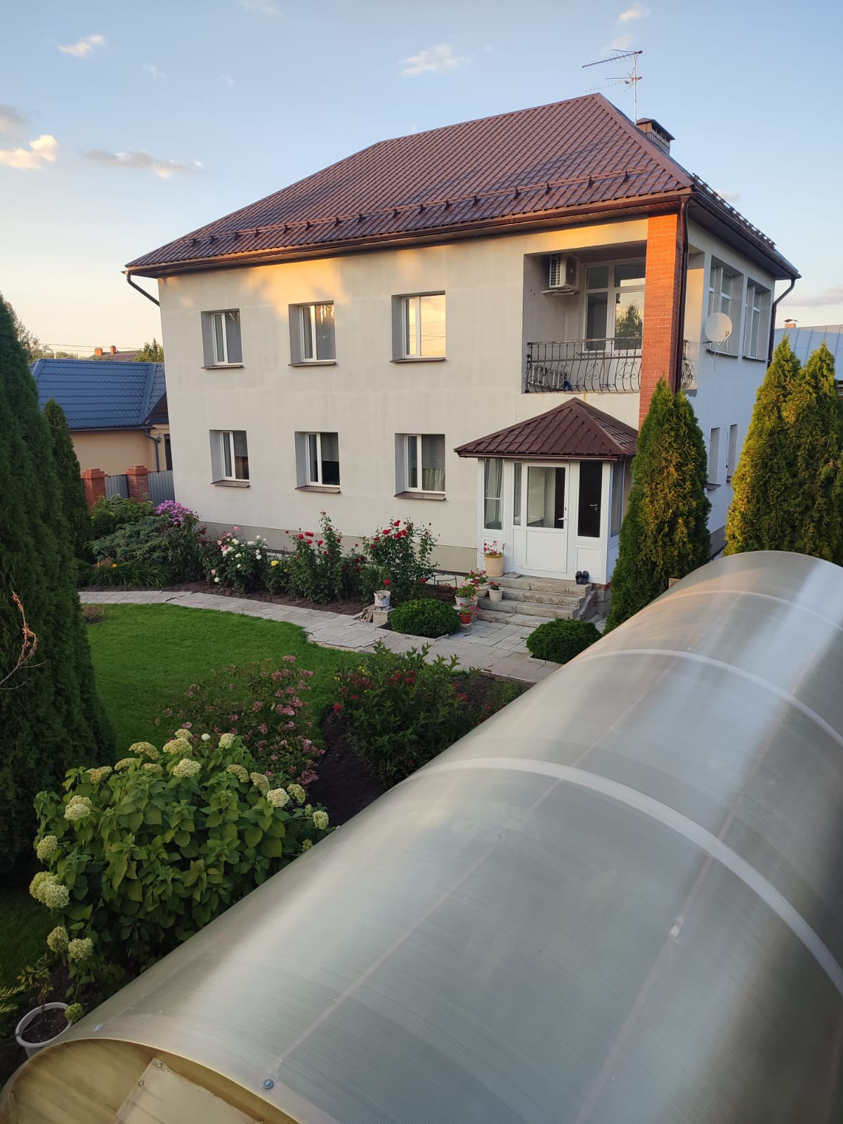 ДОМ: 172,6 кв.м, 2 этажа. Высота потолков- 2,8 м, 3 спальни , гардеробная, зал, кухня- столовая , на втором этаже отдельный санузел и выход на открытый балкон. всего 2 санузла, технические комнаты, кладовые, погреб, балкон, терраса.