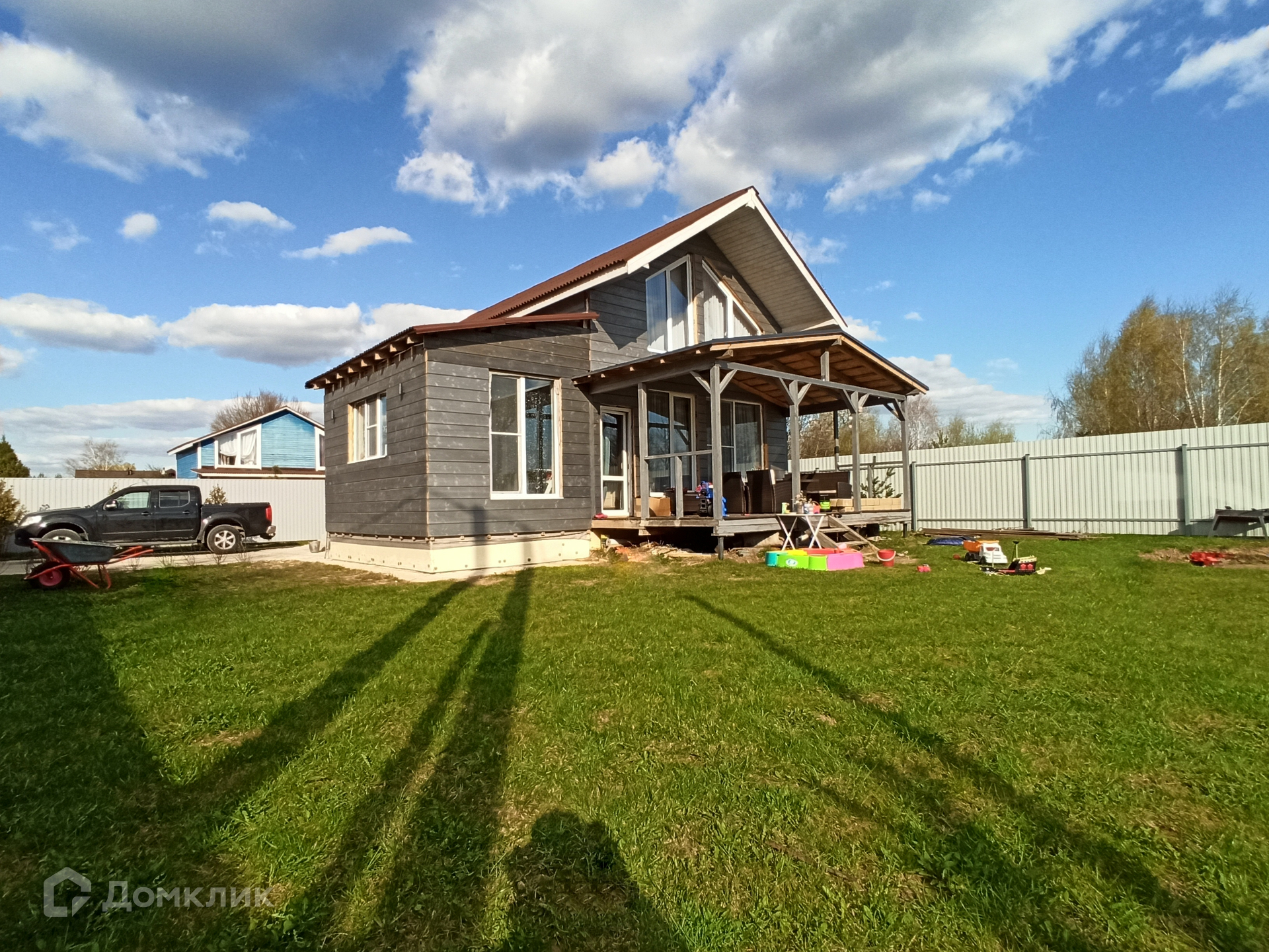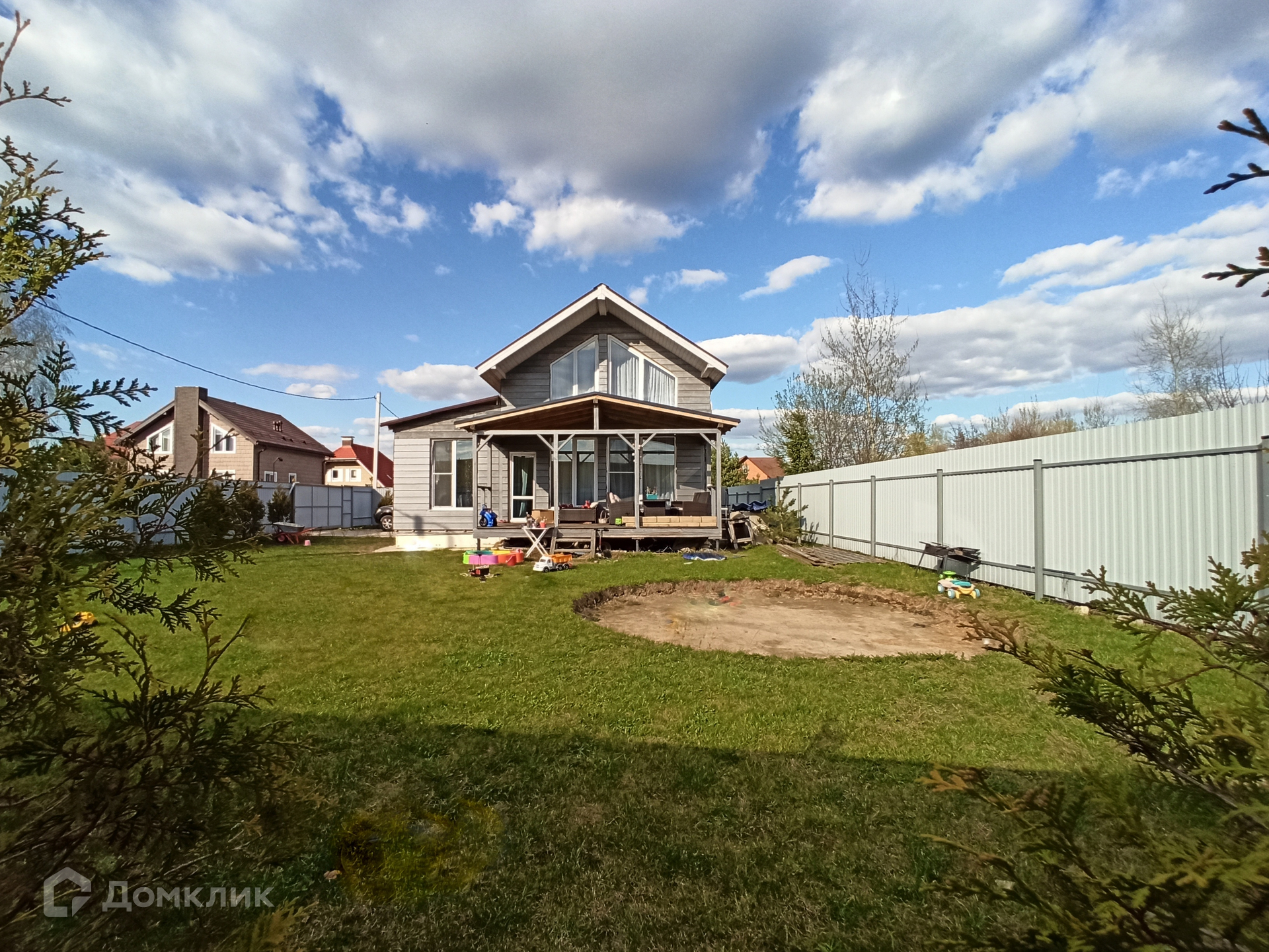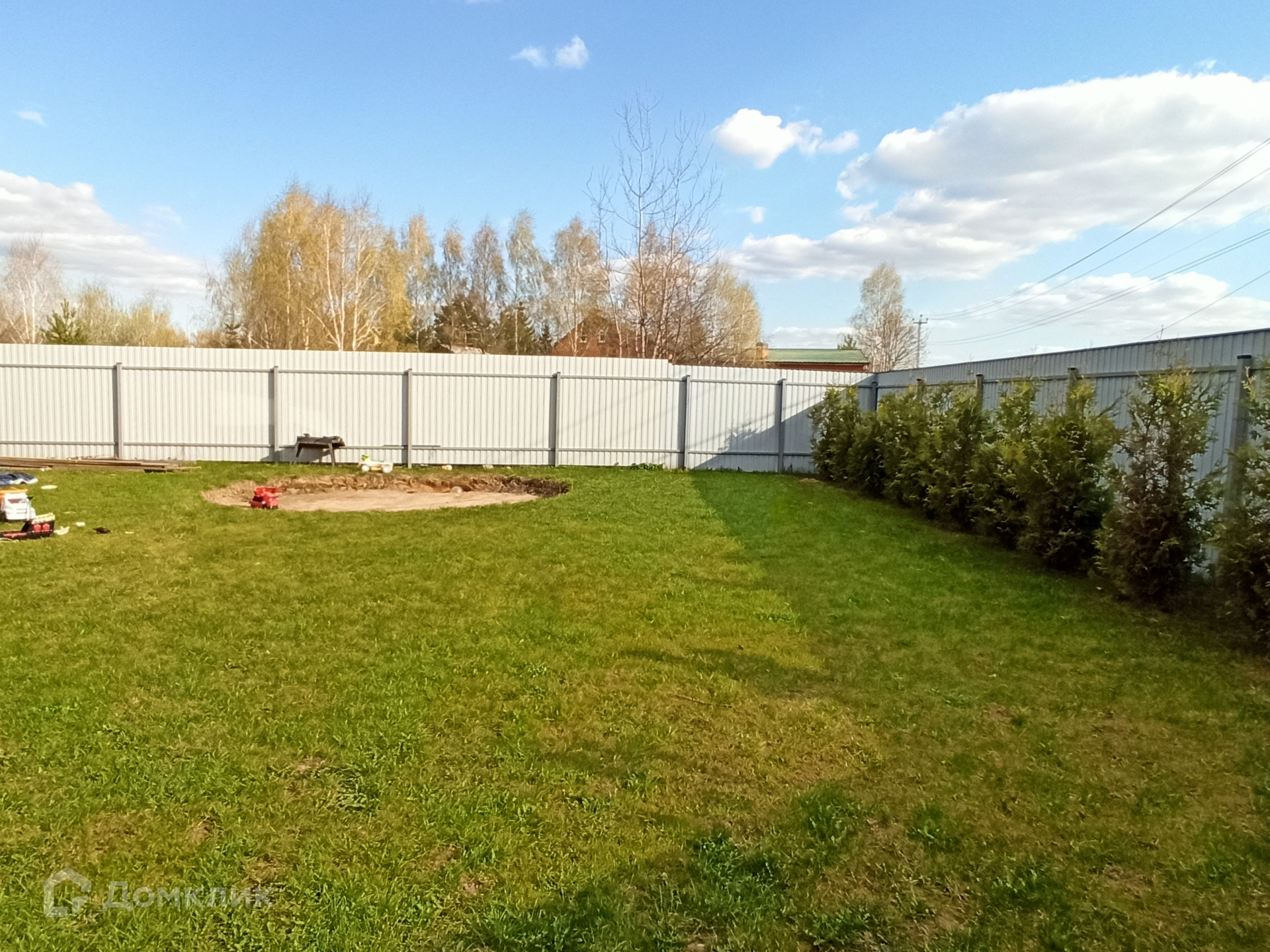 На участке подготовлена площадка под бассейн, сделана парковка на два автомобиля, высажен газон, по периметру участка - туи. Соседи всего с двух сторон. Тихая, не проездная улица. Въезд на участок оборудован автоматическими воротами.