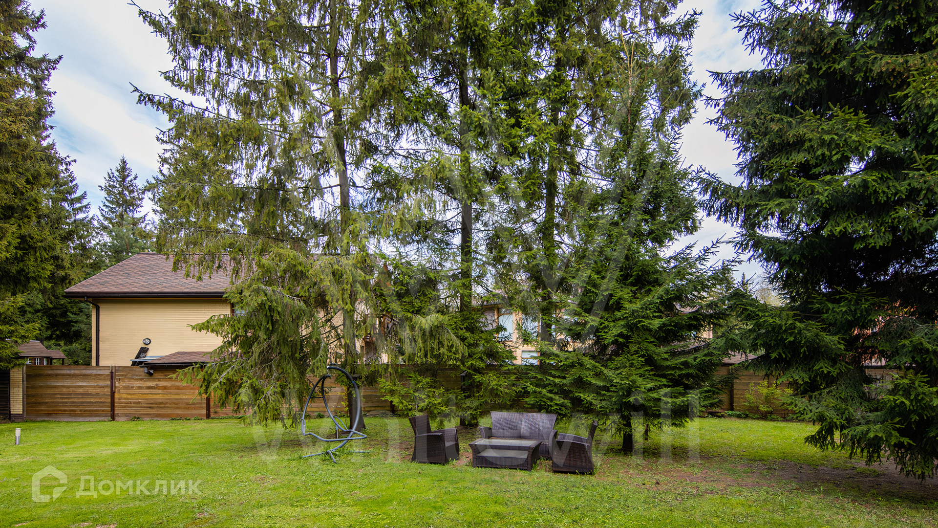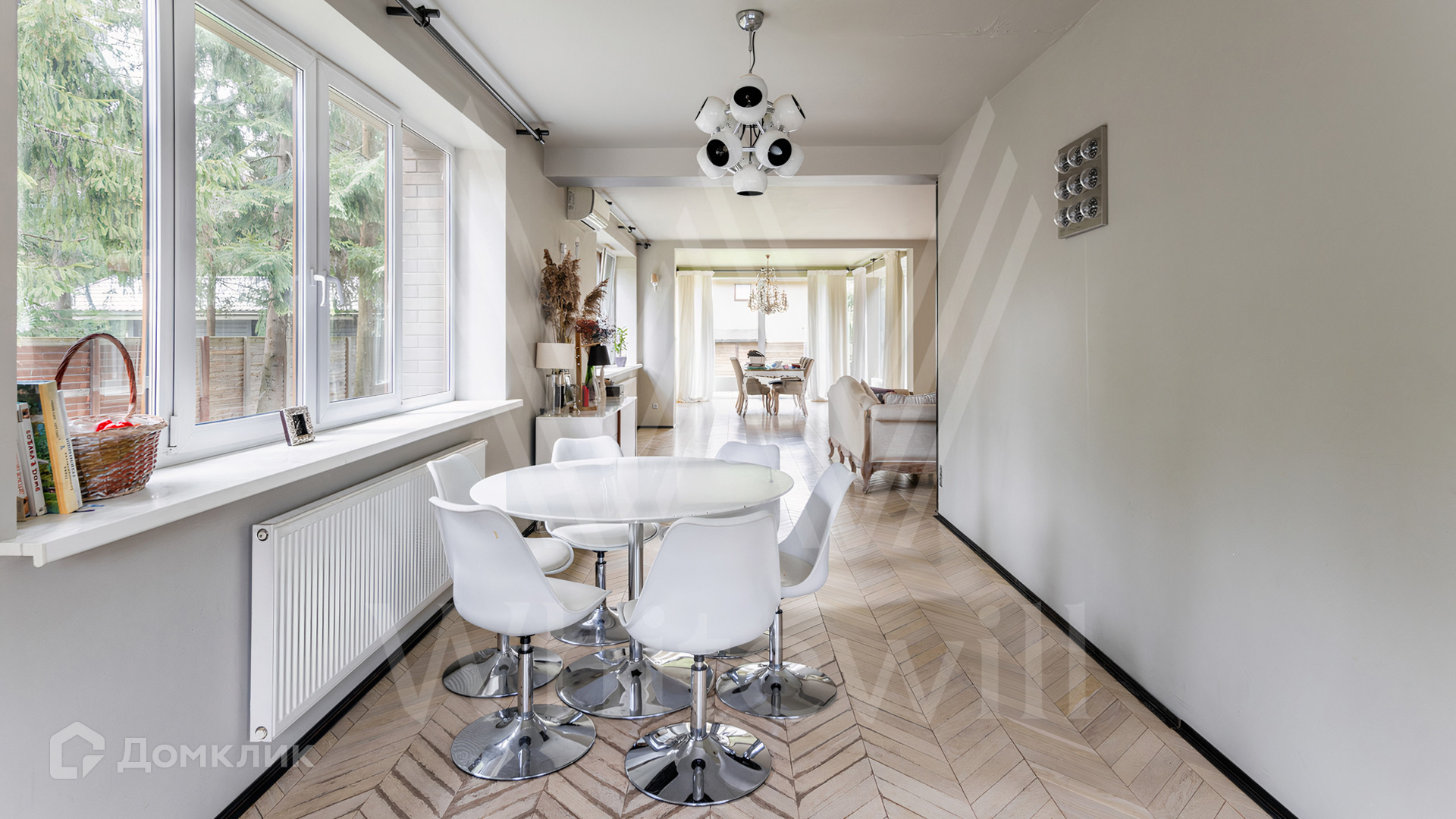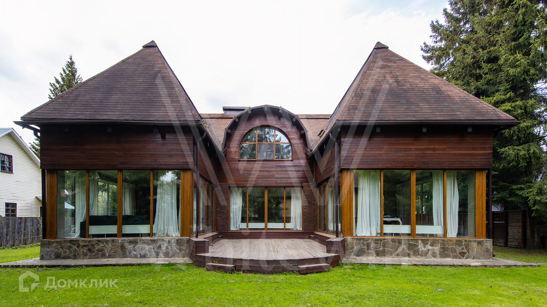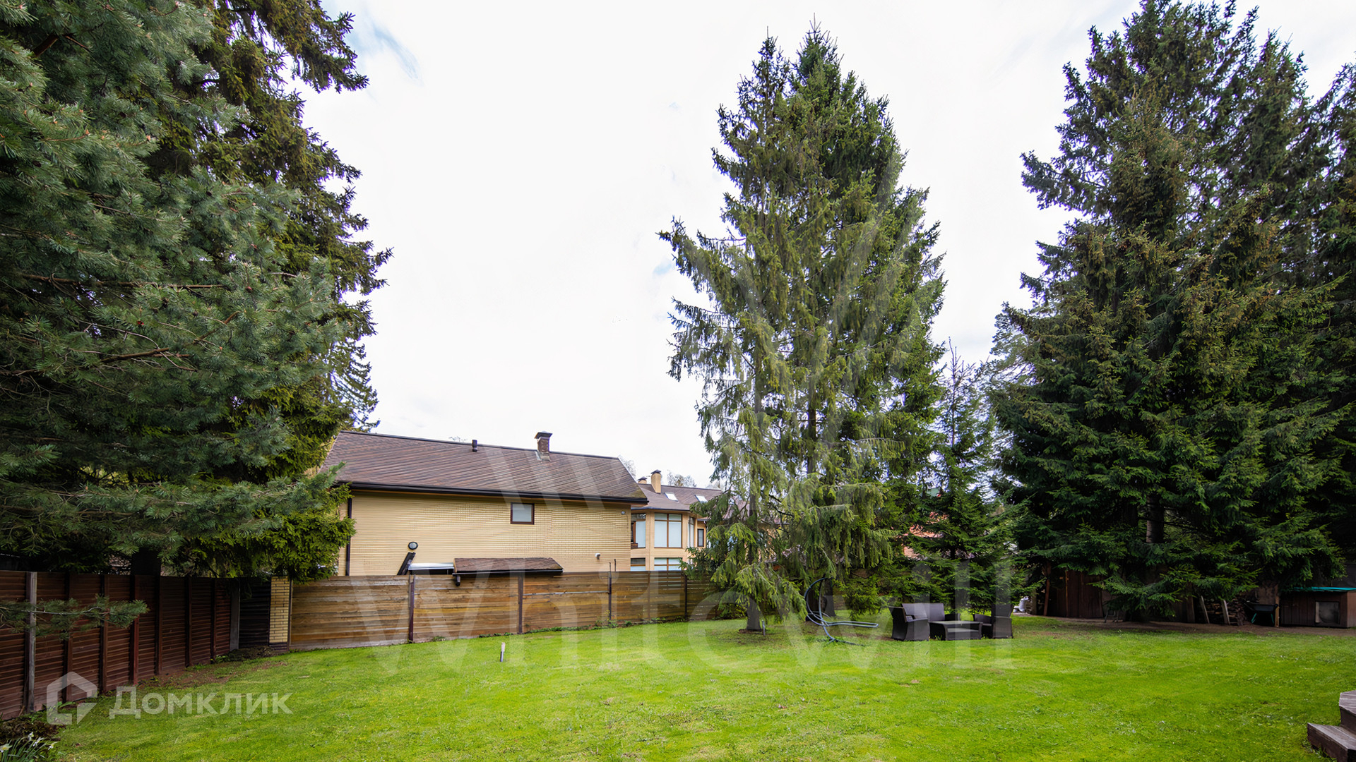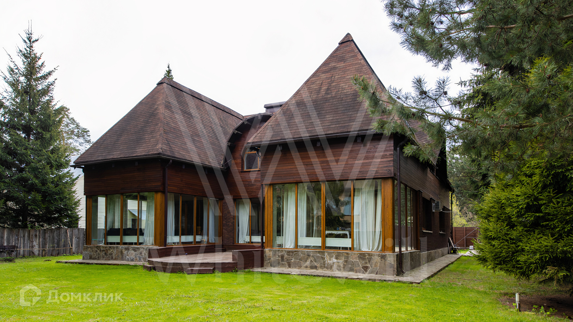 ID 12 545. Малые Вяземы. Загородный дом площадью 450 м² построен на просторном полевом участке 20 соток с многолетними хвойными деревьями. Фасад современного здания выполнен из дерева и декорирован камнем. Благодаря панорамному остеклению, высоким потолкам и светлым тонам в отделке пространство наполнено воздухом. Дом полностью меблирован и укомплектован бытовой техникой. Планировка резиденции включает 4 спальни и кухню-столовую-гостиную с дровяным камином. На участке с газоном можно обустроить зону барбекю.