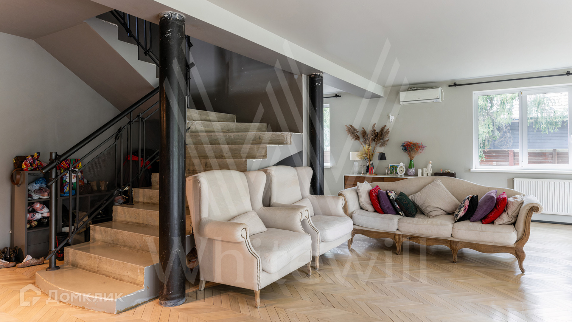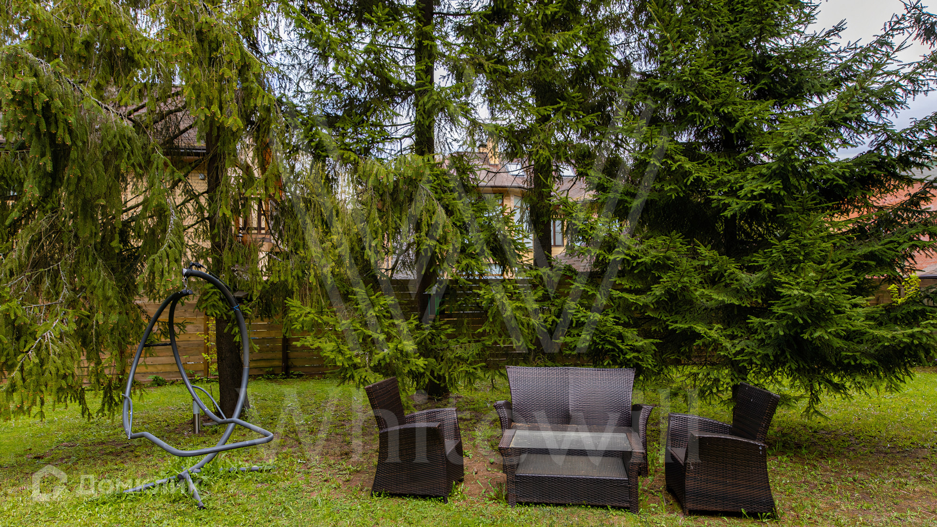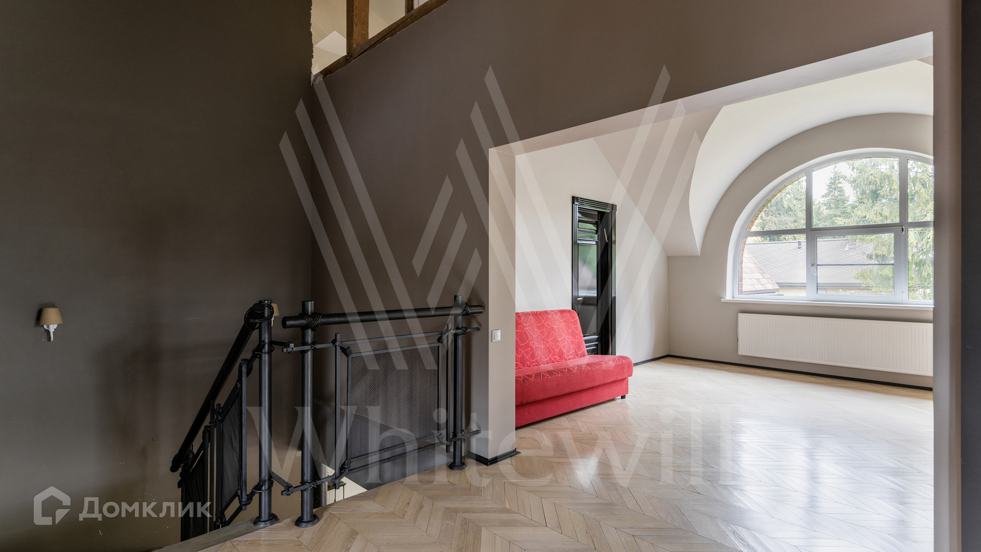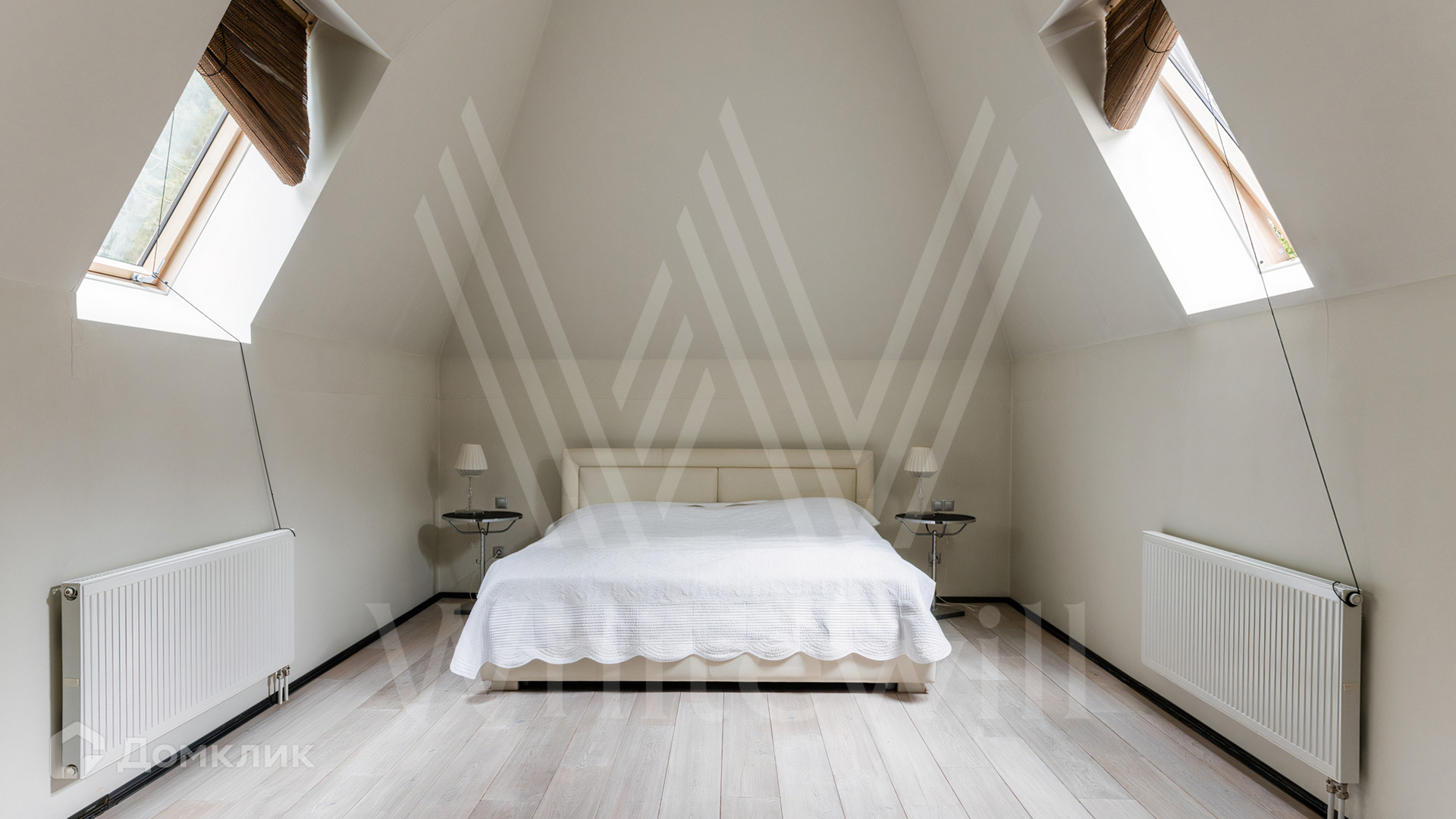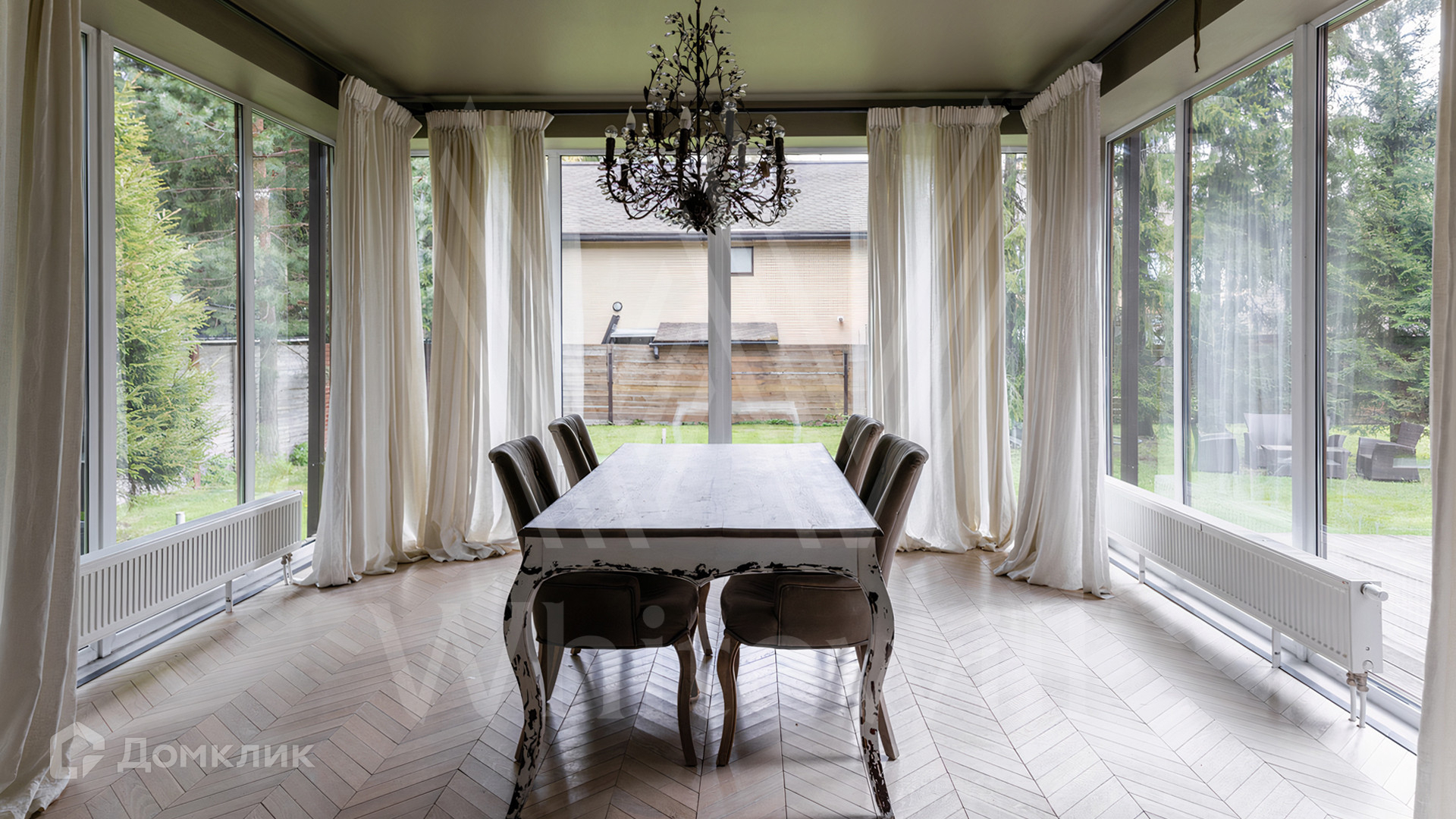 ID 12 545. Малые Вяземы. Загородный дом площадью 450 м² построен на просторном полевом участке 20 соток с многолетними хвойными деревьями. Фасад современного здания выполнен из дерева и декорирован камнем. Благодаря панорамному остеклению, высоким потолкам и светлым тонам в отделке пространство наполнено воздухом. Дом полностью меблирован и укомплектован бытовой техникой. Планировка резиденции включает 4 спальни и кухню-столовую-гостиную с дровяным камином. На участке с газоном можно обустроить зону барбекю.