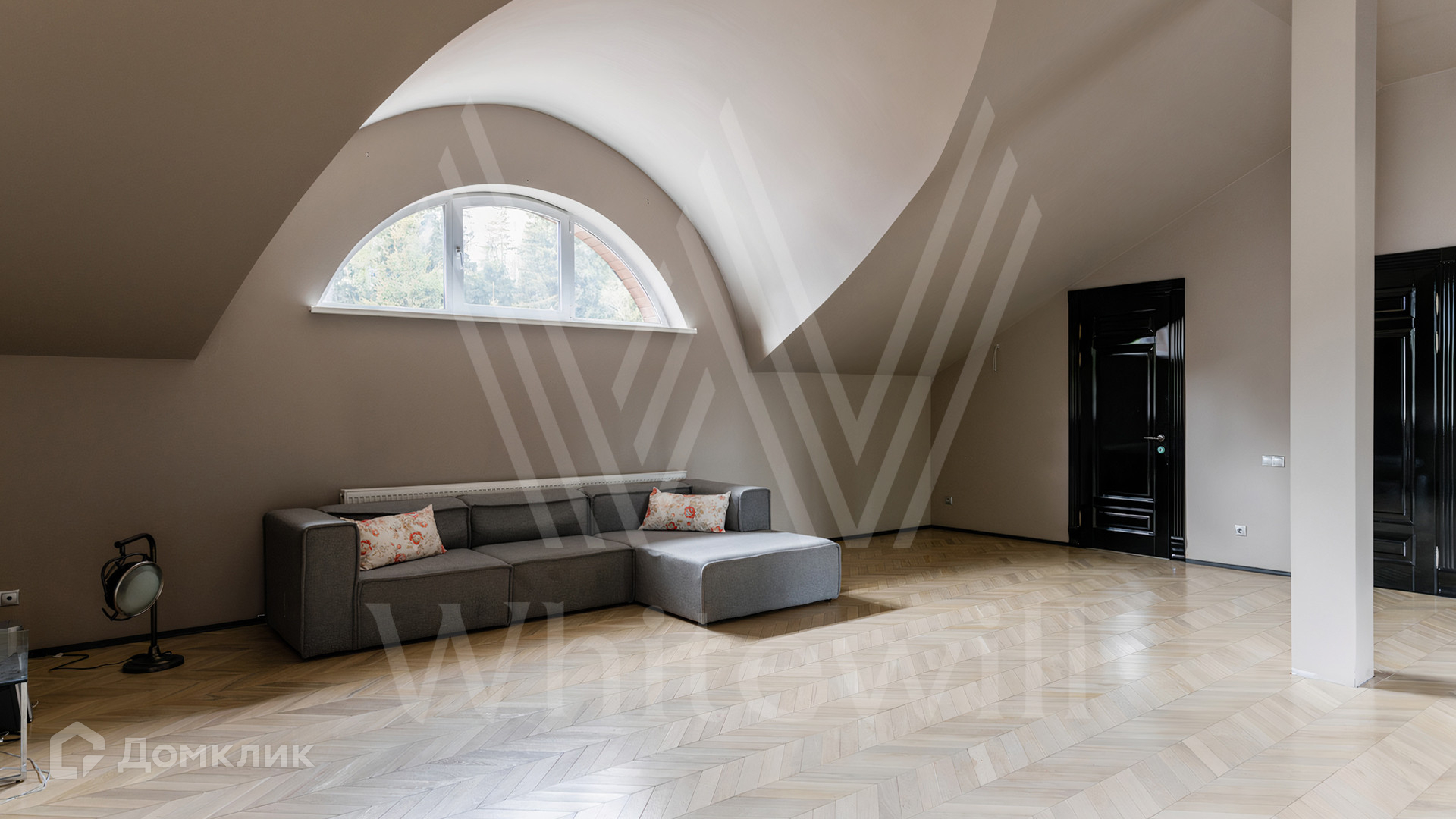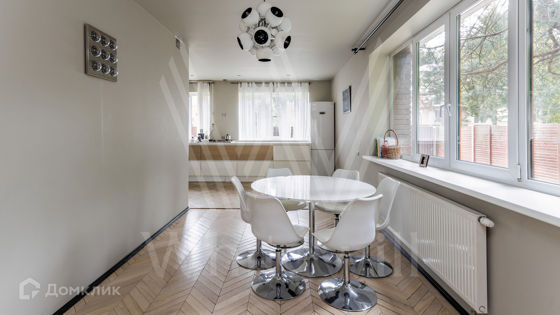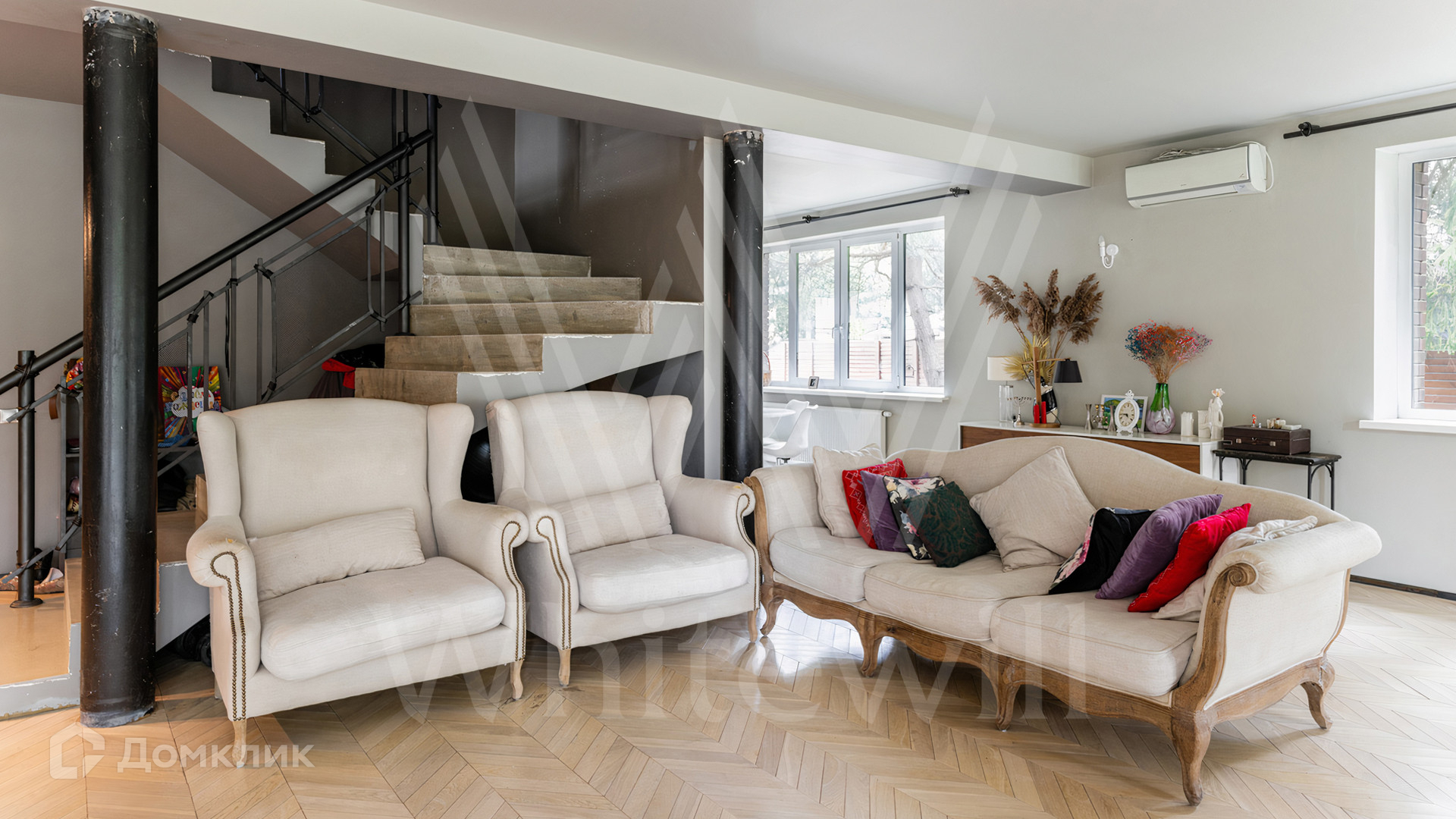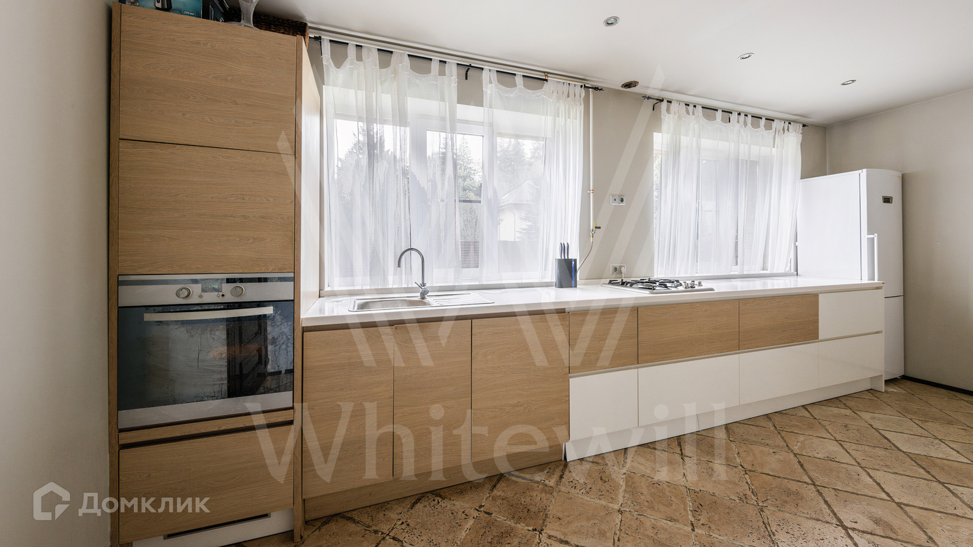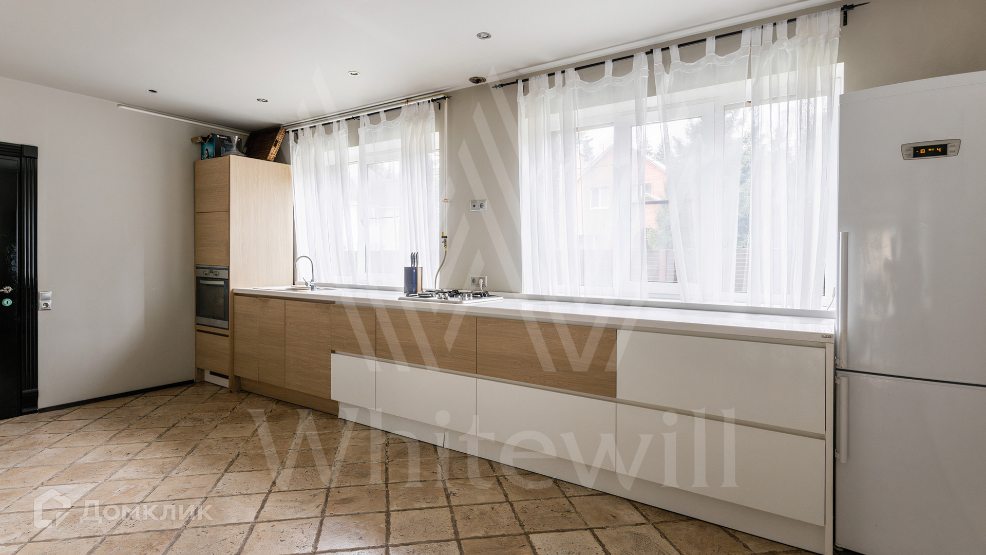 ID 12 545. Малые Вяземы. Загородный дом площадью 450 м² построен на просторном полевом участке 20 соток с многолетними хвойными деревьями. Фасад современного здания выполнен из дерева и декорирован камнем. Благодаря панорамному остеклению, высоким потолкам и светлым тонам в отделке пространство наполнено воздухом. Дом полностью меблирован и укомплектован бытовой техникой. Планировка резиденции включает 4 спальни и кухню-столовую-гостиную с дровяным камином. На участке с газоном можно обустроить зону барбекю.