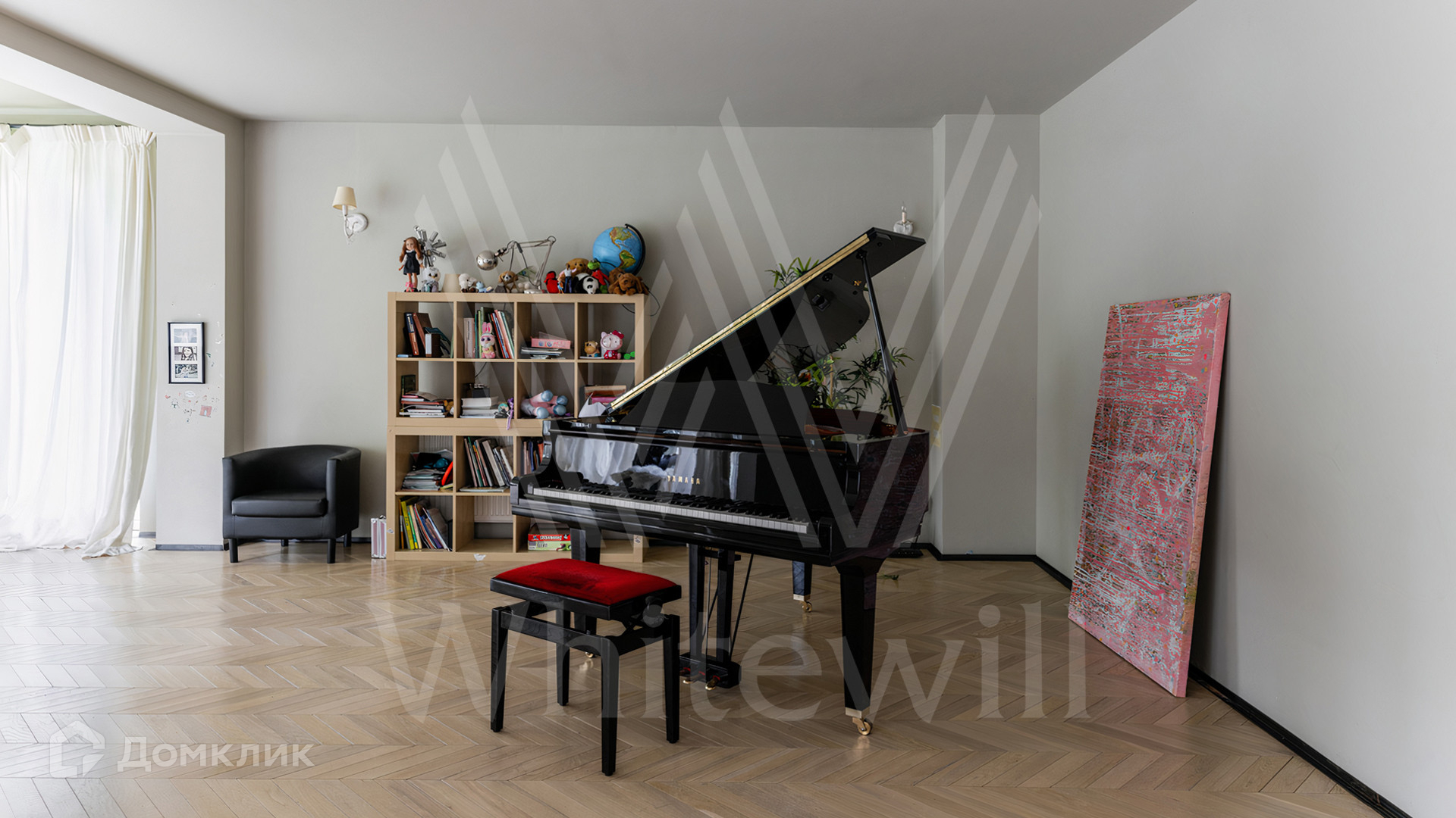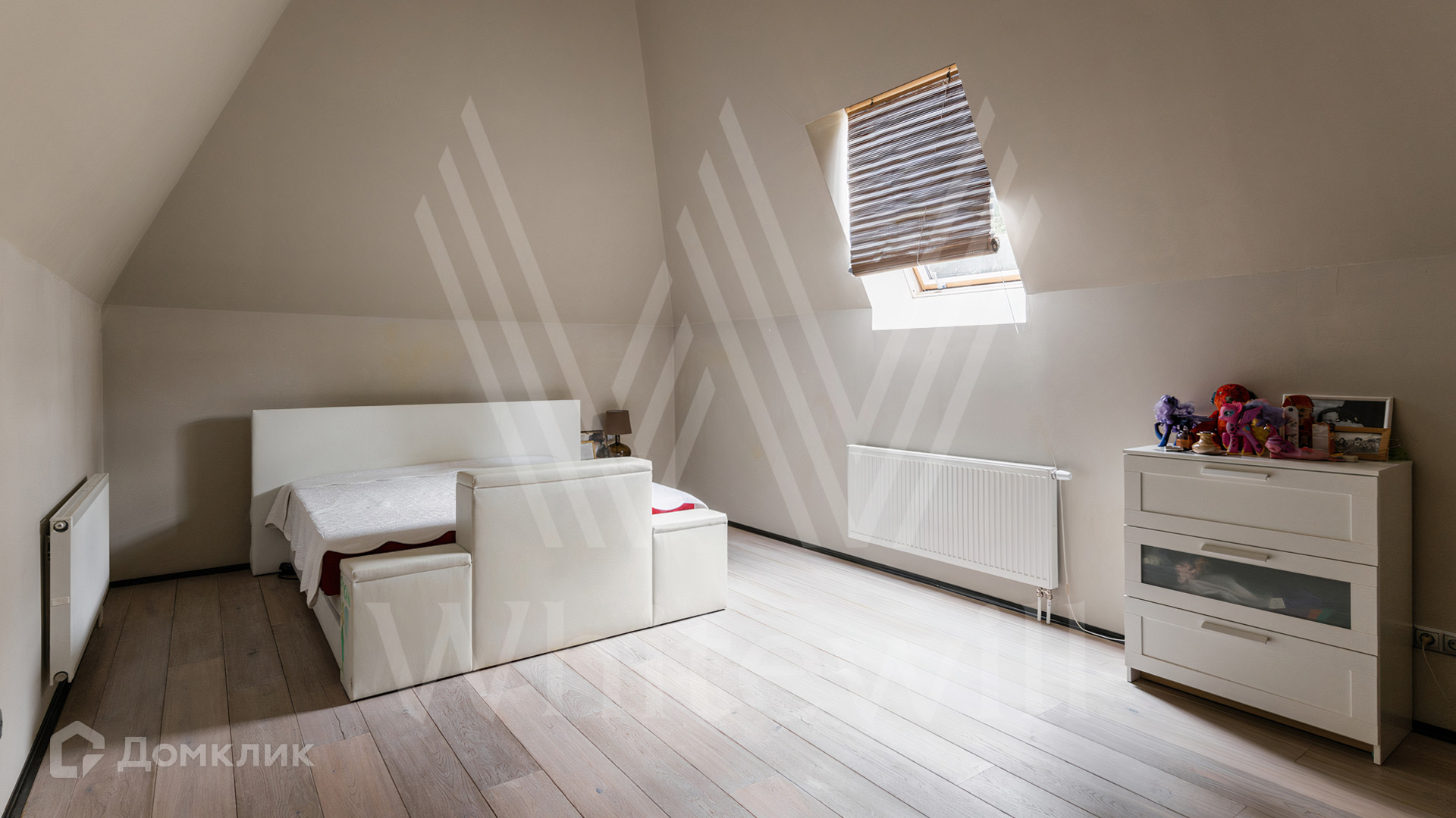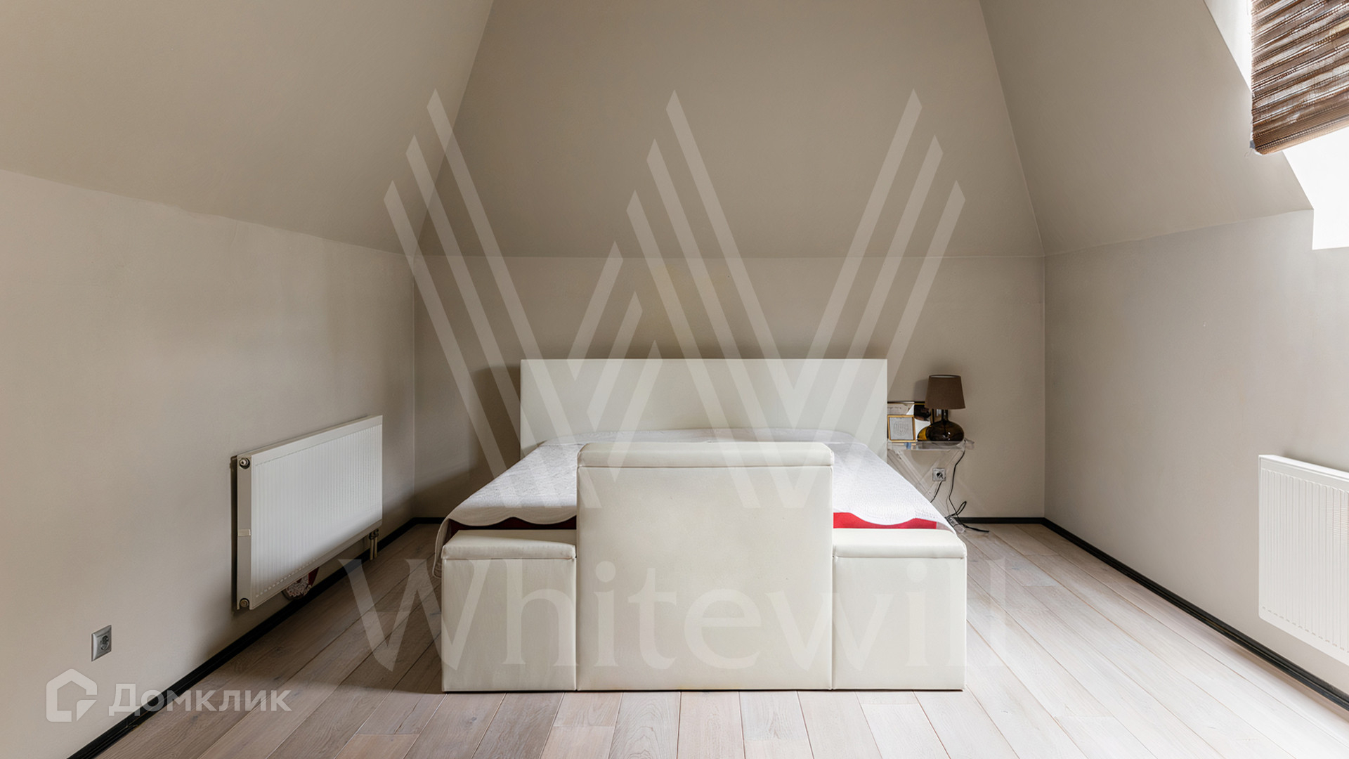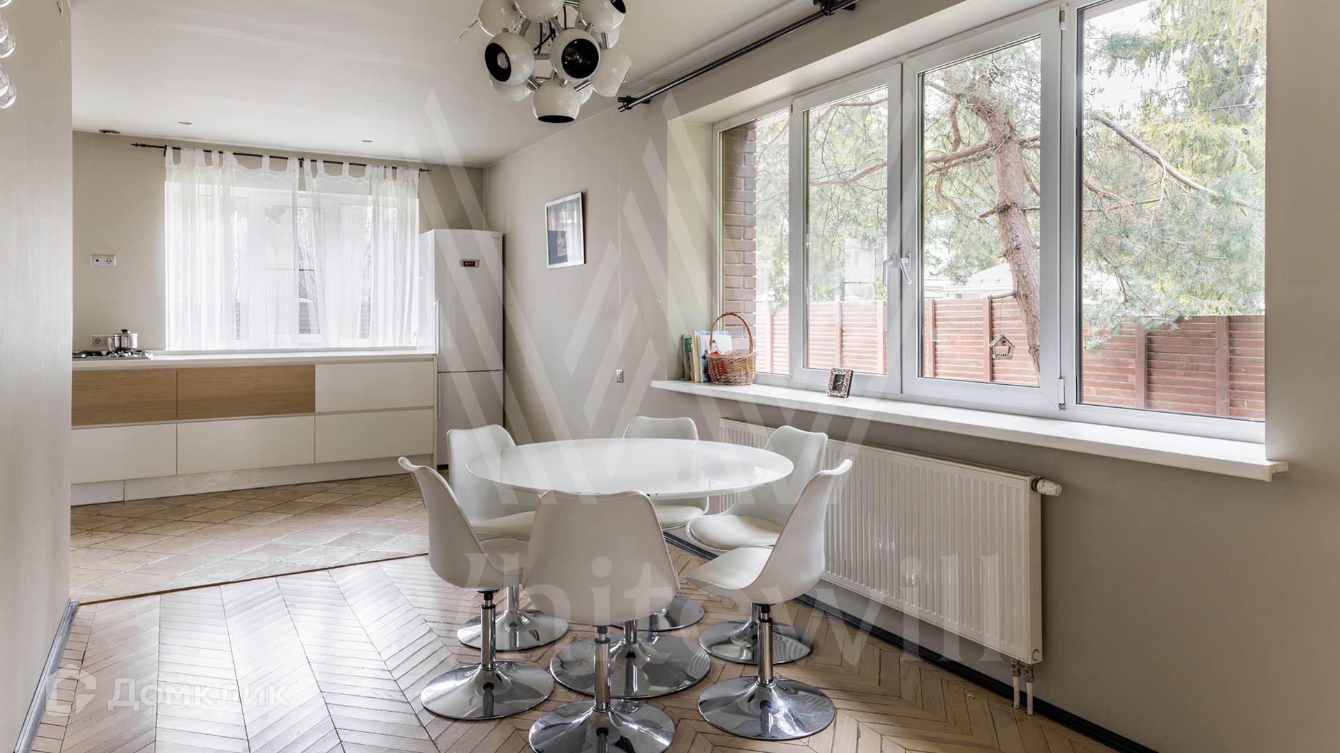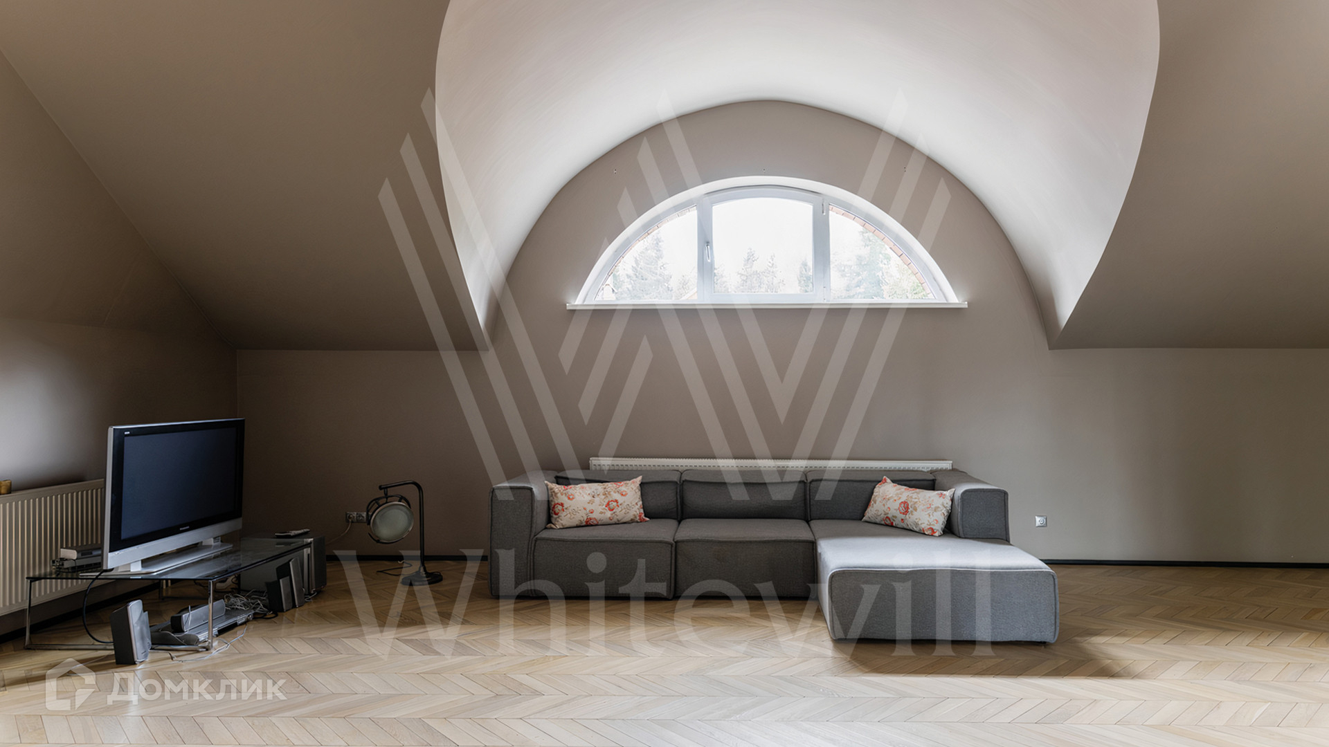 ID 12 545. Малые Вяземы. Загородный дом площадью 450 м² построен на просторном полевом участке 20 соток с многолетними хвойными деревьями. Фасад современного здания выполнен из дерева и декорирован камнем. Благодаря панорамному остеклению, высоким потолкам и светлым тонам в отделке пространство наполнено воздухом. Дом полностью меблирован и укомплектован бытовой техникой. Планировка резиденции включает 4 спальни и кухню-столовую-гостиную с дровяным камином. На участке с газоном можно обустроить зону барбекю.
