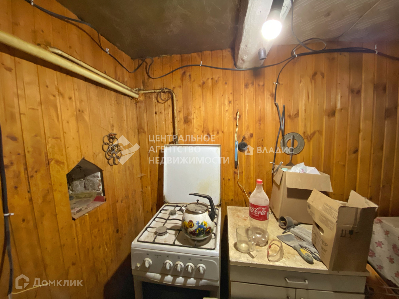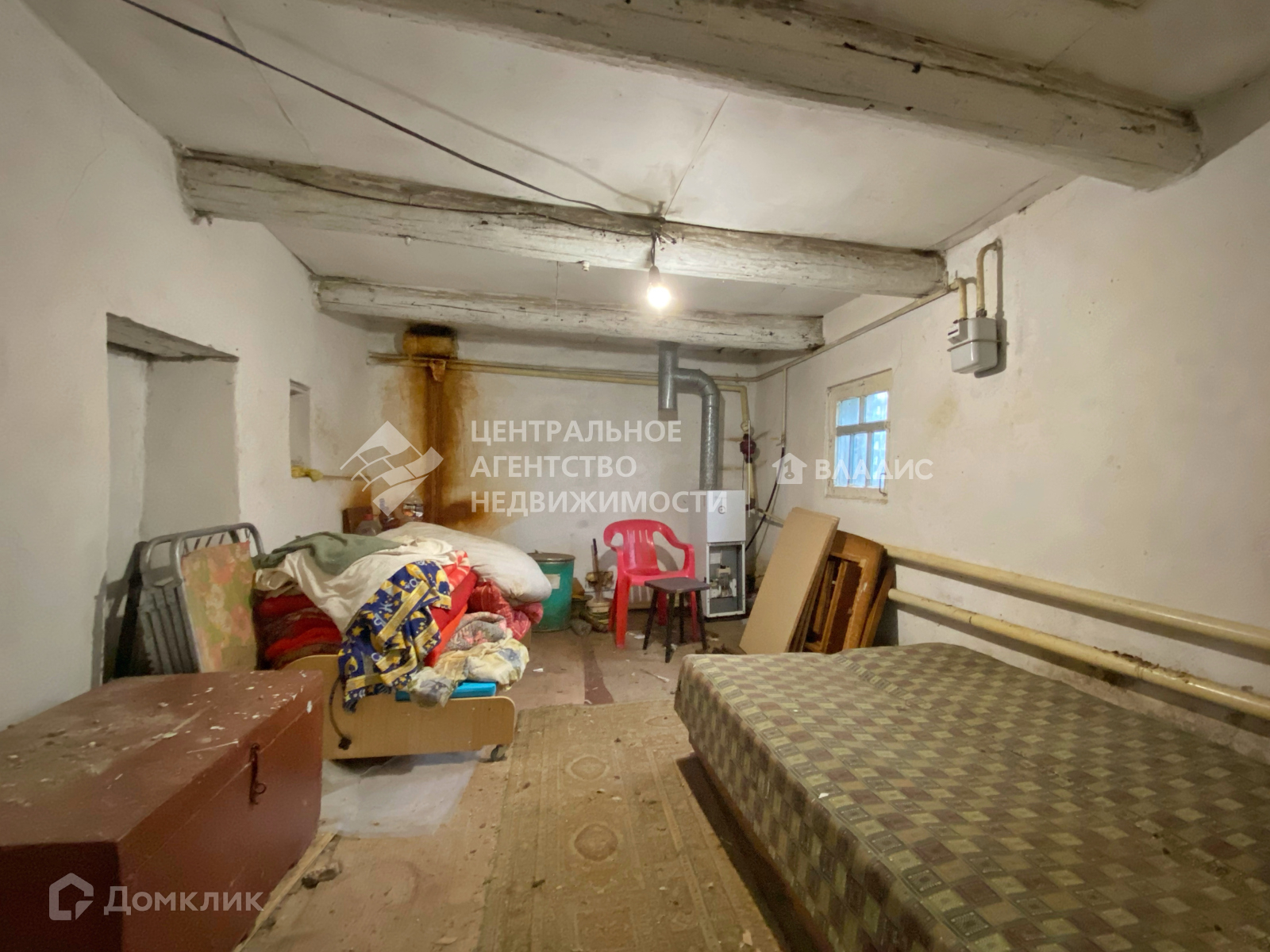 Дом засыпной с металлической крышей. Раньше отапливался печкой, сейчас она демонтирована, заведён газ и установлен АОГВ. Также в доме есть электричество (новая проводка), скважина (в подполе).