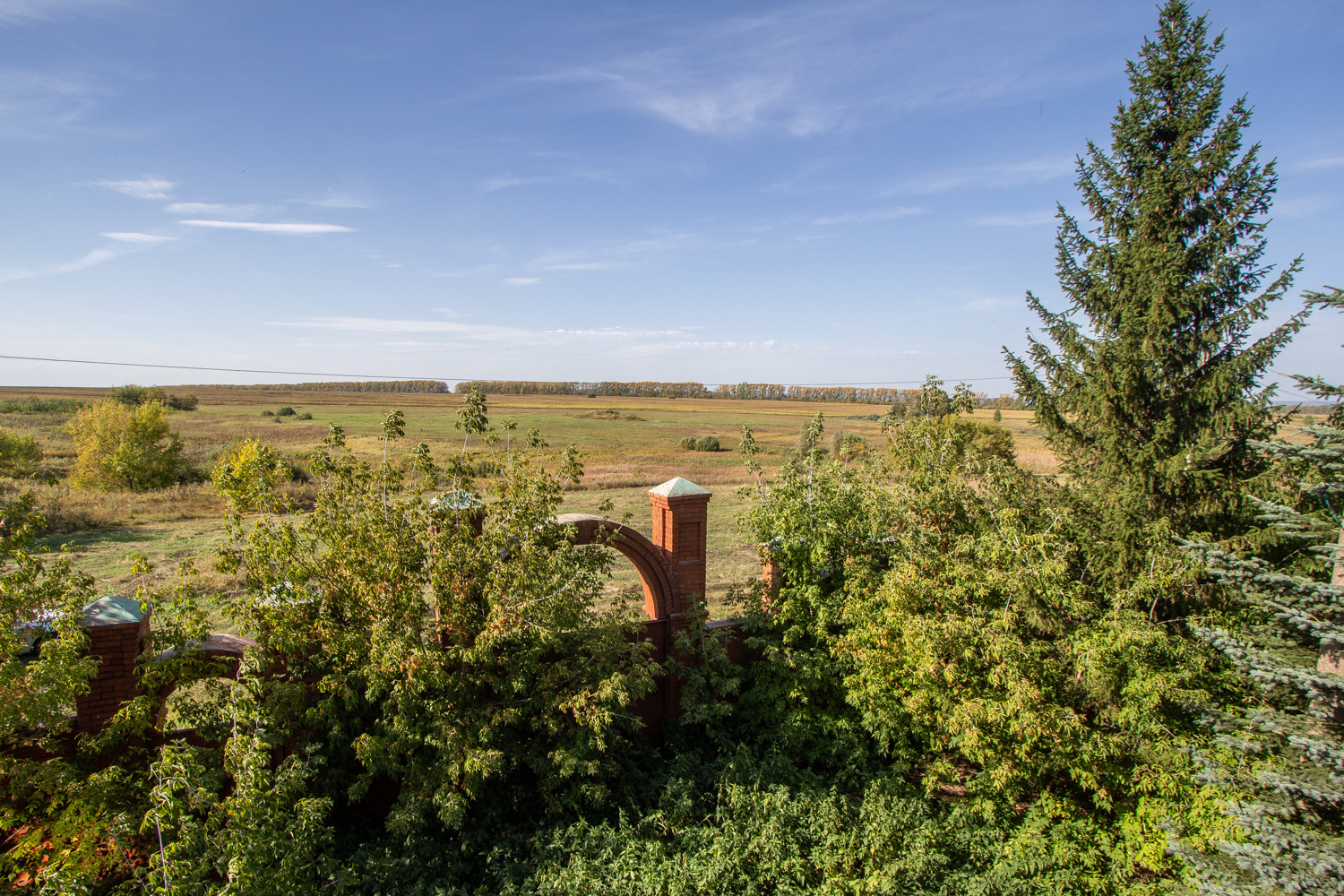 Часть участка засеяна газоном, есть цветочки и плодово-ягодные деревья, кустарники. Участок ровный, правильной формы.